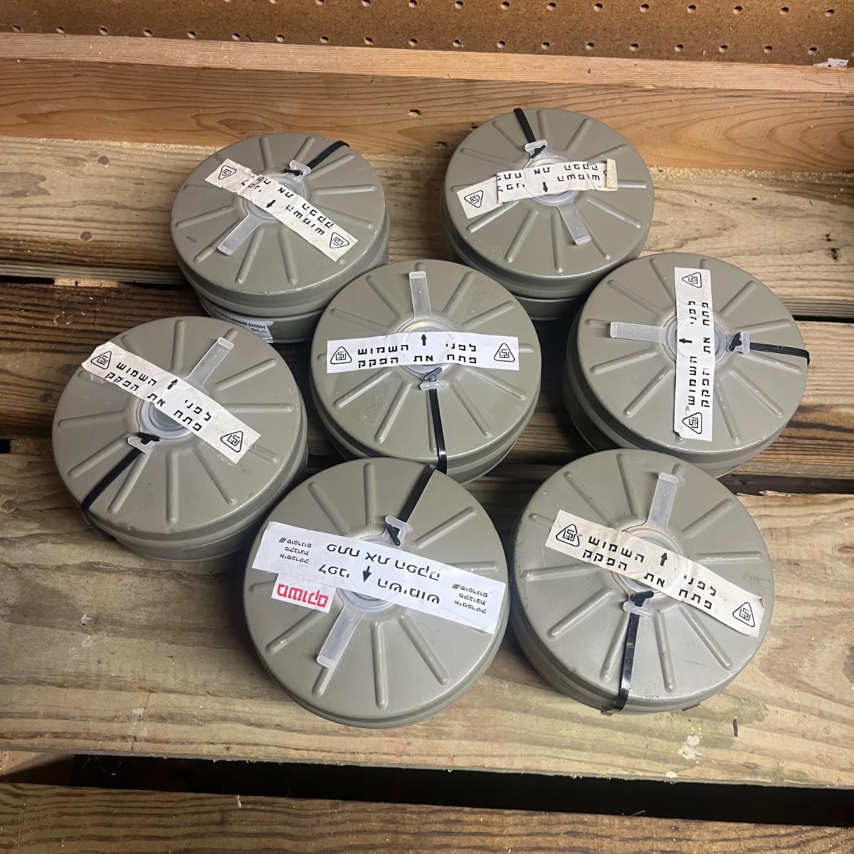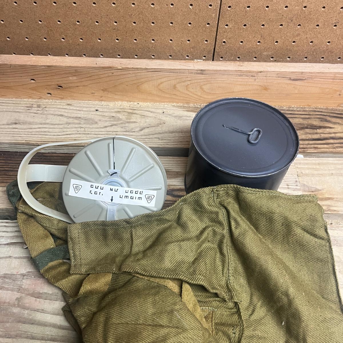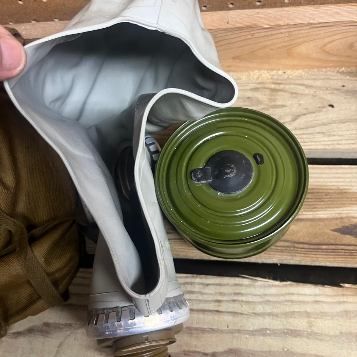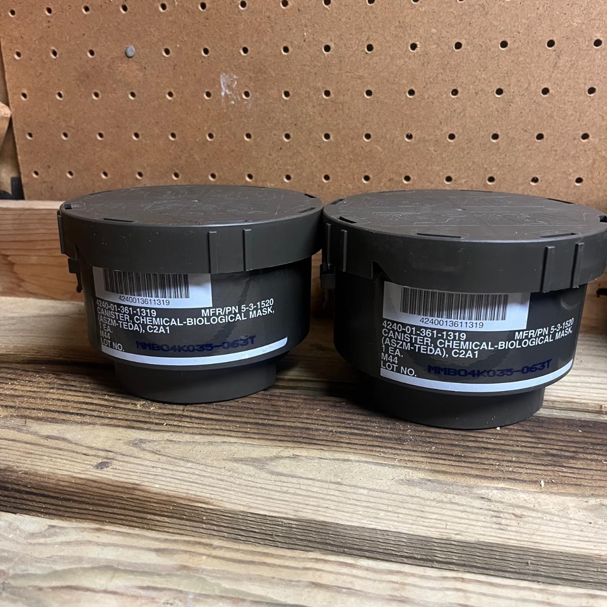 Lot includes four gas masks, over 10 canisters and a few carrying bags.