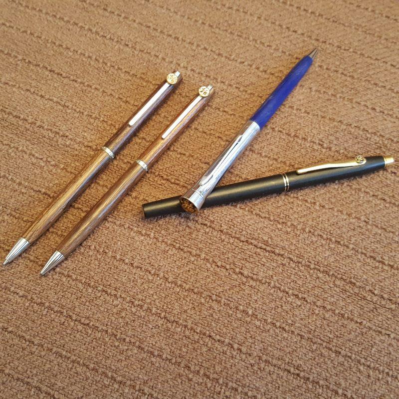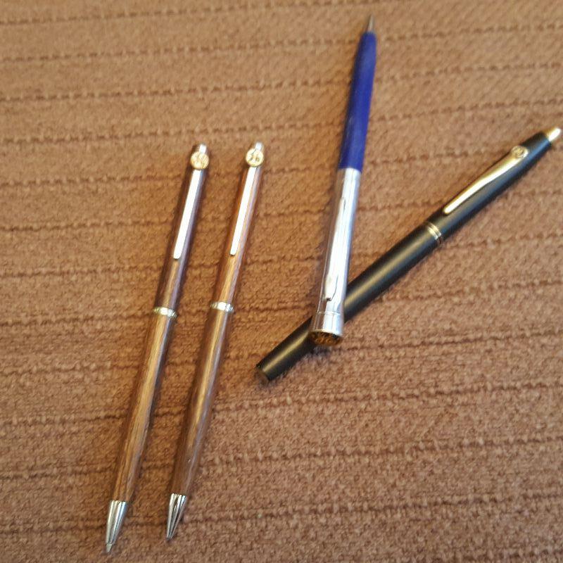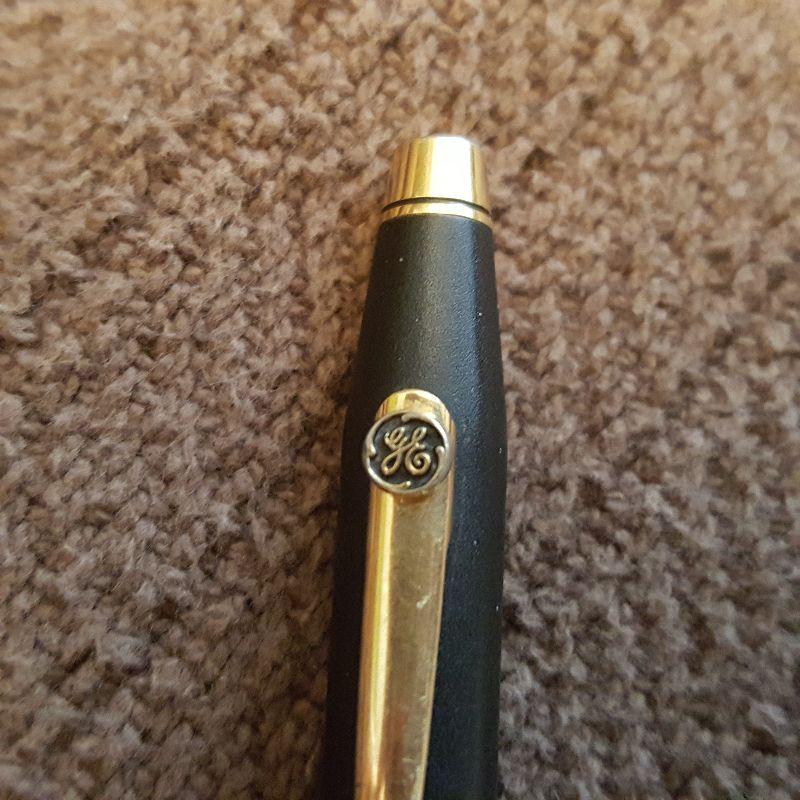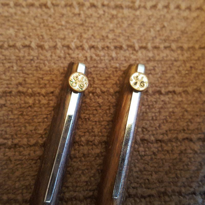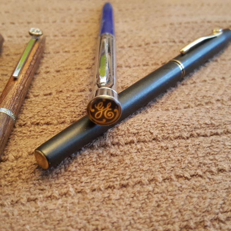 This auction lot is for a collection of 4 General Electric - GE Pens with Monogram Emblems. The two that look like wood are marked Hallmark - as in the greeting card company - the pen writes there is no lead in the pencil. The blue pen with the GE on the end is marked 'Garland" and it writes. The black pen sports no manufacturer's name but does write.