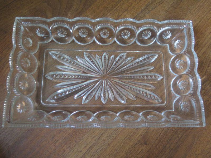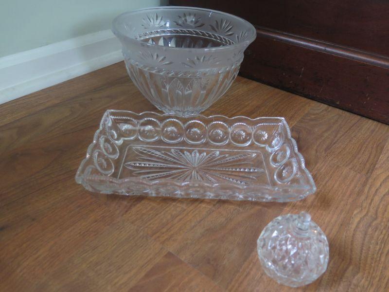 Collection of 3 pieces of glass. Rectangle is 11". Bowl is quite heavy. **Please read Terms and Conditions before placing a bid. Pick up is Sunday, September 1, 2019 from 10am to 4pm in Williamstown. All sales are final. All sales are as is, where is. Please review all photos. Any props included in photos are not included in listing. All measurements are approximate.