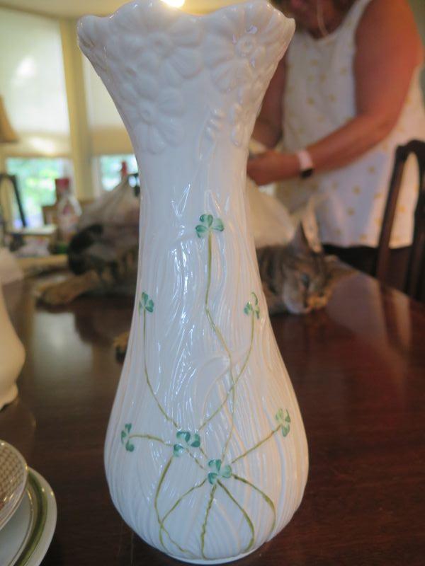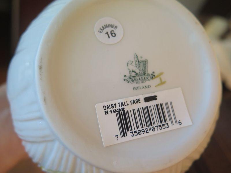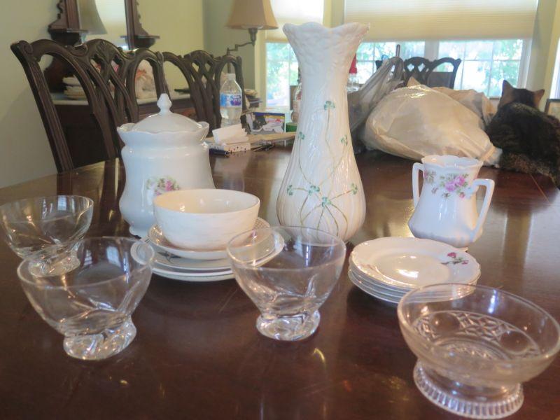 Collection of glass and china including Belleek Daisy vase 10.5" - **Please read Terms and Conditions before placing a bid. Pick up is Sunday, September 1, 2019 from 10am to 4pm in Williamstown. All sales are final. All sales are as is, where is. Please review all photos. Any props included in photos are not included in listing. All measurements are approximate.