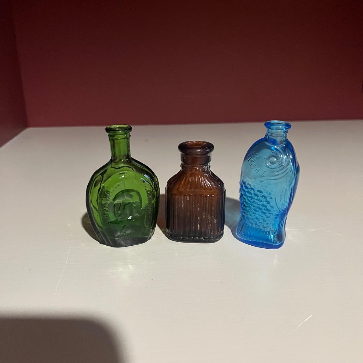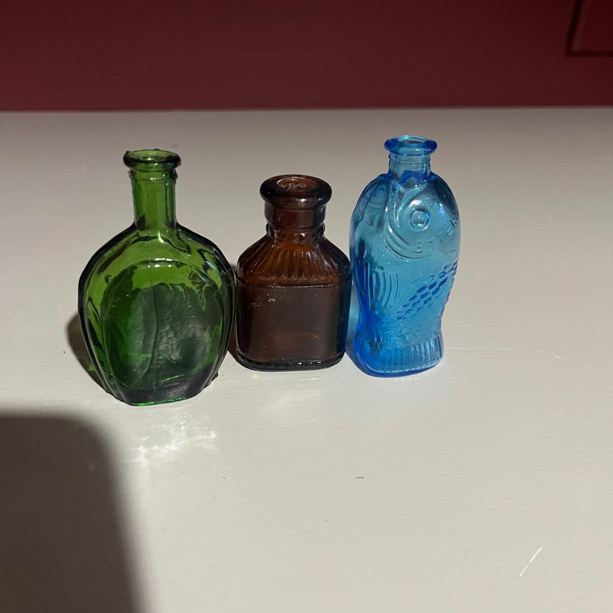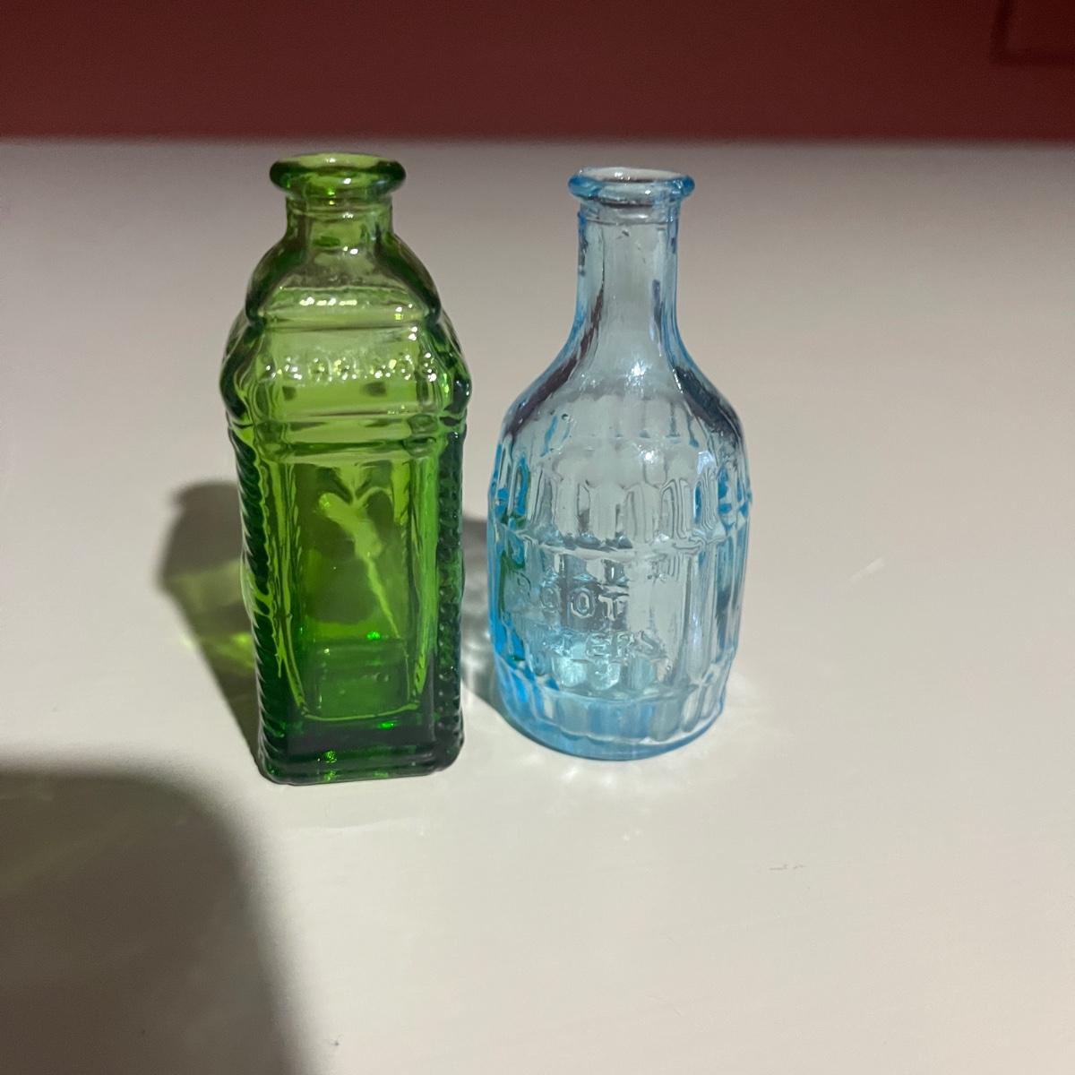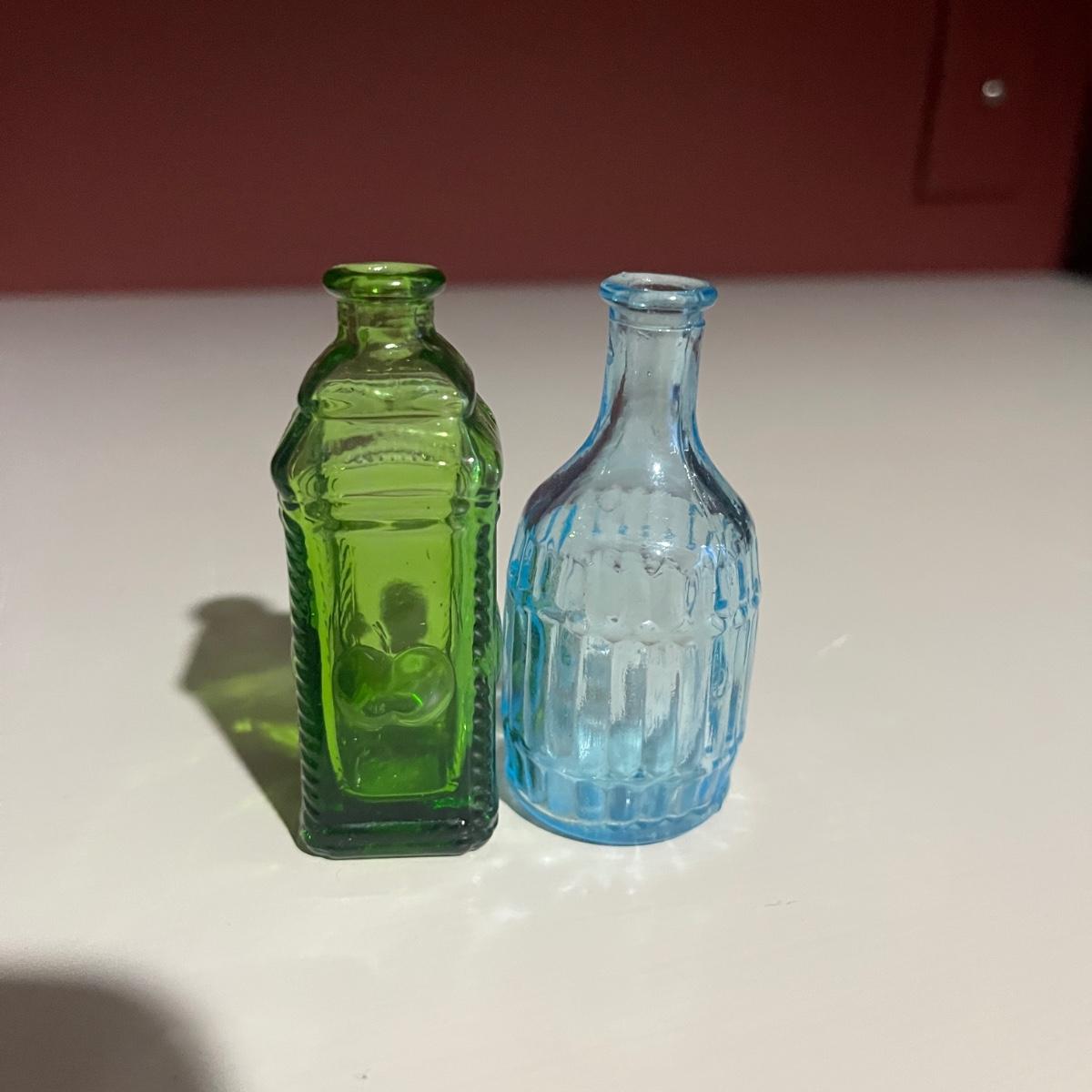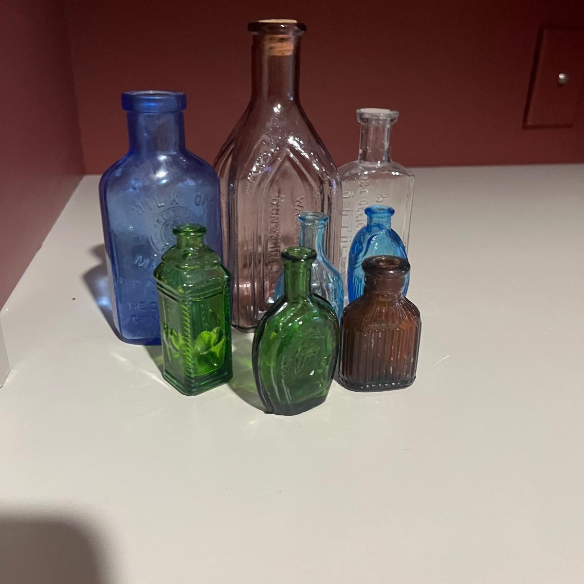 Lot contains a collection of eight glass bottles in a variety of colors and sizes. Largest bottle measures 2.5” x 2.5” x 6”H.