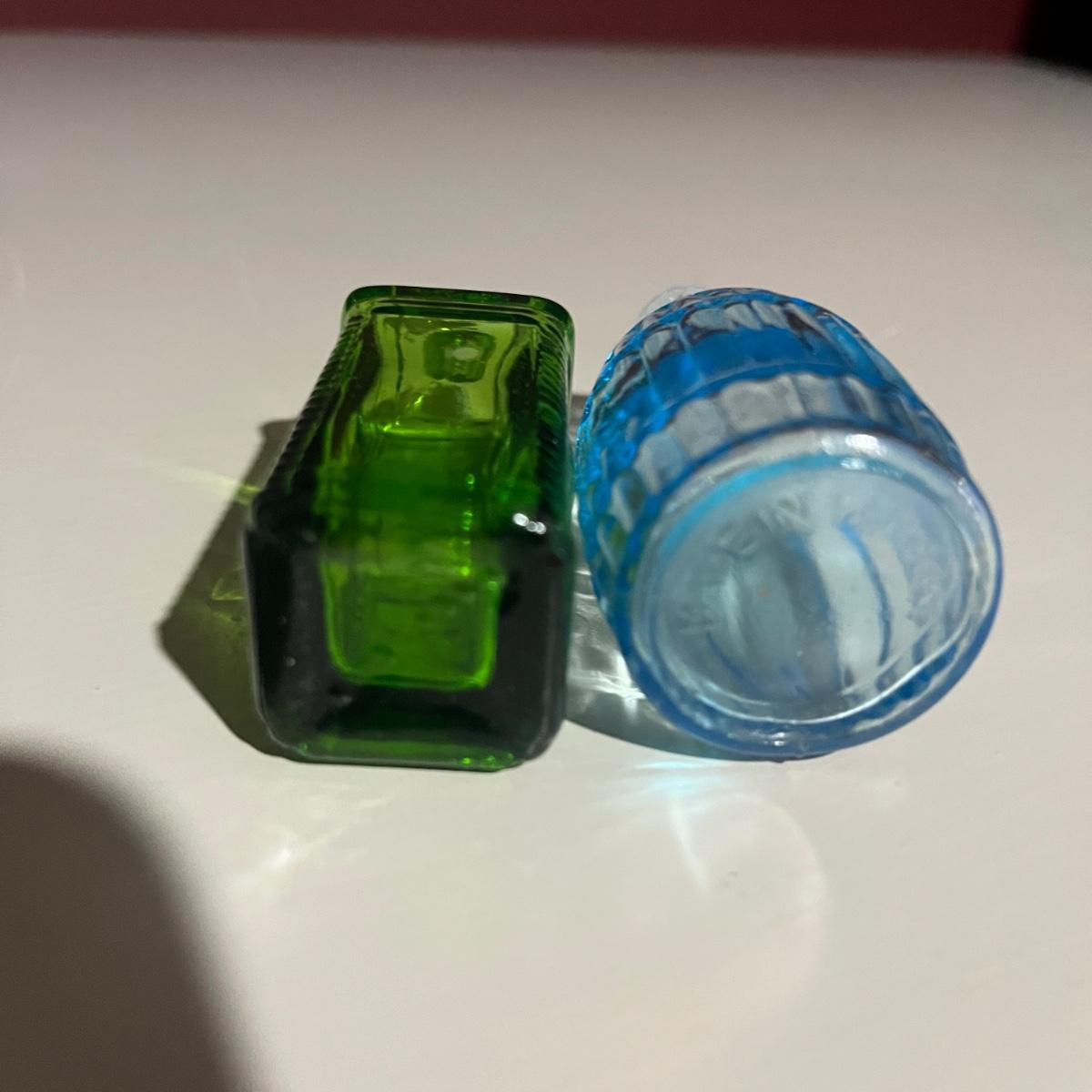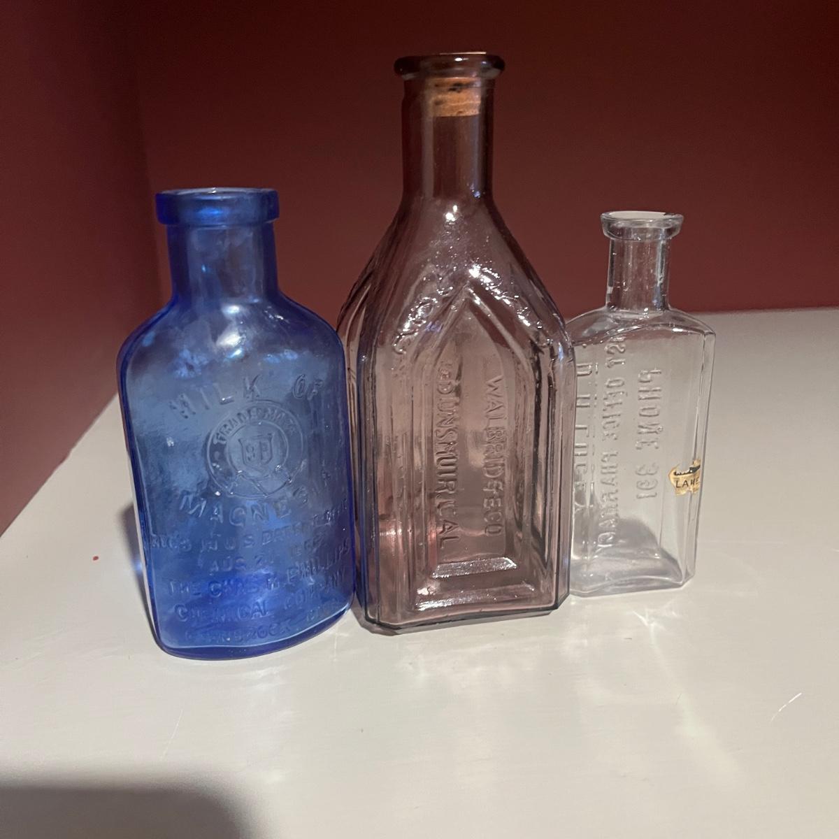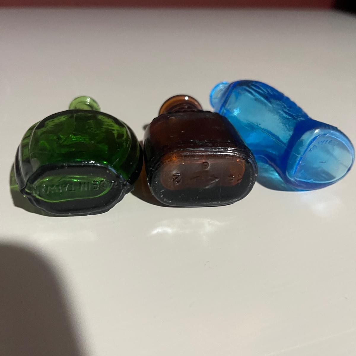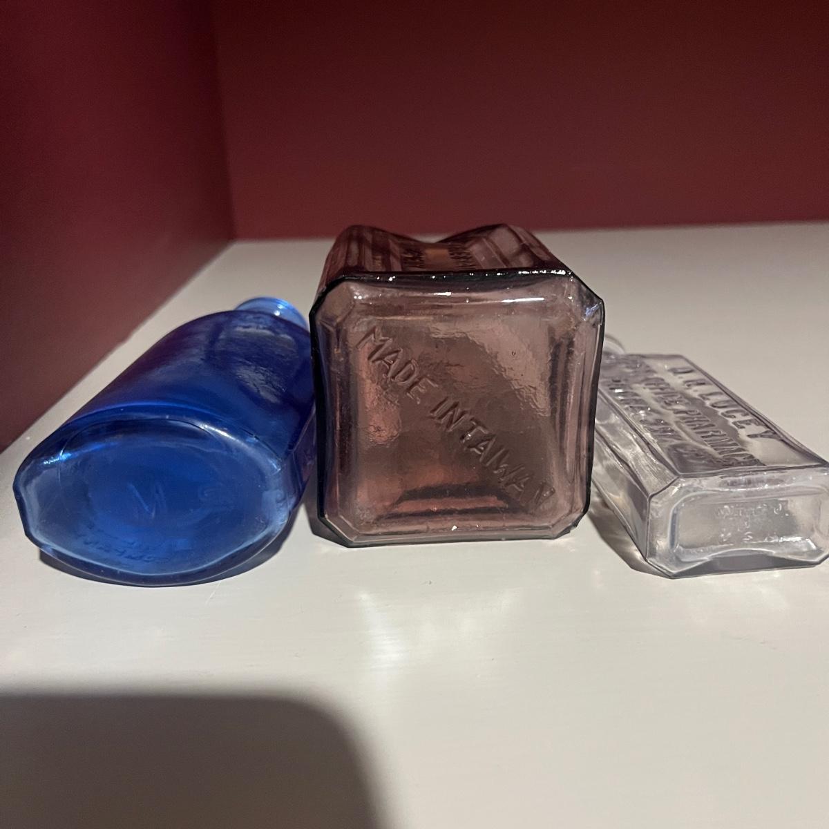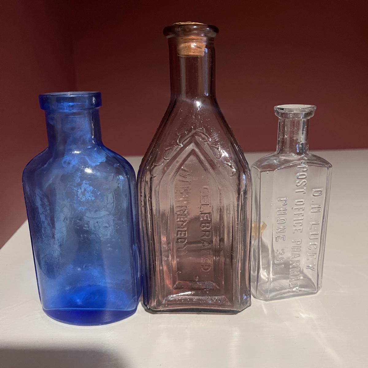 Lot contains a collection of eight glass bottles in a variety of colors and sizes. Largest bottle measures 2.5” x 2.5” x 6”H.