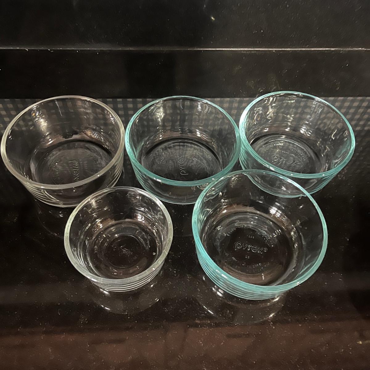 Lot contains a collection of glass and plastic containers with lids that includes five Pyrex dishes with lids, four plastic containers with red lids, two large plastic containers and three smaller plastic containers with lids. Largest container measures 8”D x 14”H.