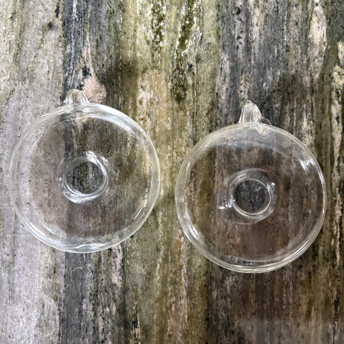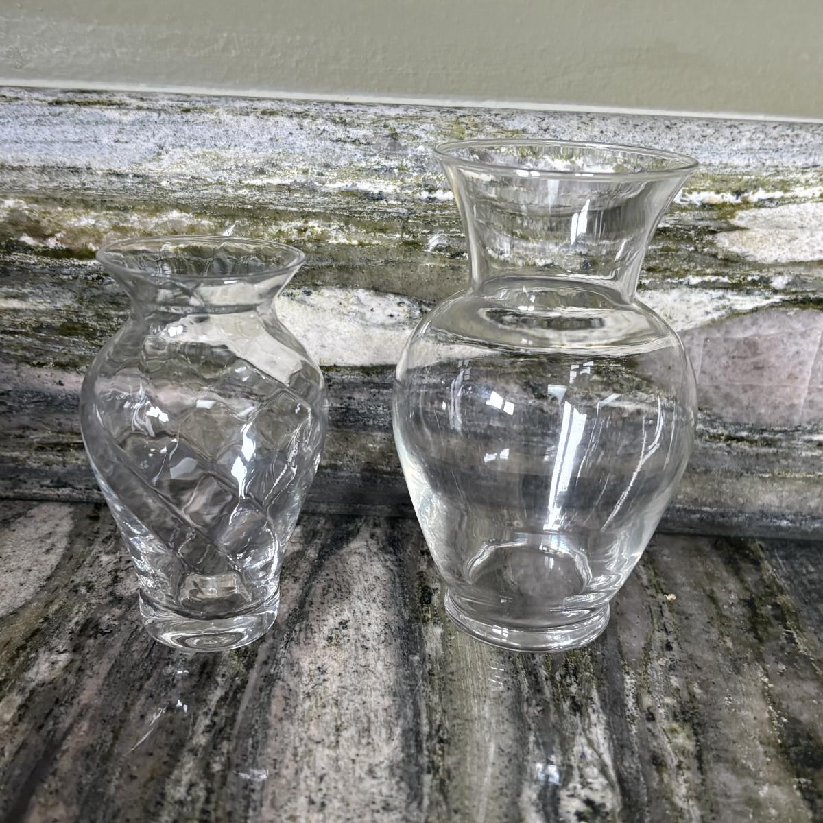 An 11 piece glass collection including varying sizes of flower vases, 2 candle sticks, and 2 floating flower rings. The heaviest item in the set is the hurricane vase, with measurements of approximately 6.5" x 8.5"H with a depth of 8". The tallest vase is approximately 11". The tallest candle holder is approximately 6". The 2 floating flower rings have a diameter of 3".