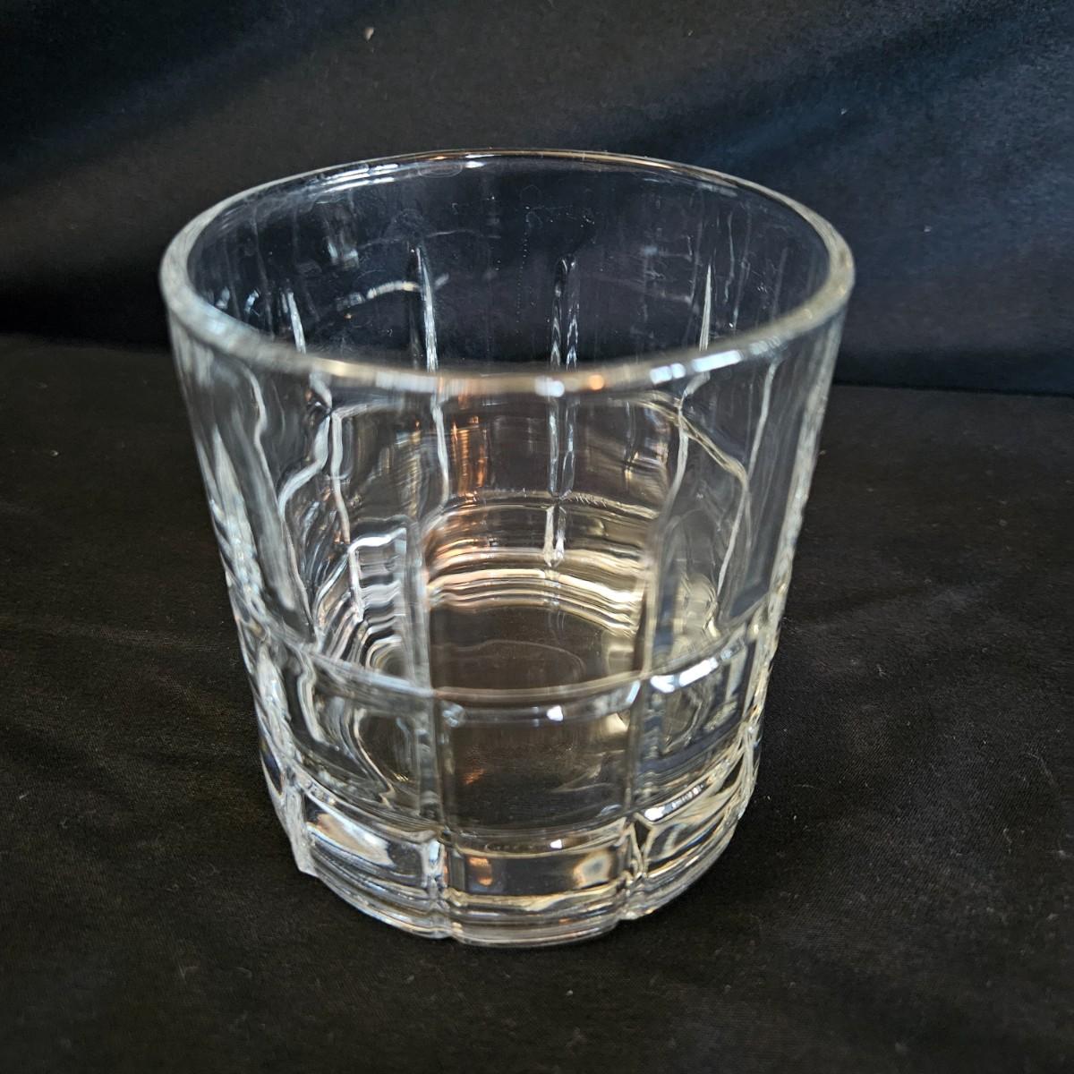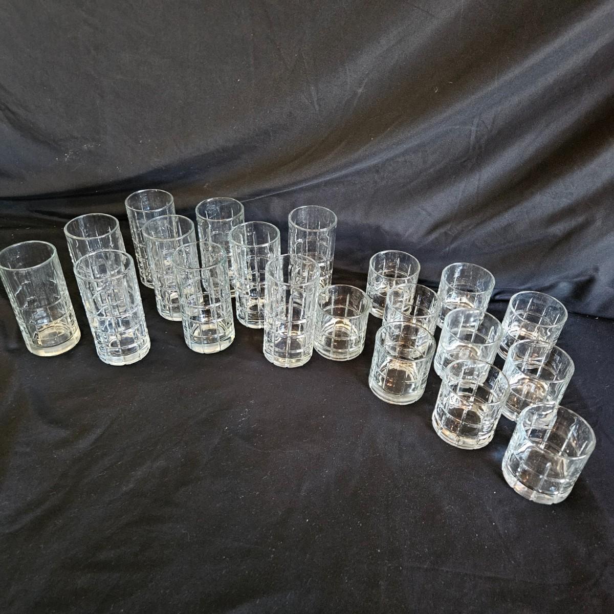 A set of drinking glasses that have a Tartan style square pattern cut into them. There is a set of 10 small glasses and a set of 10 larger glasses. The largest glass measures approximately 3"D x 6"H. Shipping available