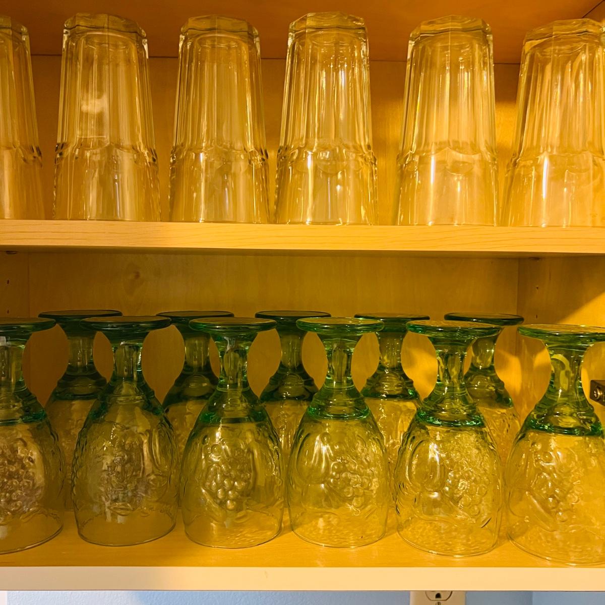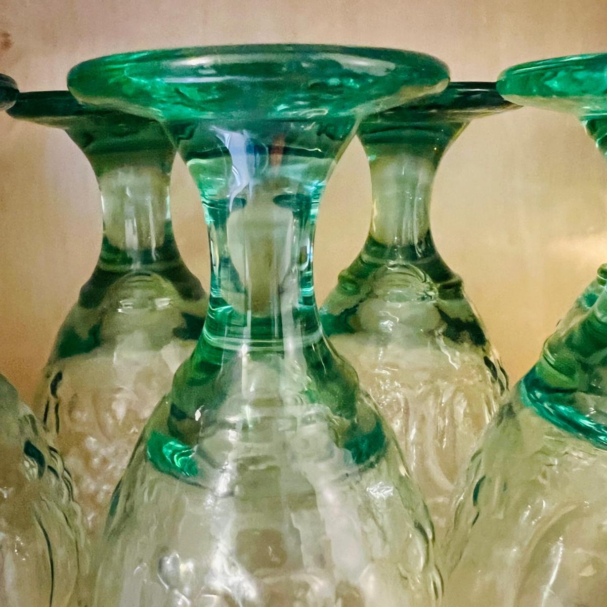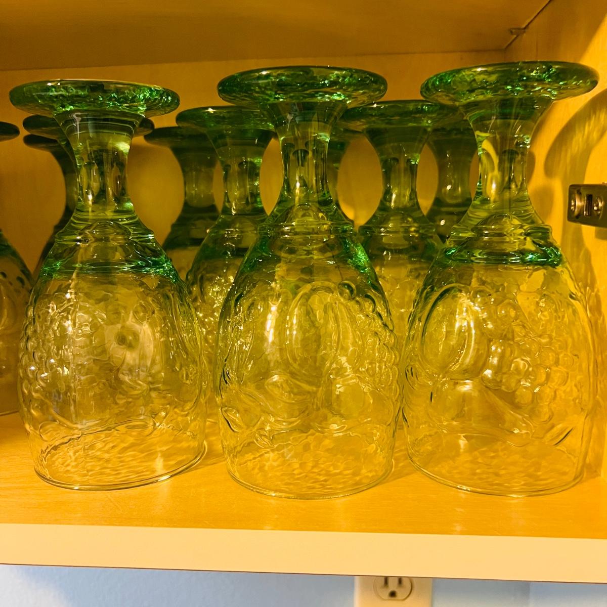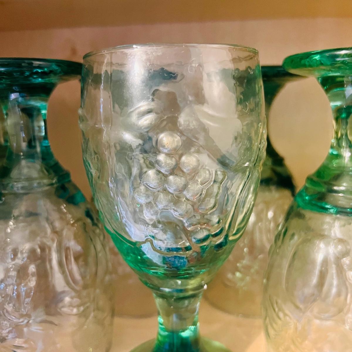Lot includes eleven, pretty green stemmed glasses and six large, clear glasses. All are made of thick, heavy glass.