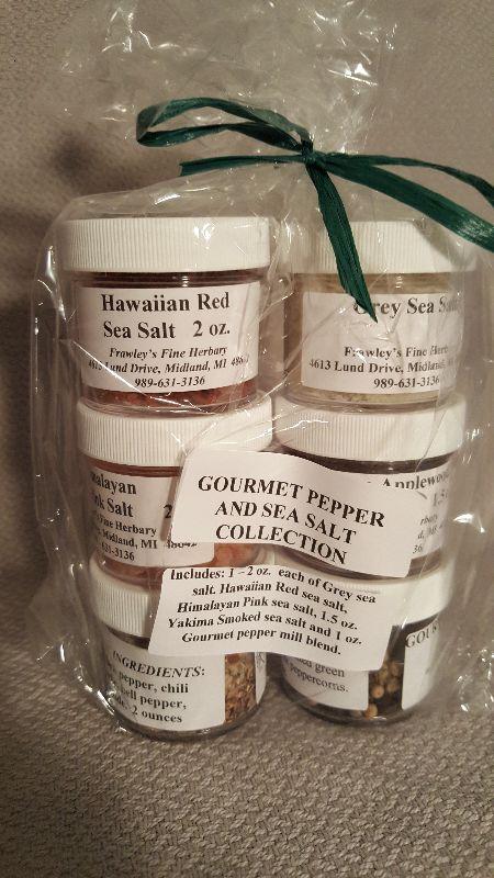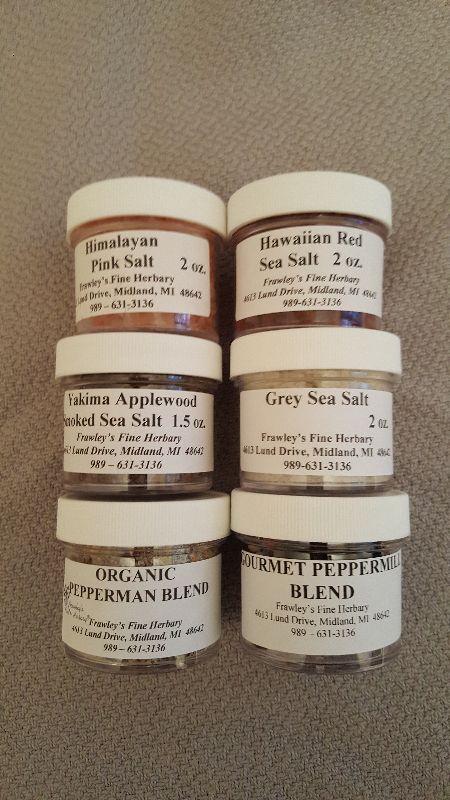 This lot is for a Collection of Gourmet Salts and Pepper. The collection contains Himalayan Pink Salt, Yakima Applewood Smoked Sea Salt, Hawaiian Red Sea Salt, Grey Sea Salt Gourmet Peppermill Blend and Organic Pepperman Blend. You'll have the tastiest spice cabinet in the neighborhood if you win this lot with a high bid. Donated by Donna Frawley of Frawley's Fine Herbary in Midland, MI