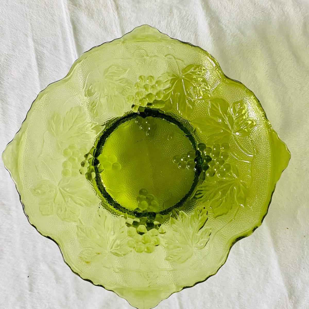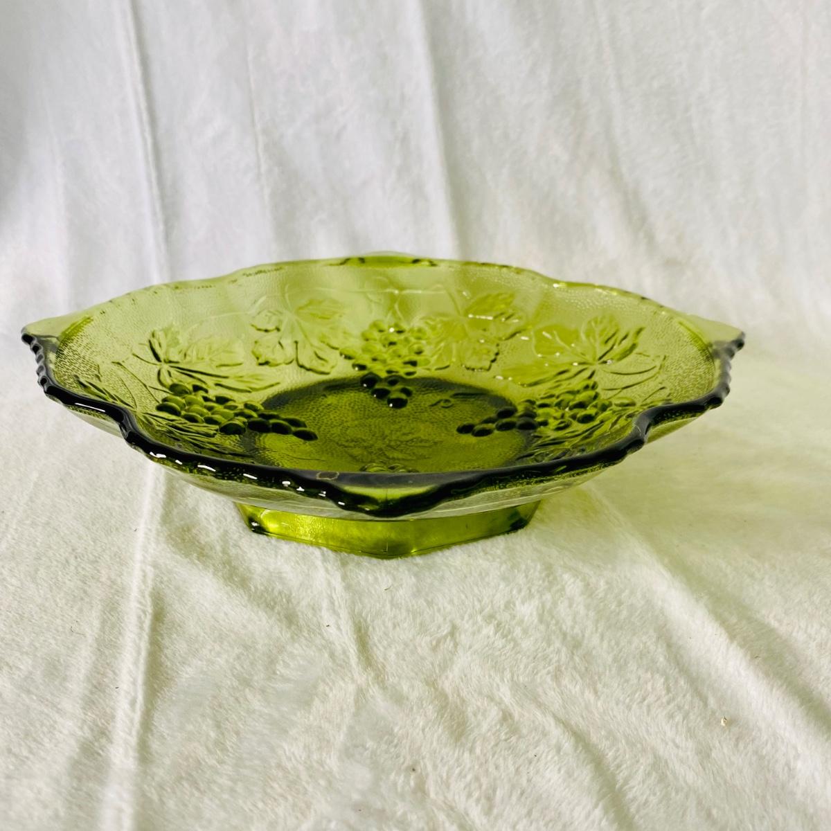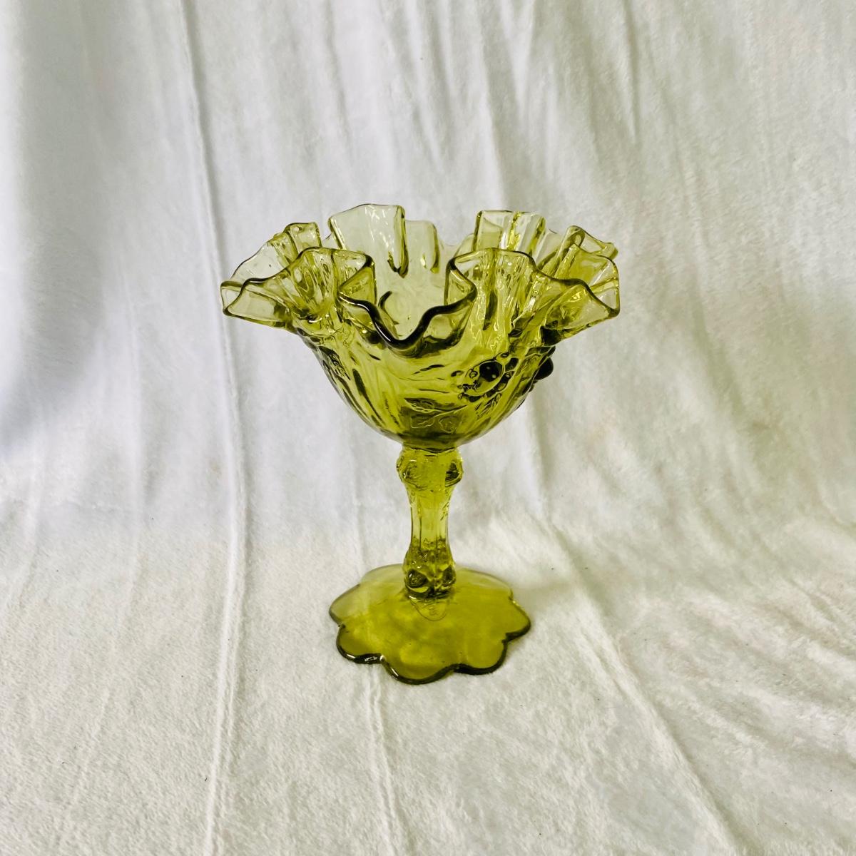 Stemmed dessert dish is Fenton with ruffled top. The other items are unmarked. Glass bowl has raised harvest grape pattern and measures 9”D. The vase measures 8”H. Good condition.