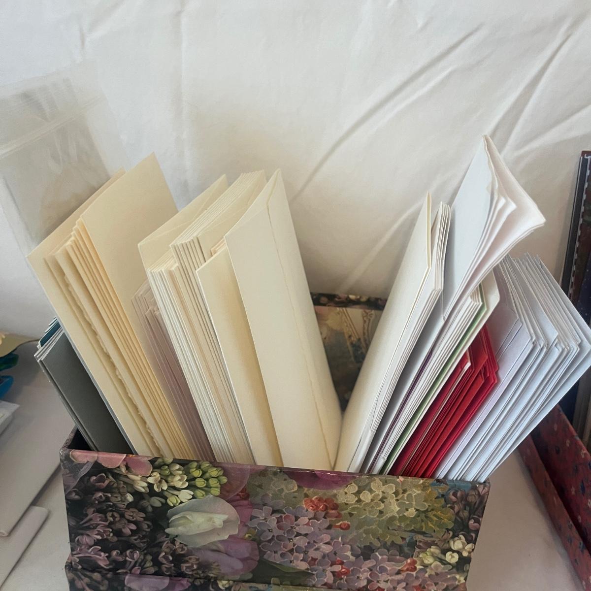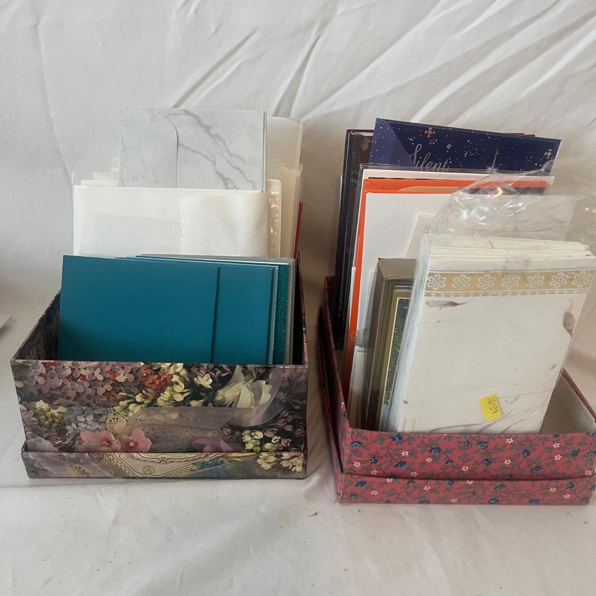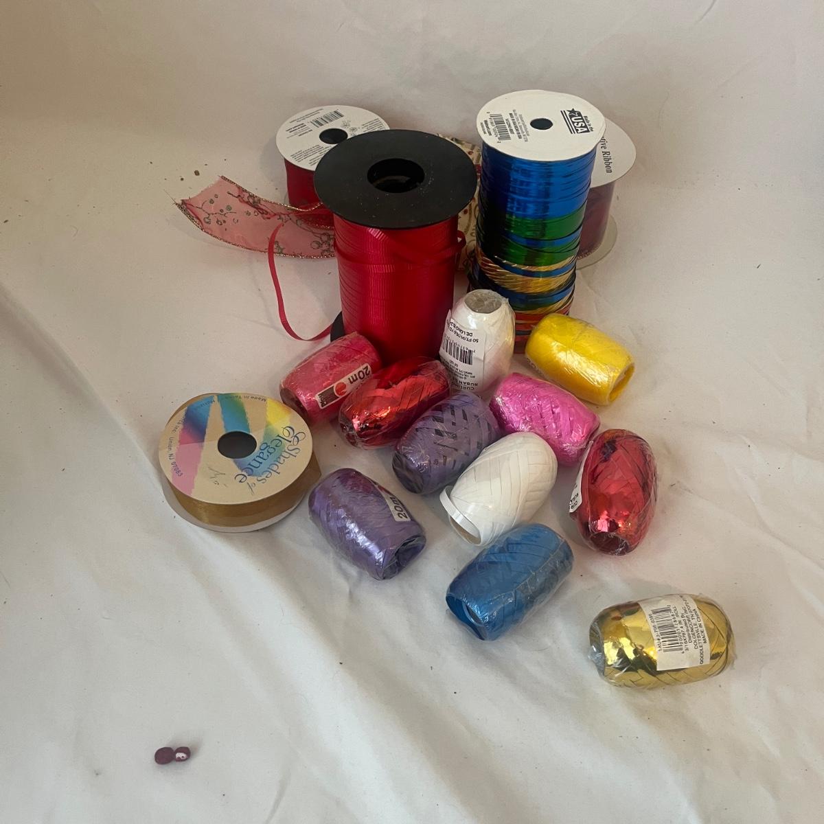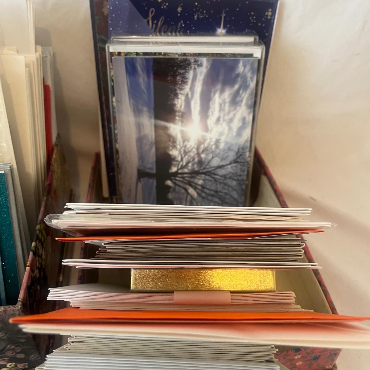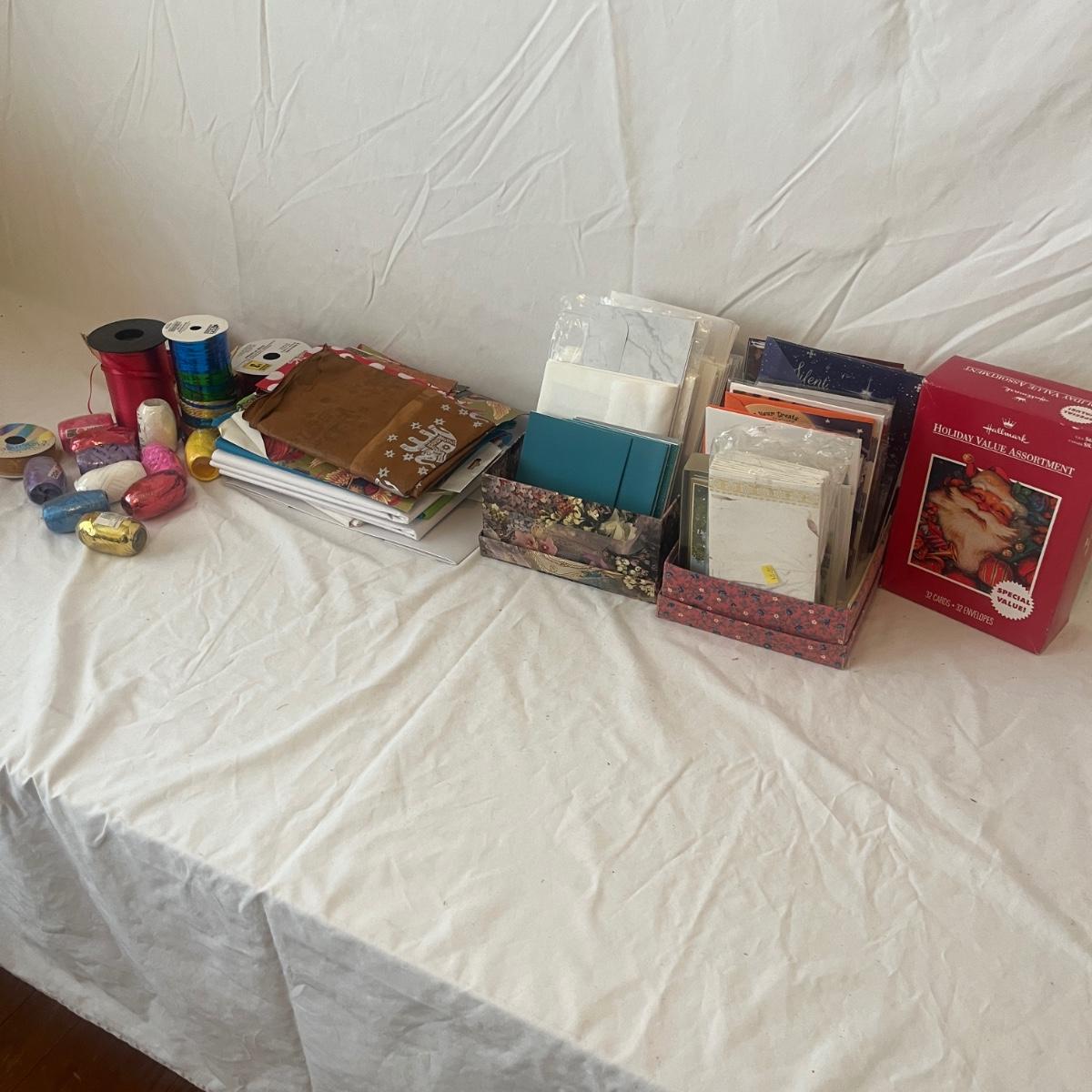 Lot includes a collection of Christmas cards, note cards, greeting cards and envelopes, over 10 rolls of ribbon and a selection of tissue and wrapping paper.