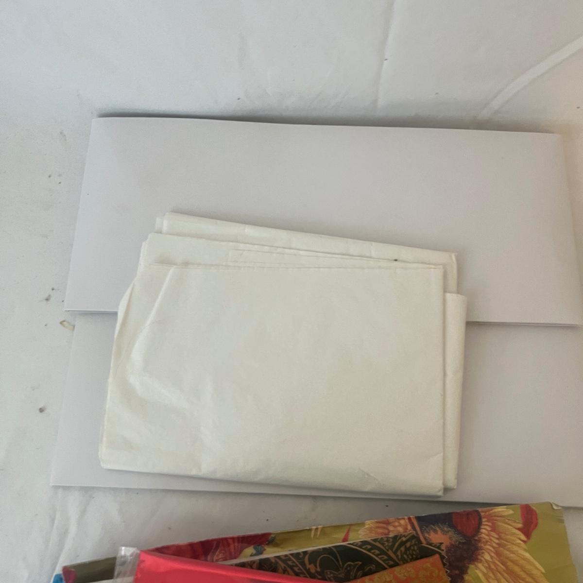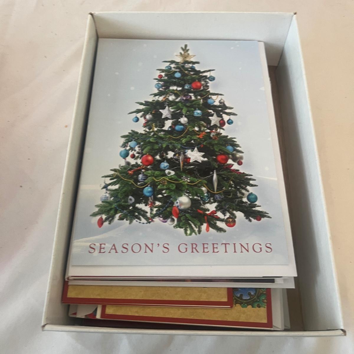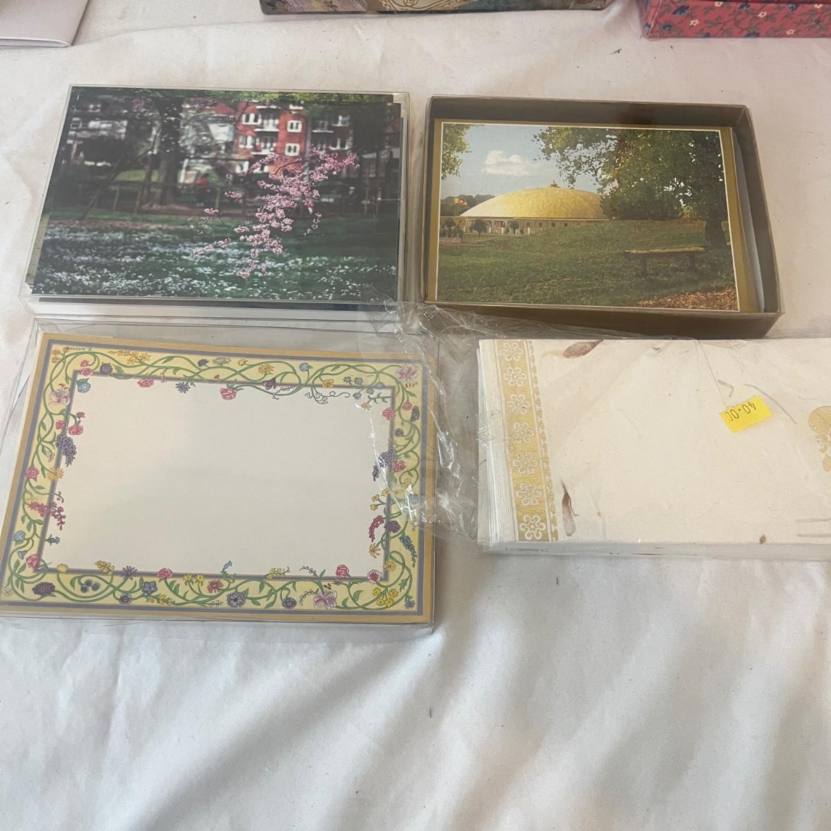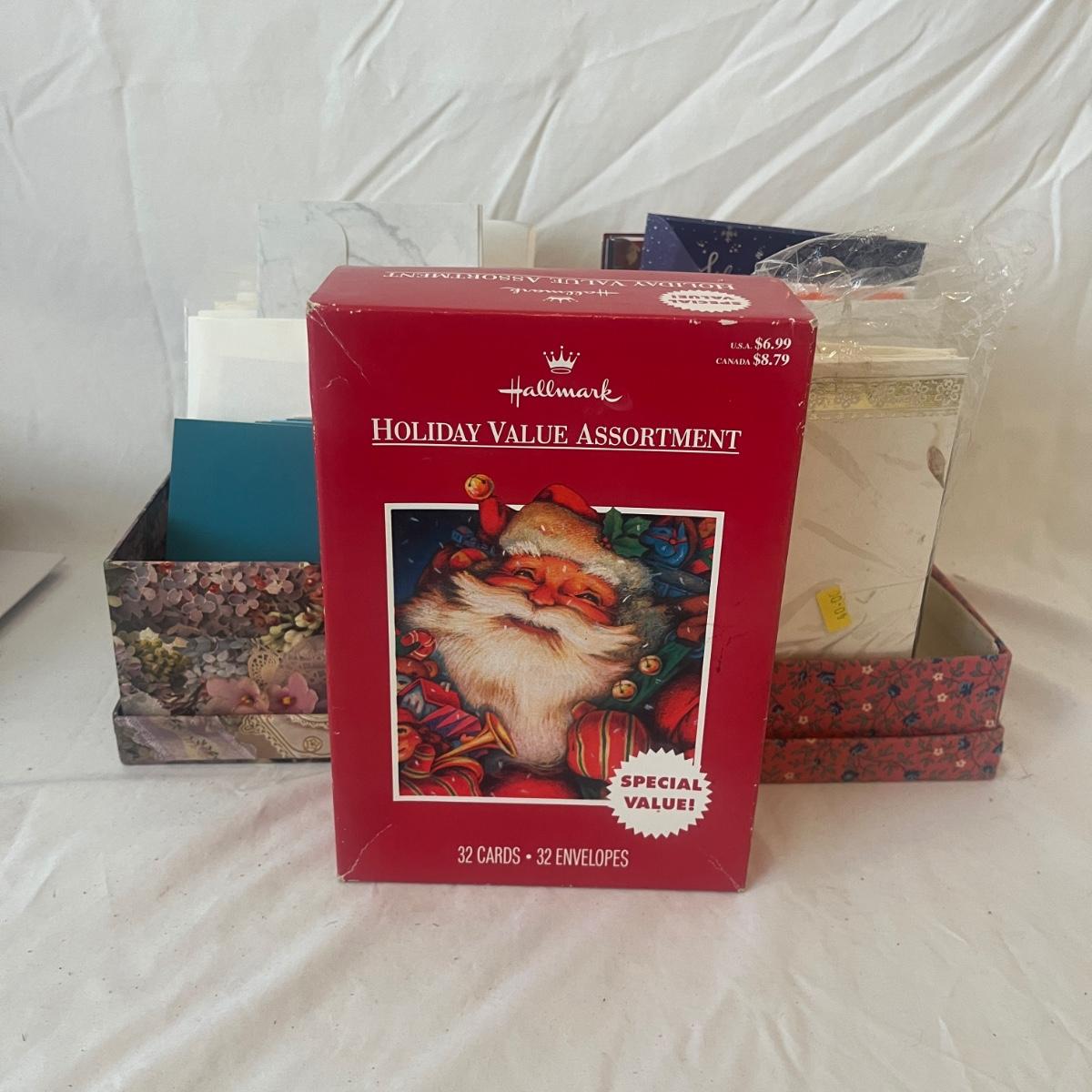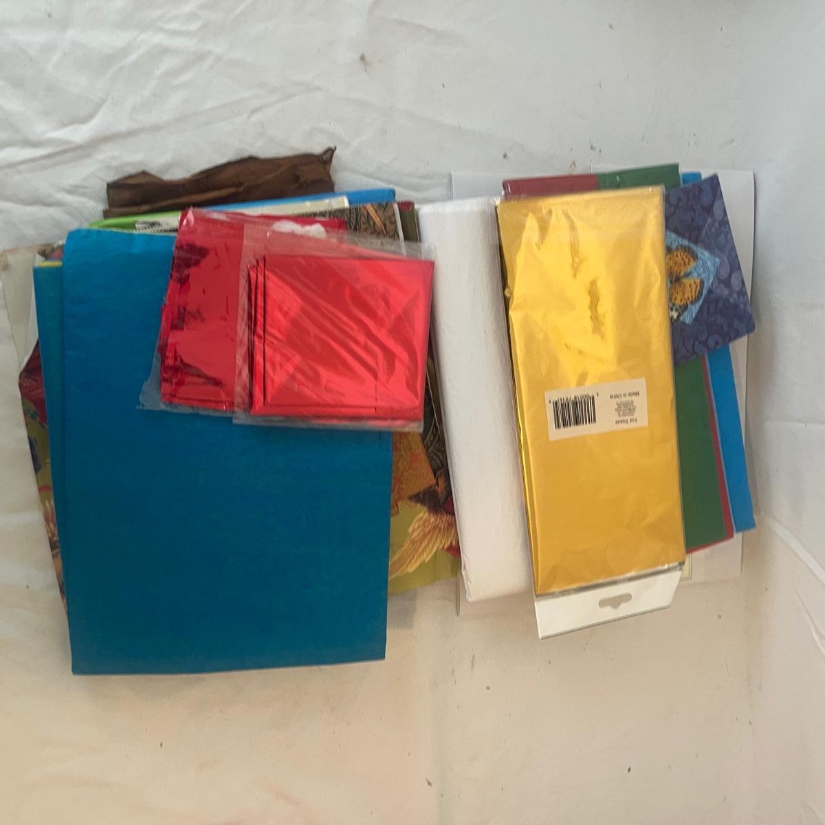 Lot includes a collection of Christmas cards, note cards, greeting cards and envelopes, over 10 rolls of ribbon and a selection of tissue and wrapping paper.