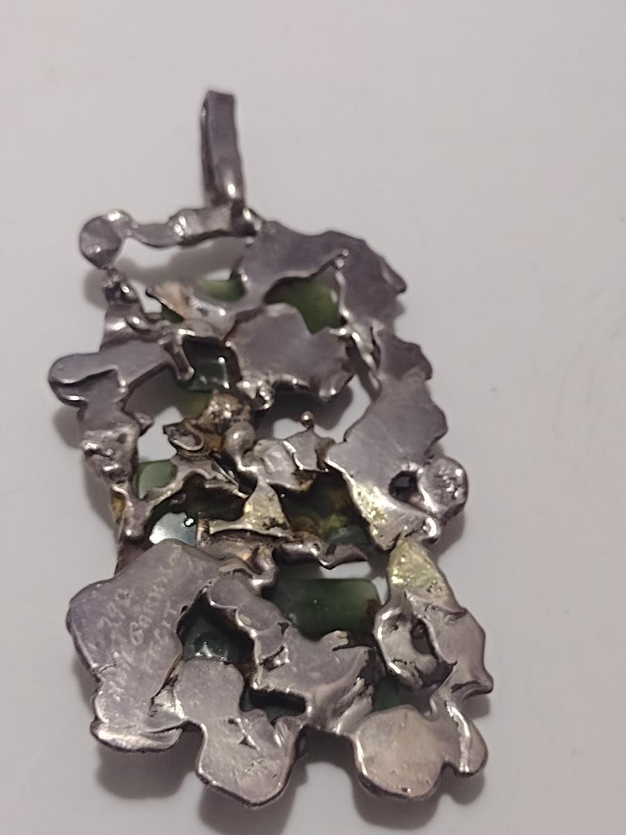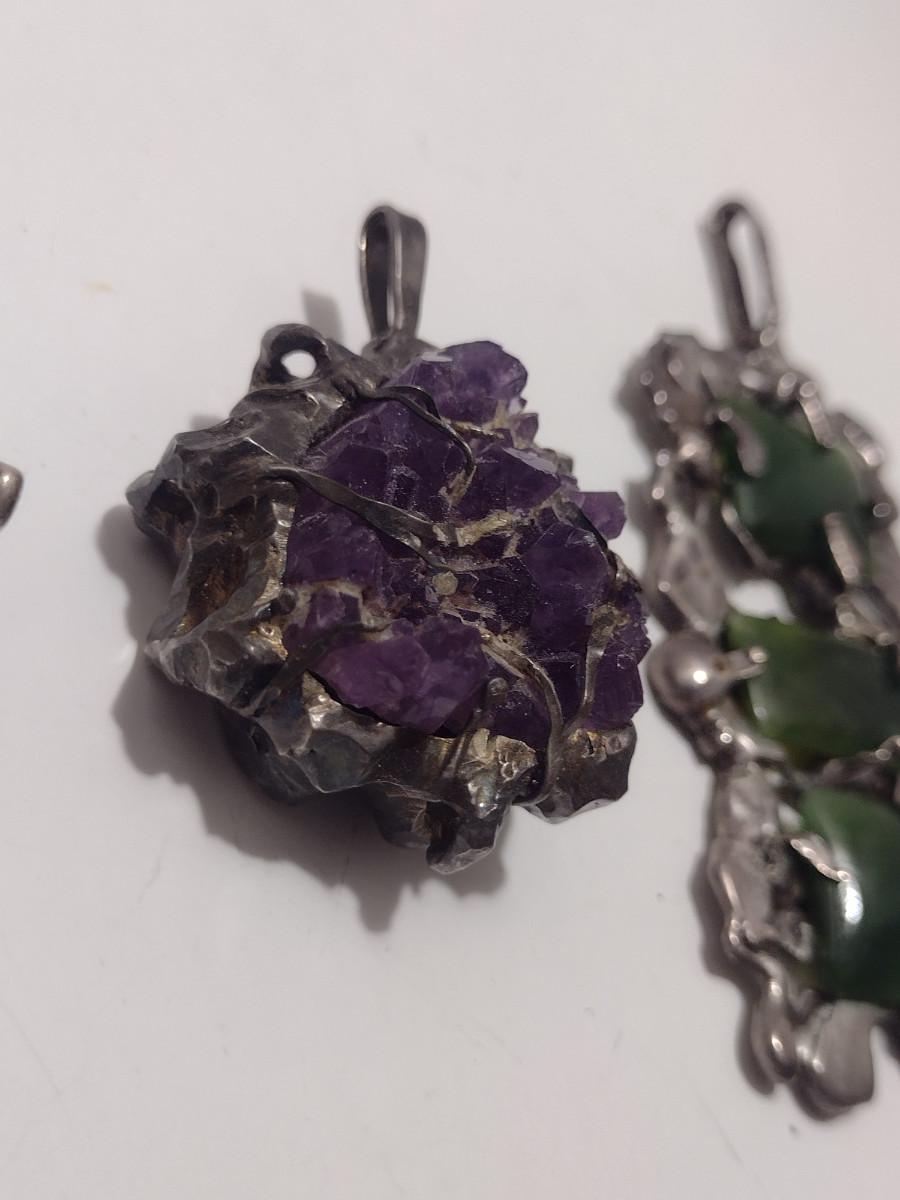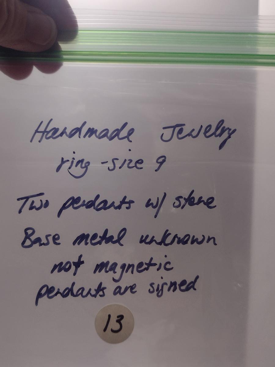 Collection of Hand Crafted Jewelry- Two Pendants and One Ring (#13). Both pendants contain stone and are signed by artist. Ring is size 9. Type of metal is unknown, but is not magnetic.