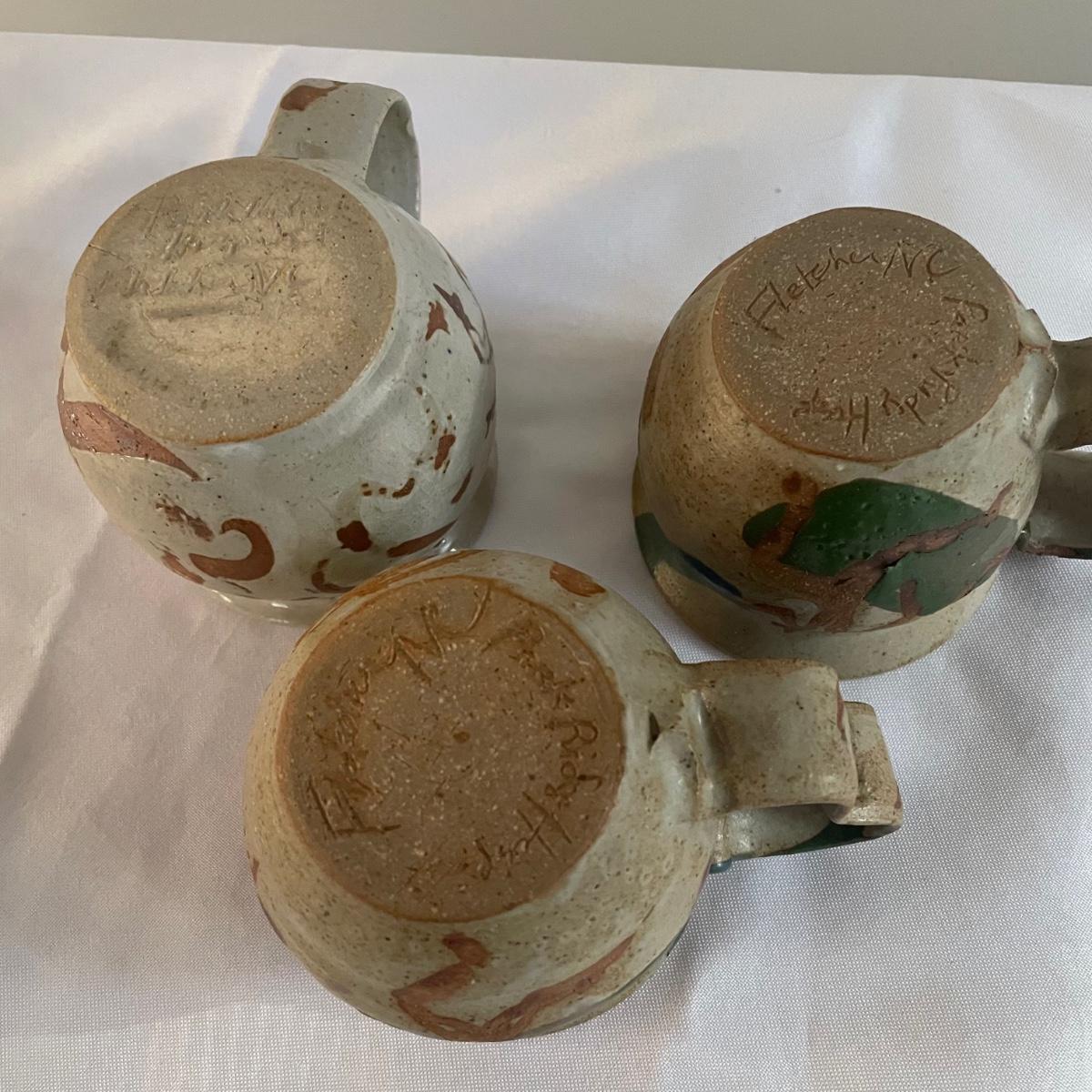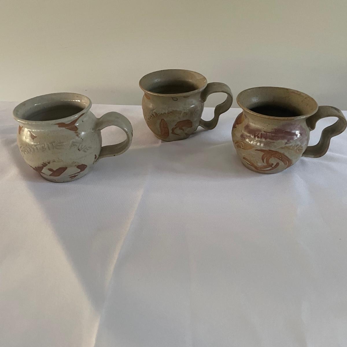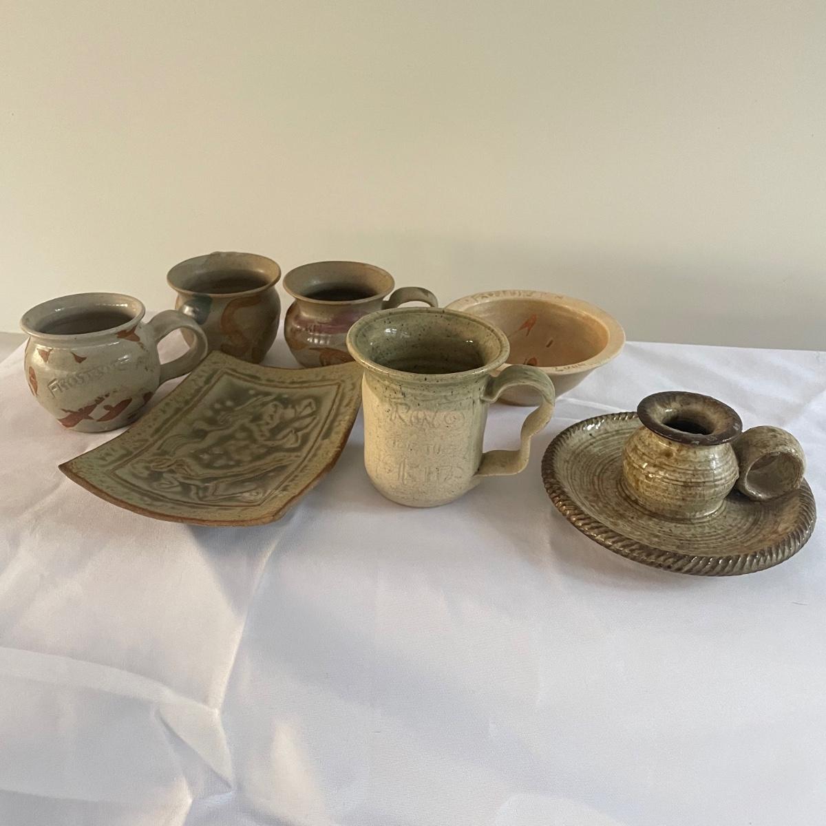 This nice assortment of hand made pottery were trophies therefore marks on the bottom of pieces are related to that and not to the makers of the pieces. Included are four small and two larger mugs, a bowl, small dish and a candle holder.