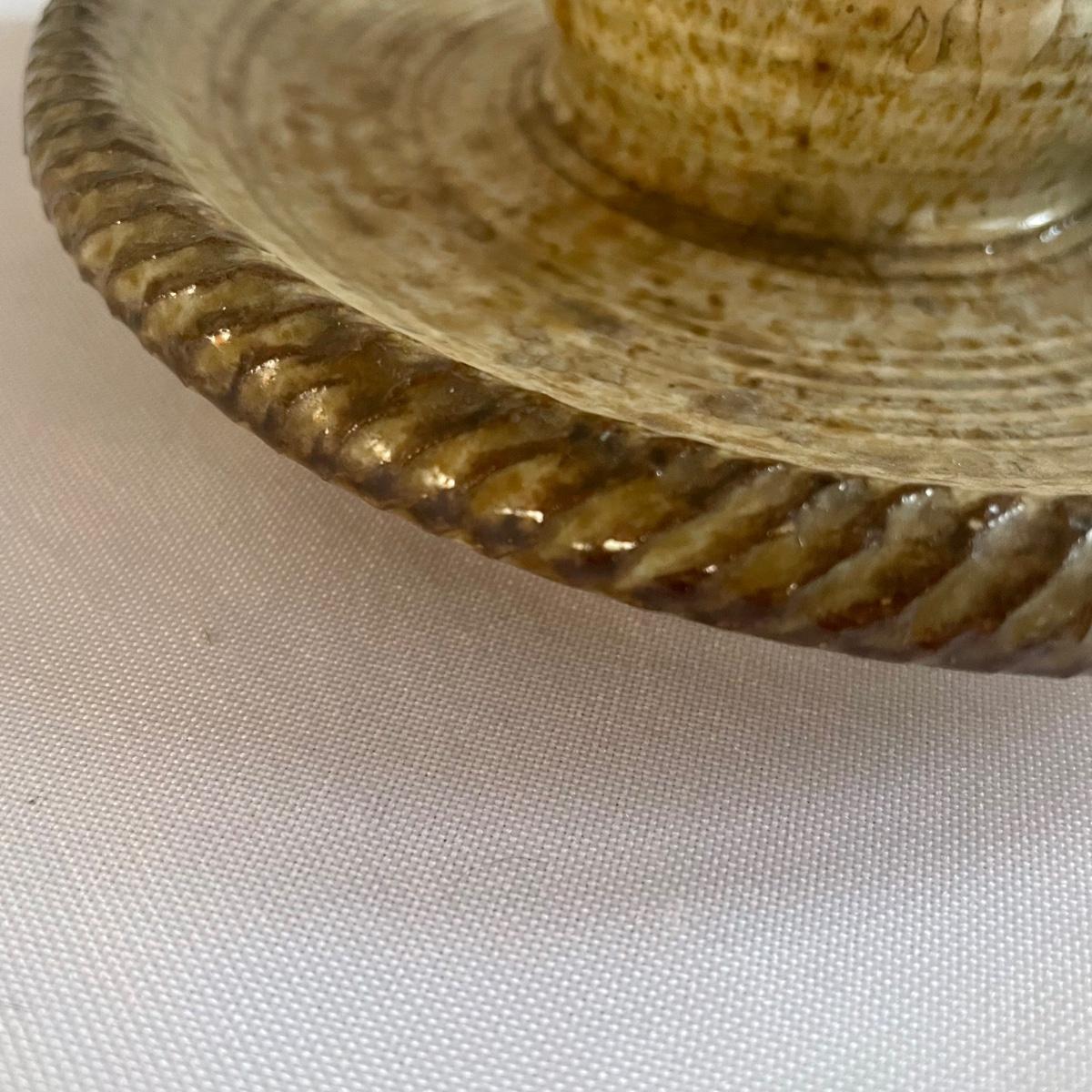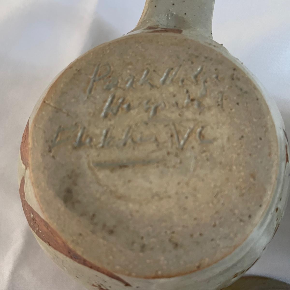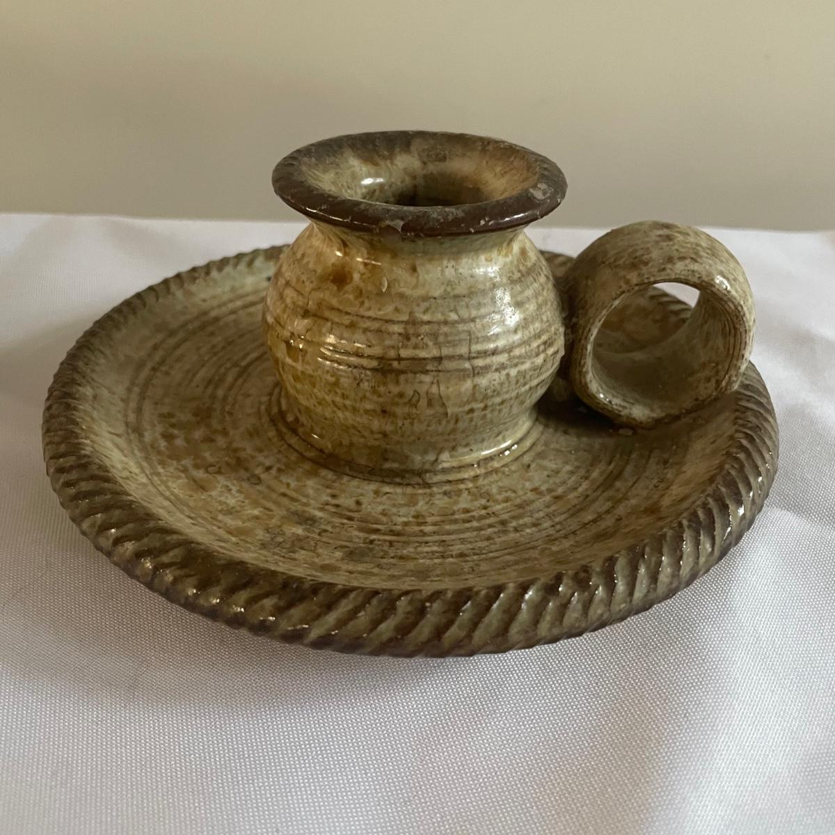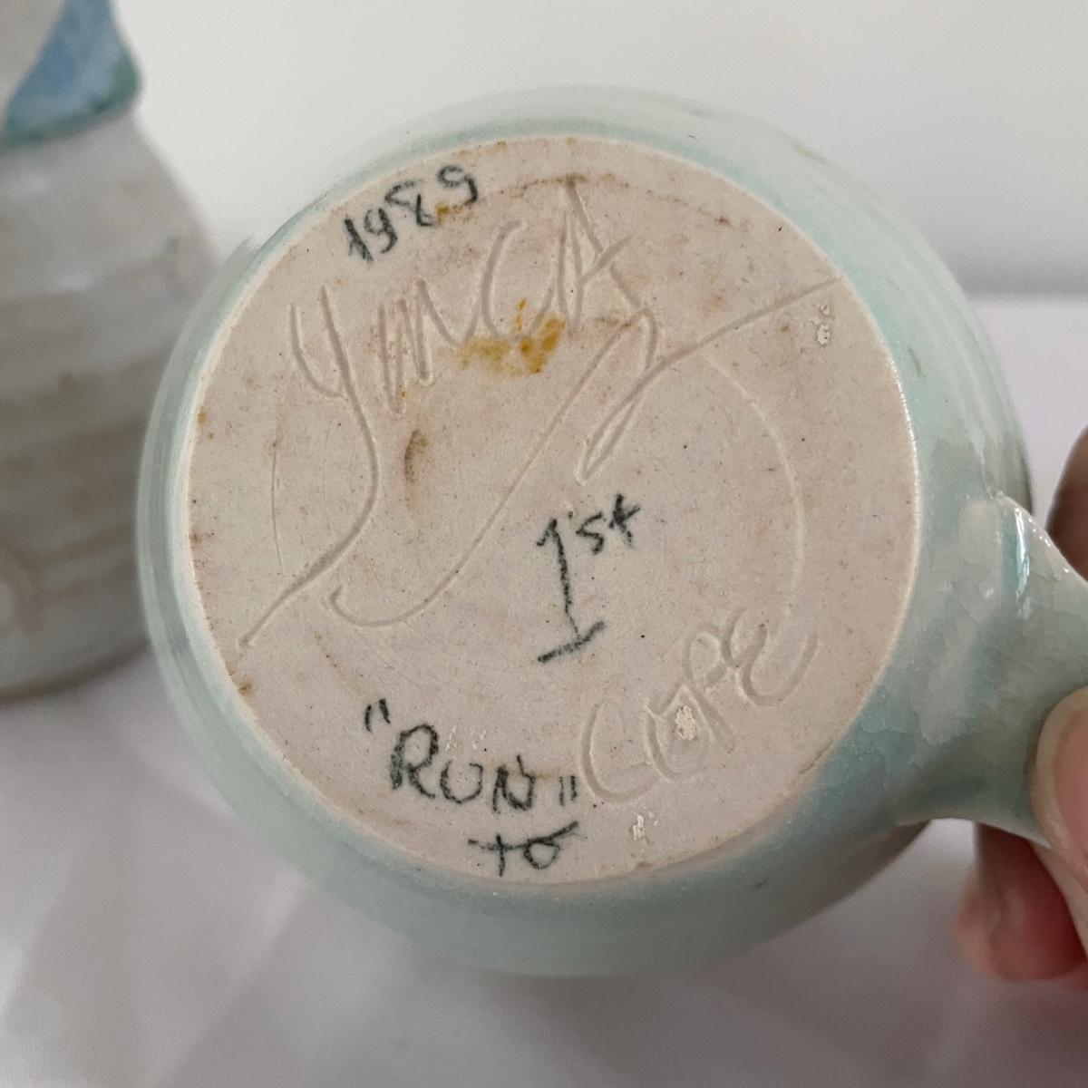This nice assortment of hand made pottery were trophies therefore marks on the bottom of pieces are related to that and not to the makers of the pieces. Included are four small and two larger mugs, a bowl, small dish and a candle holder.