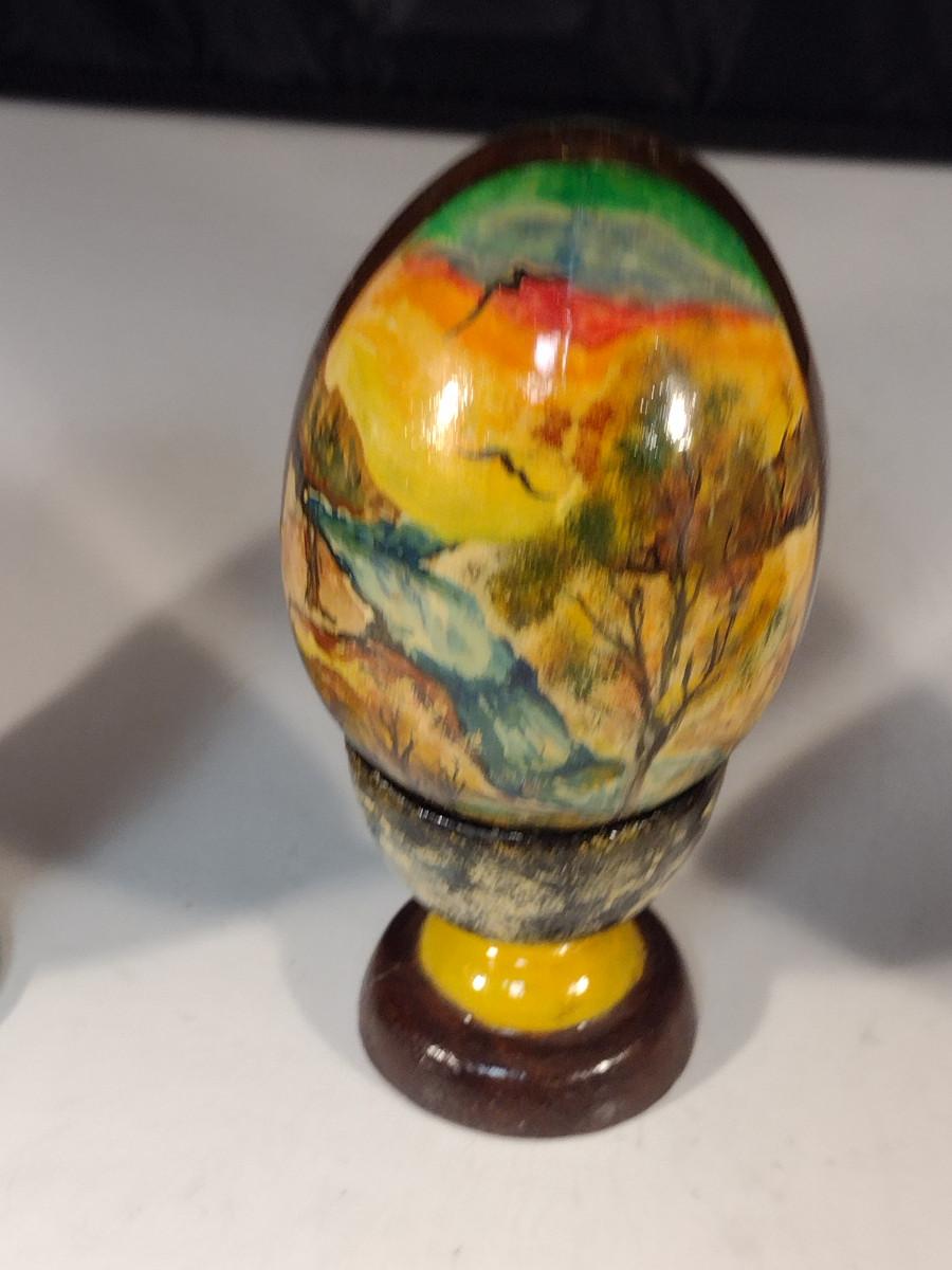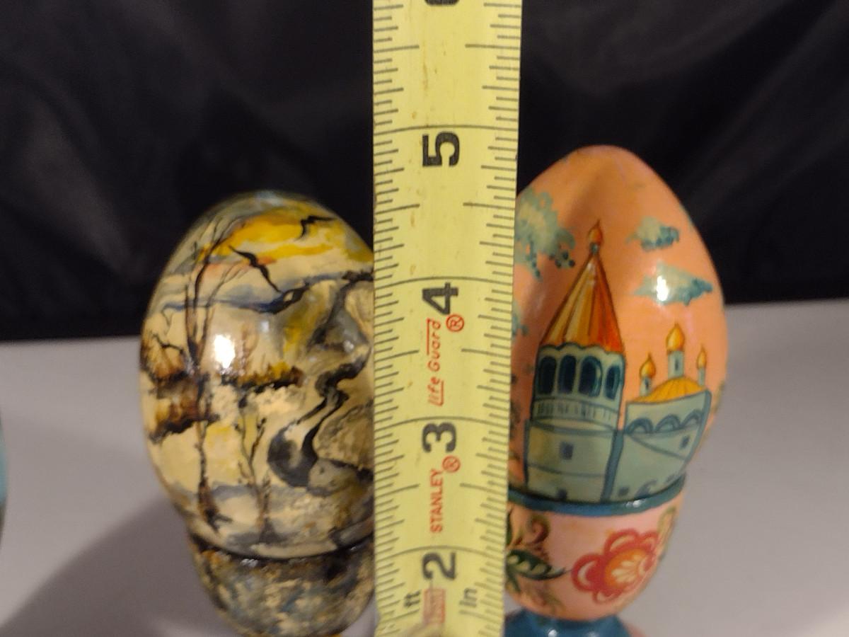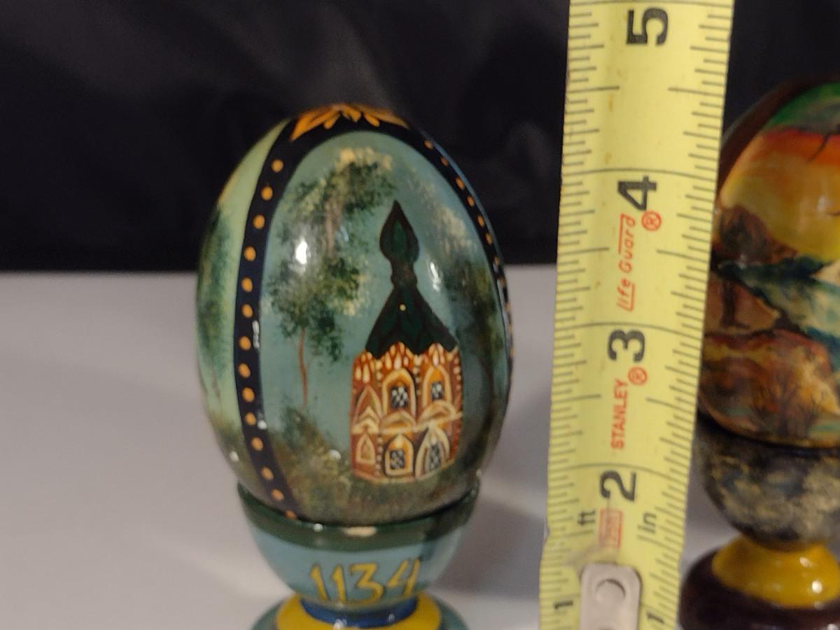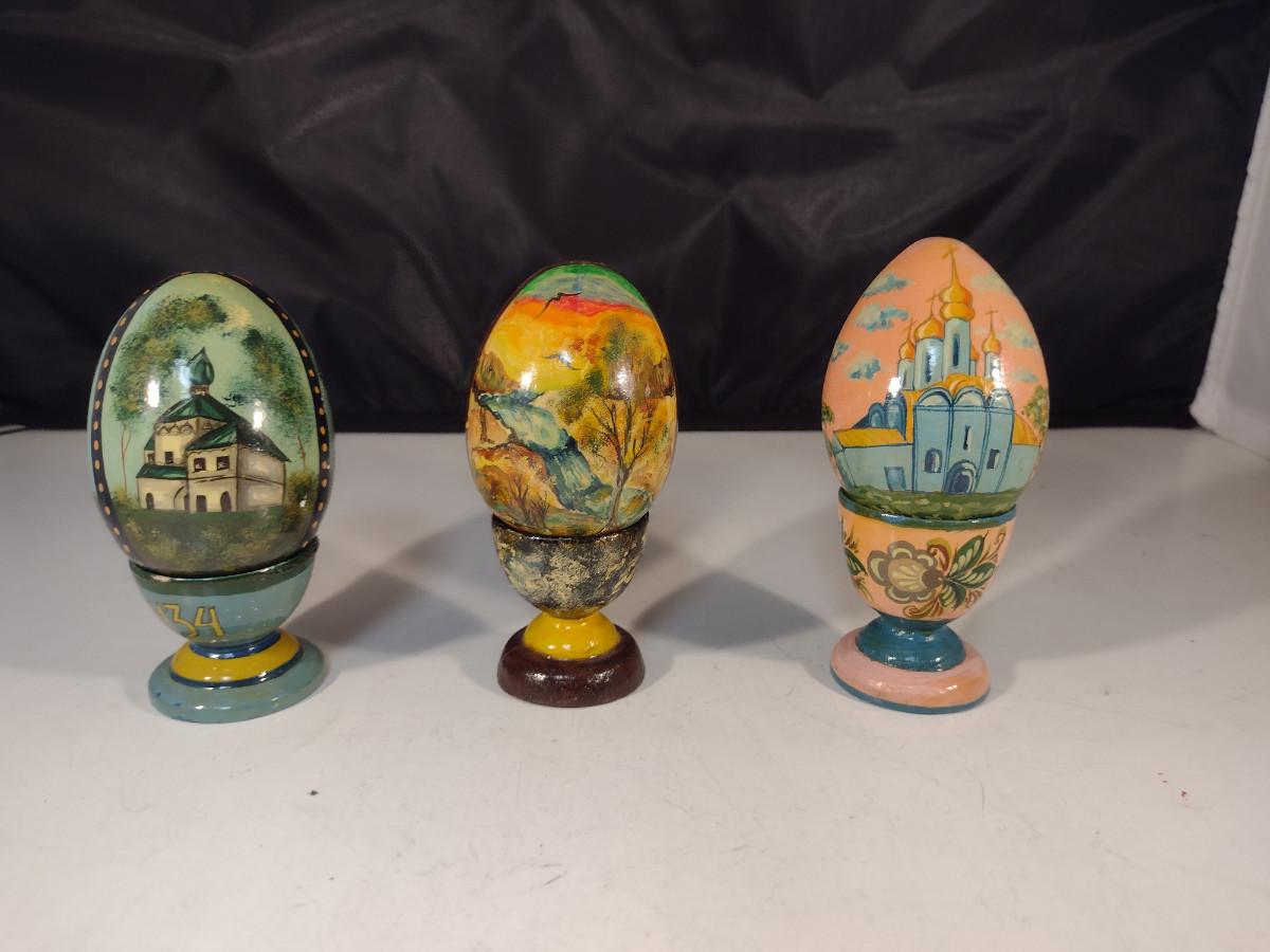 Collection of Hand Painted Russian Lacquer Eggs with Cup Stands- Three Pieces