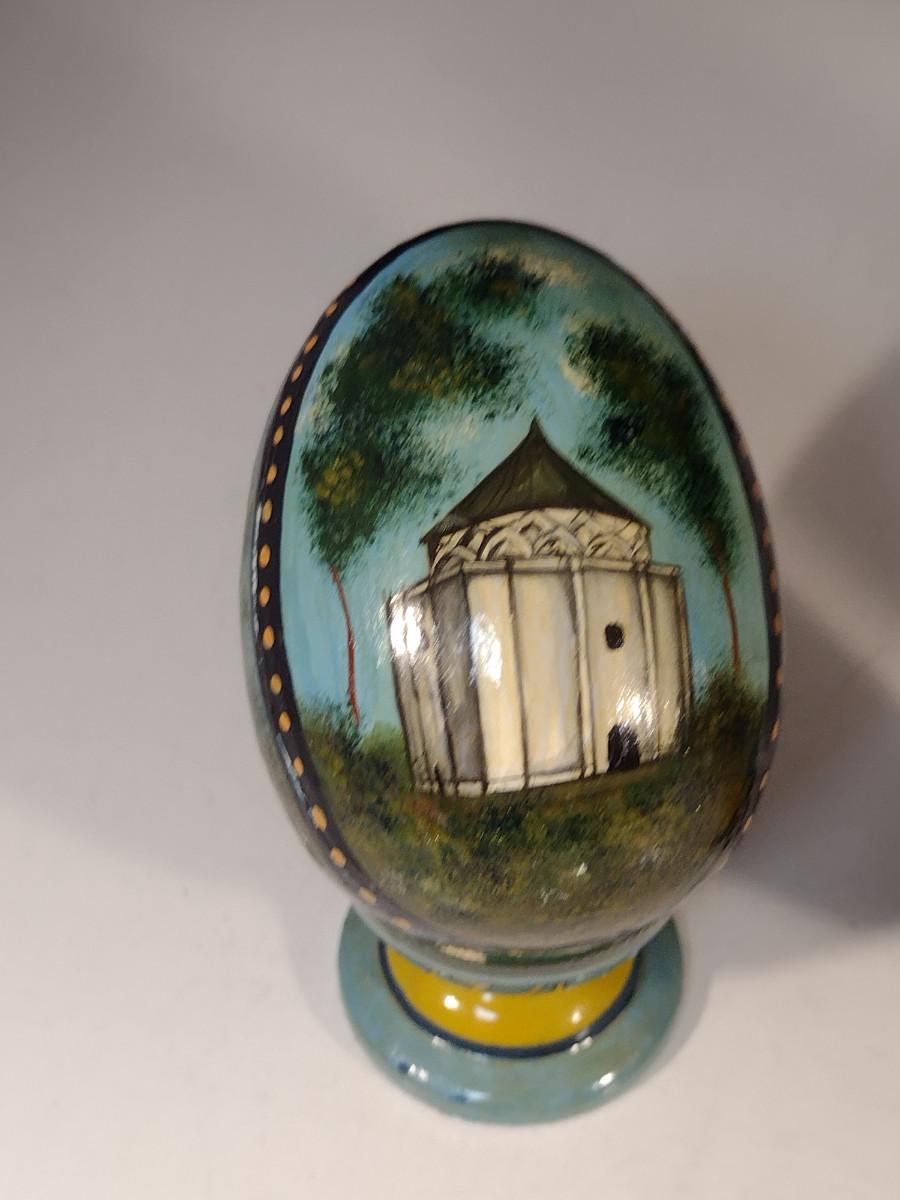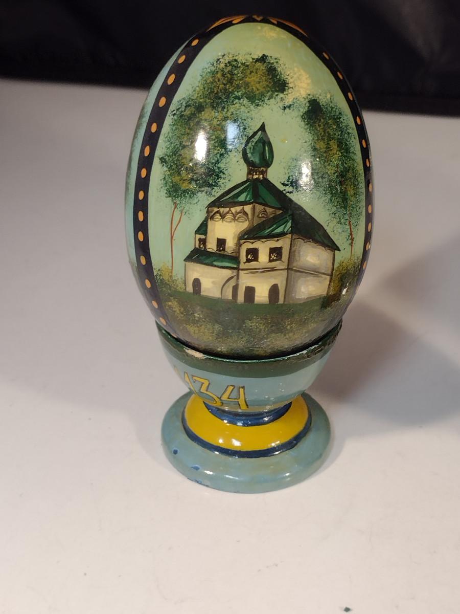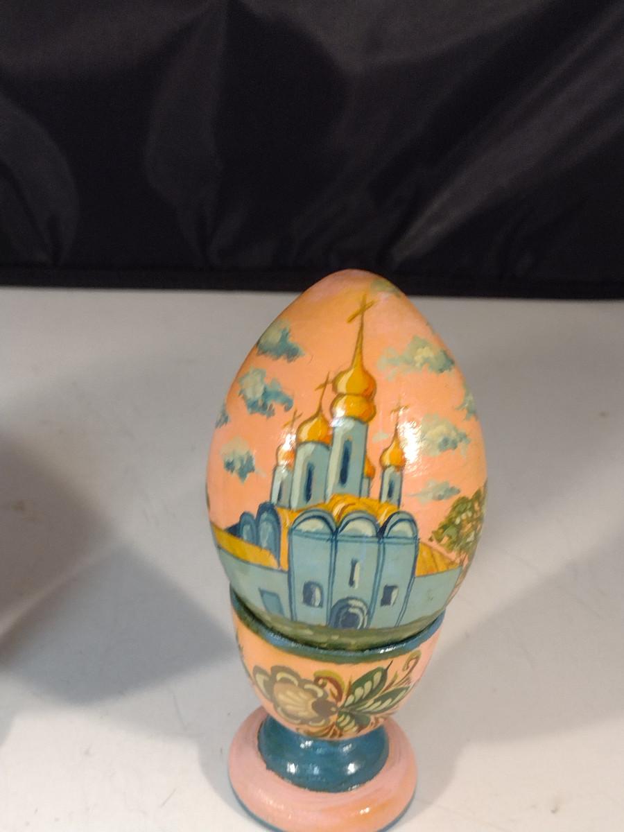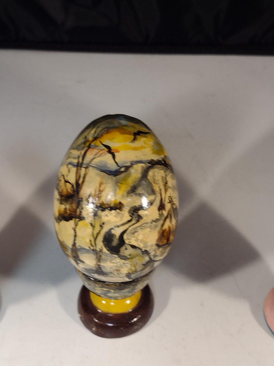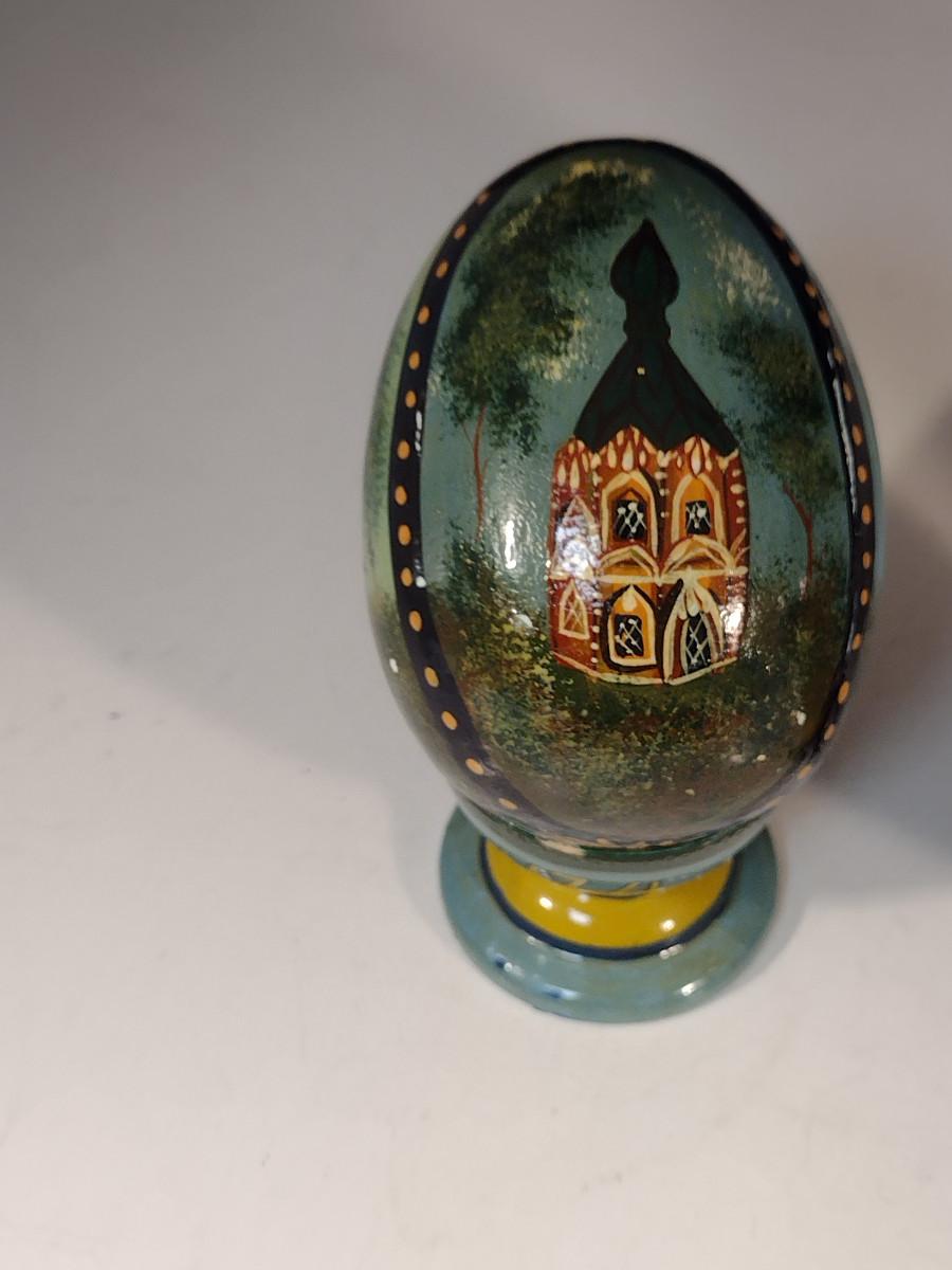 Collection of Hand Painted Russian Lacquer Eggs with Cup Stands- Three Pieces