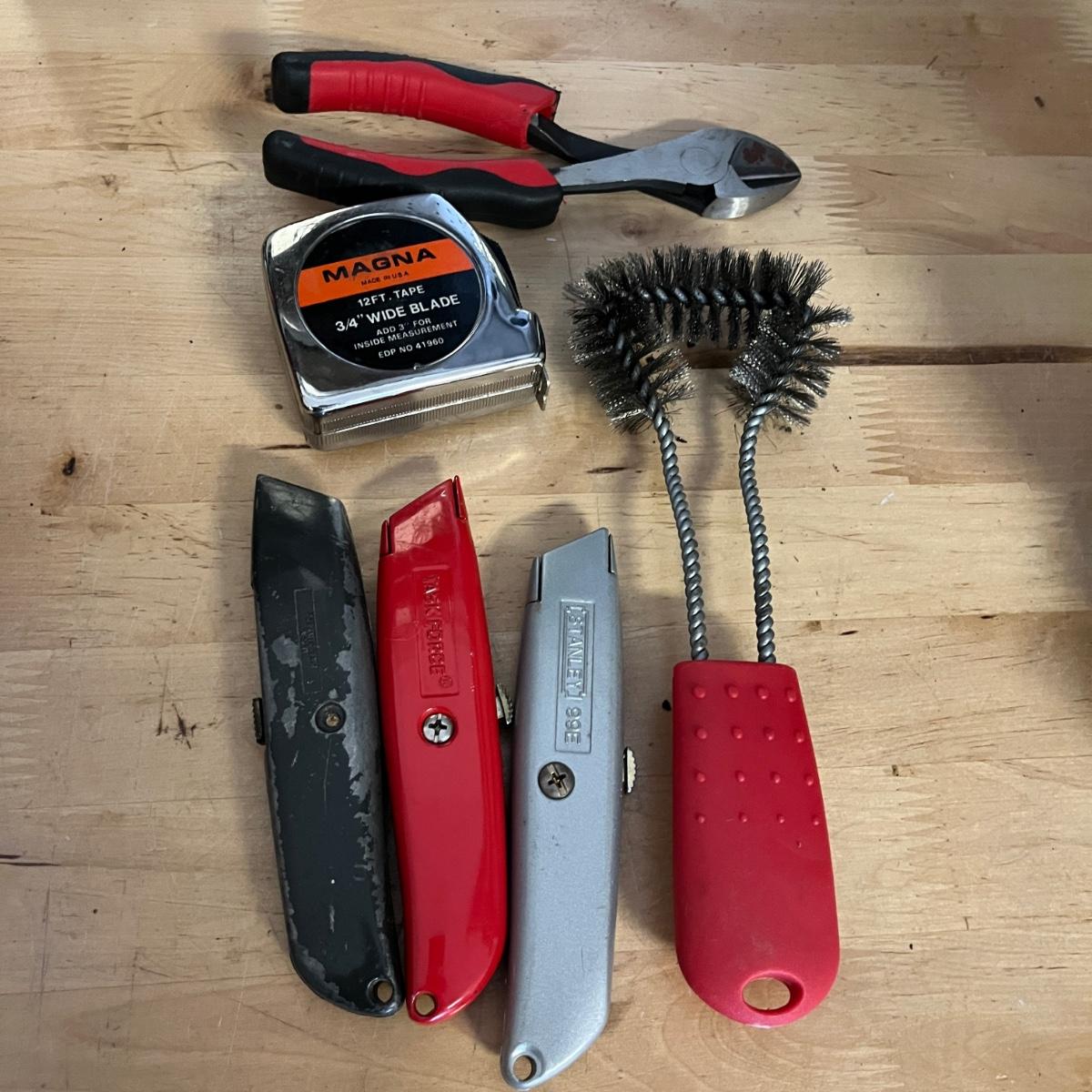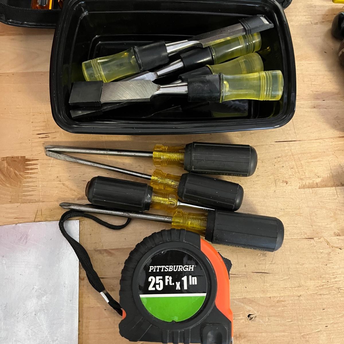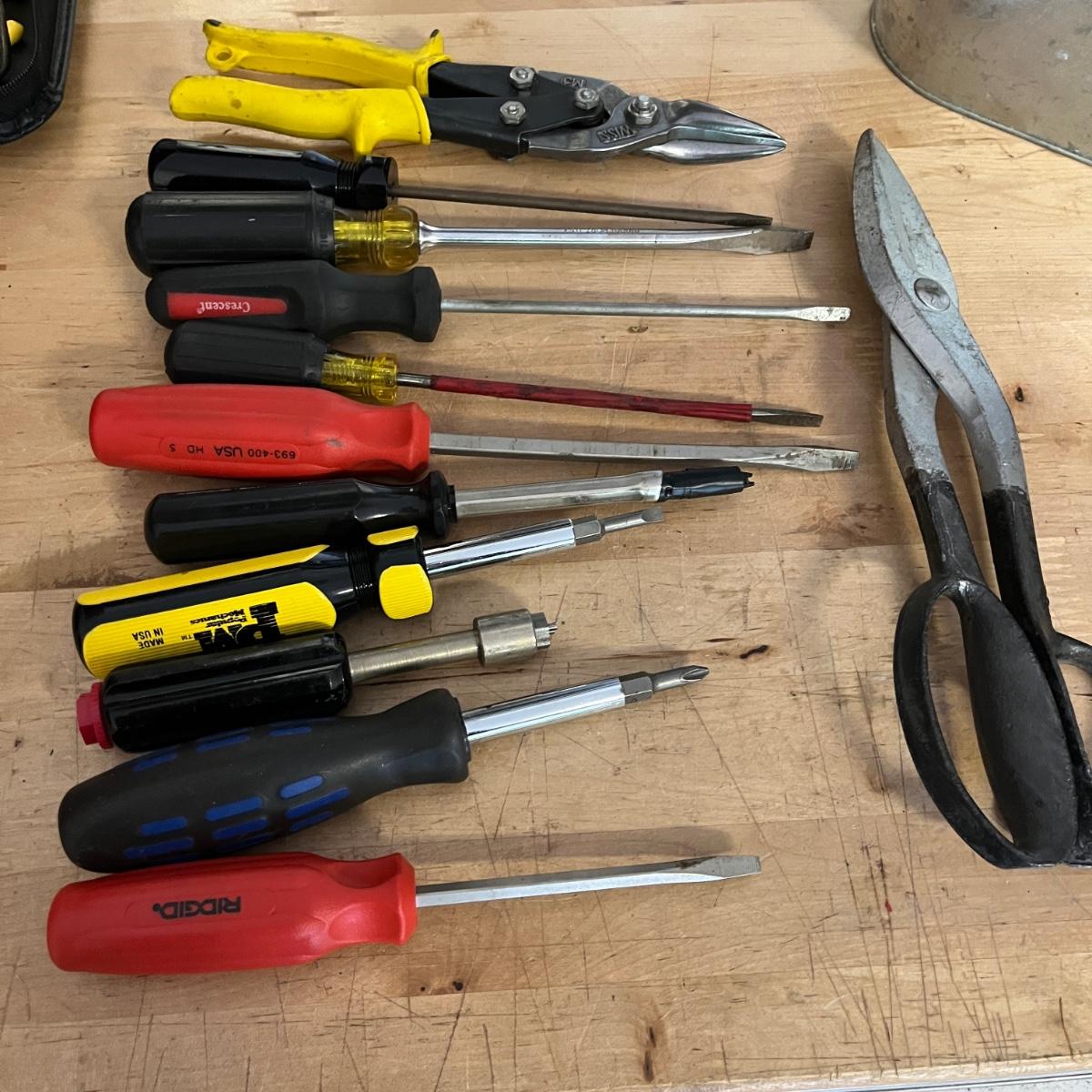 Lot contains a large amount of hand tools including pliers, screwdrivers, pocket knives, measuring tapes, vise, tin snips, wood chisels and more.