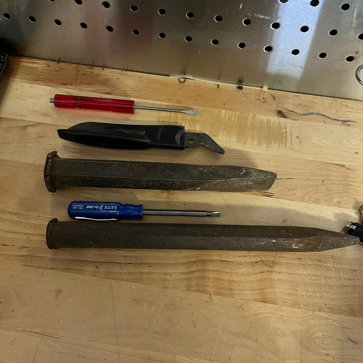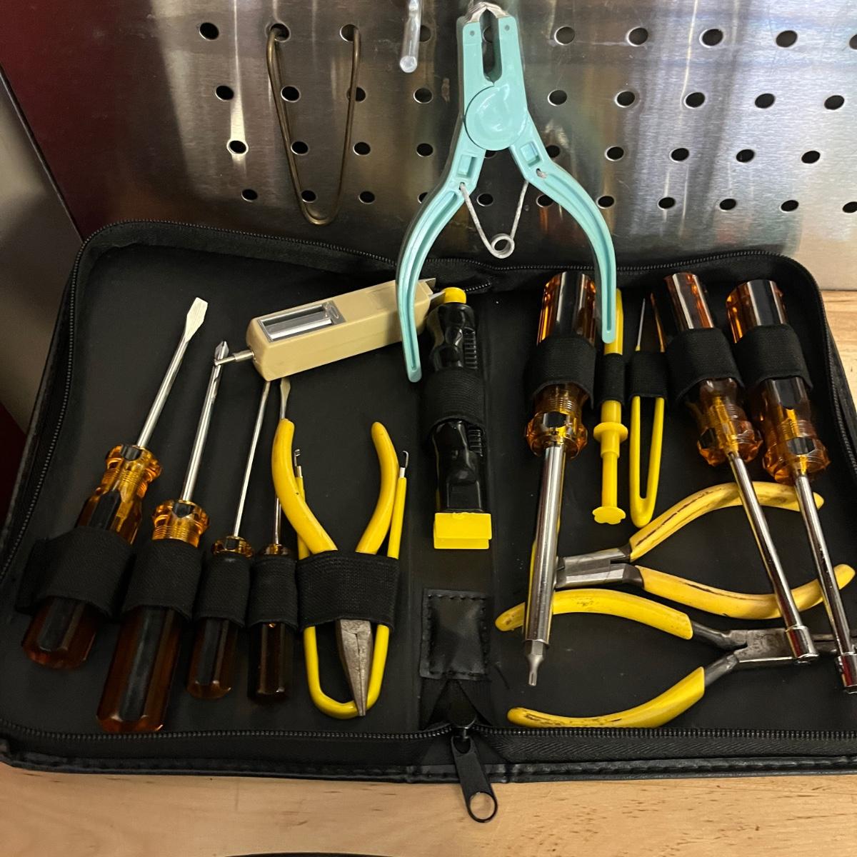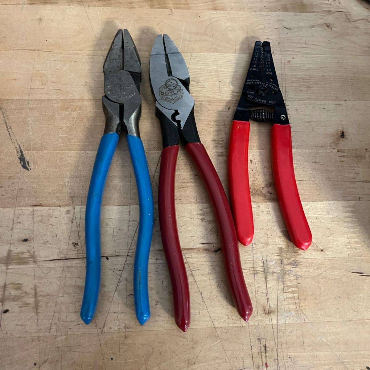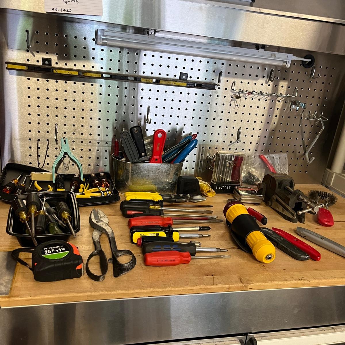 Lot contains a large amount of hand tools including pliers, screwdrivers, pocket knives, measuring tapes, vise, tin snips, wood chisels and more.
