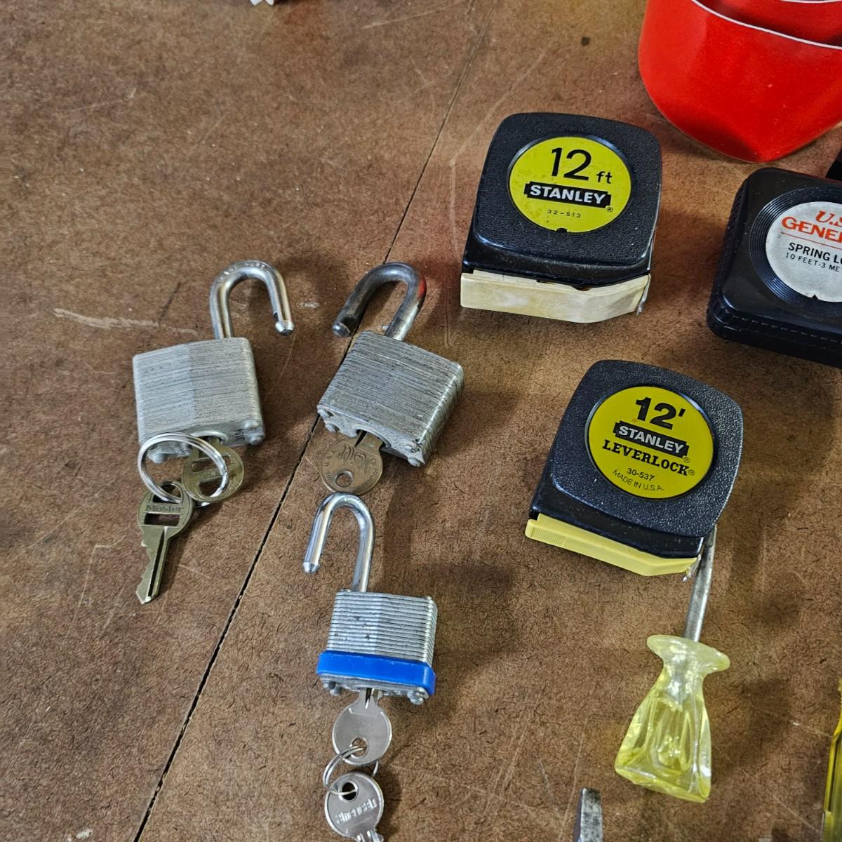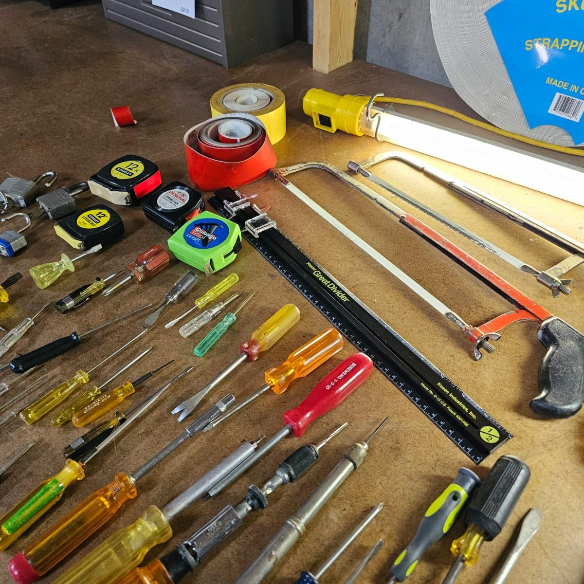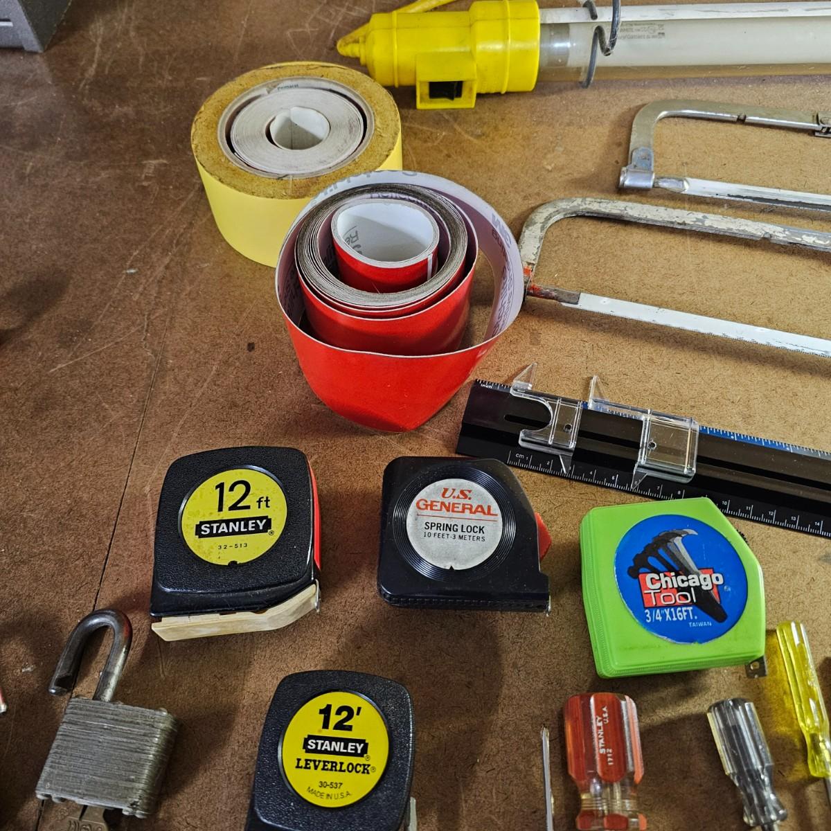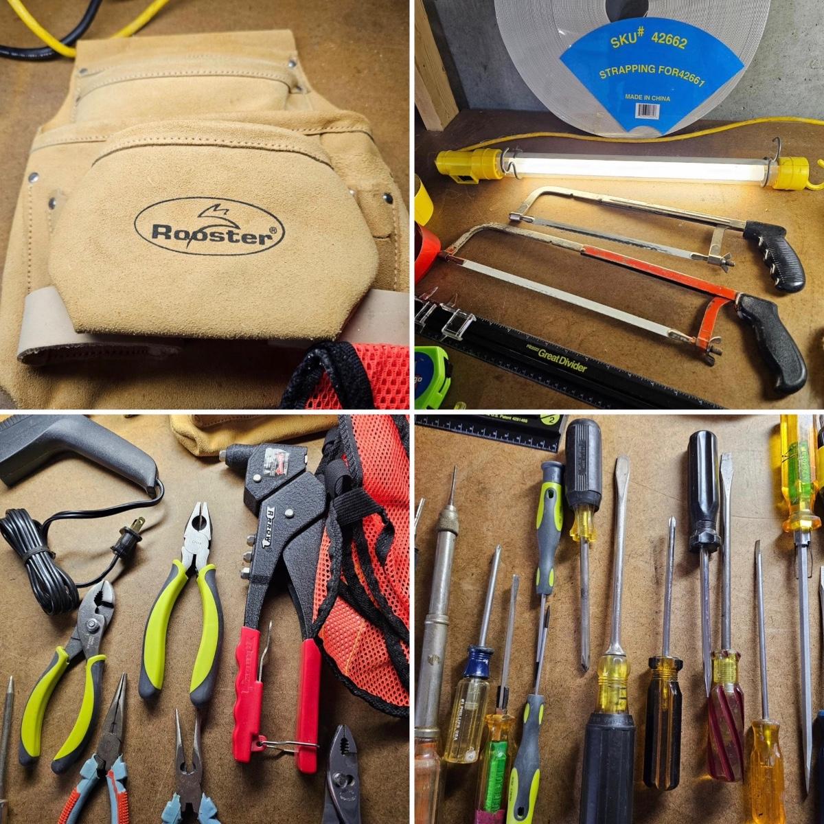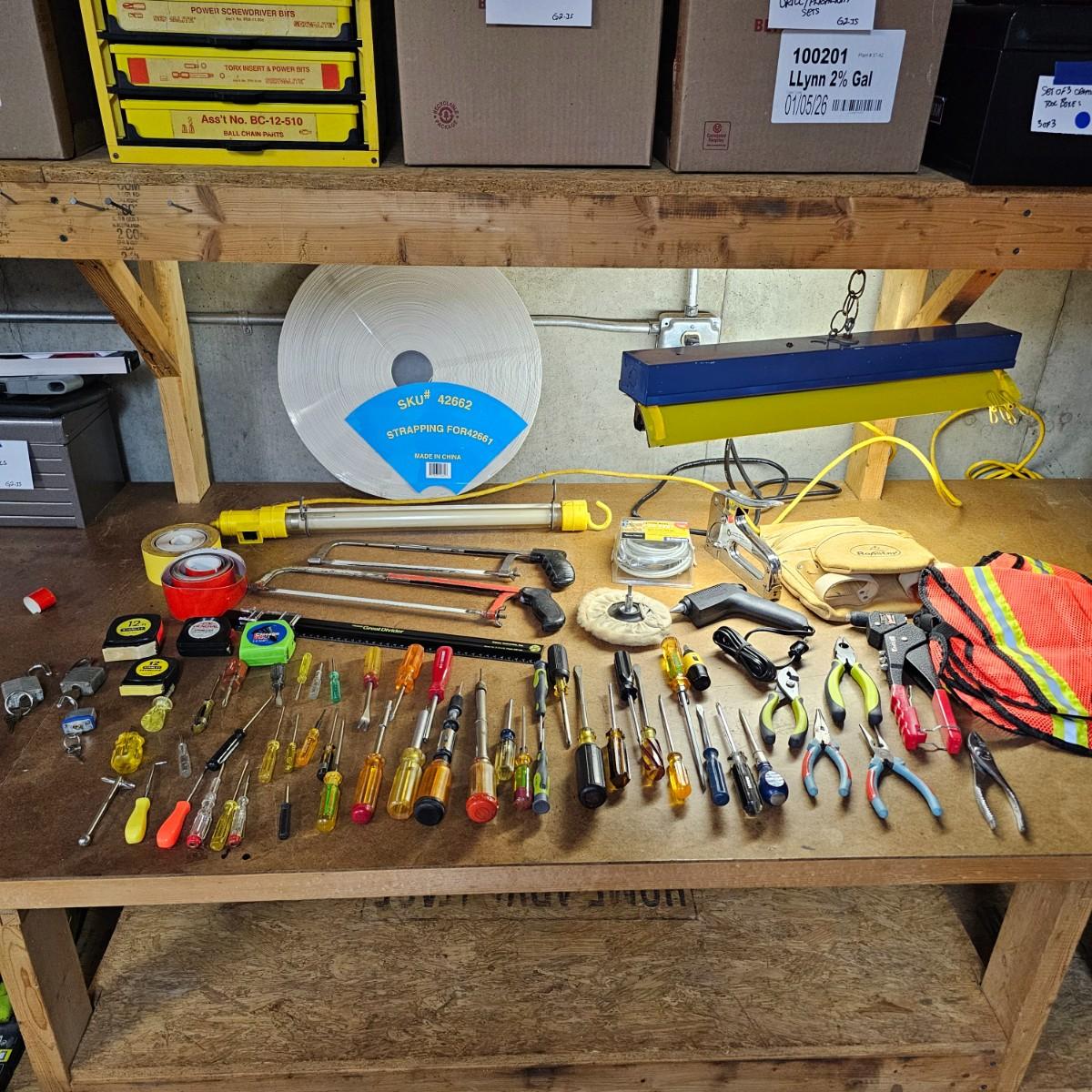 Large assortment of hand tools, screwdrivers, pliers, hacksaw, padlocks, tool pouch, safety vests and more. Two 24" fluorescent lights, one giant flat roll of strapping tape. See photos for details. Local pickup only.