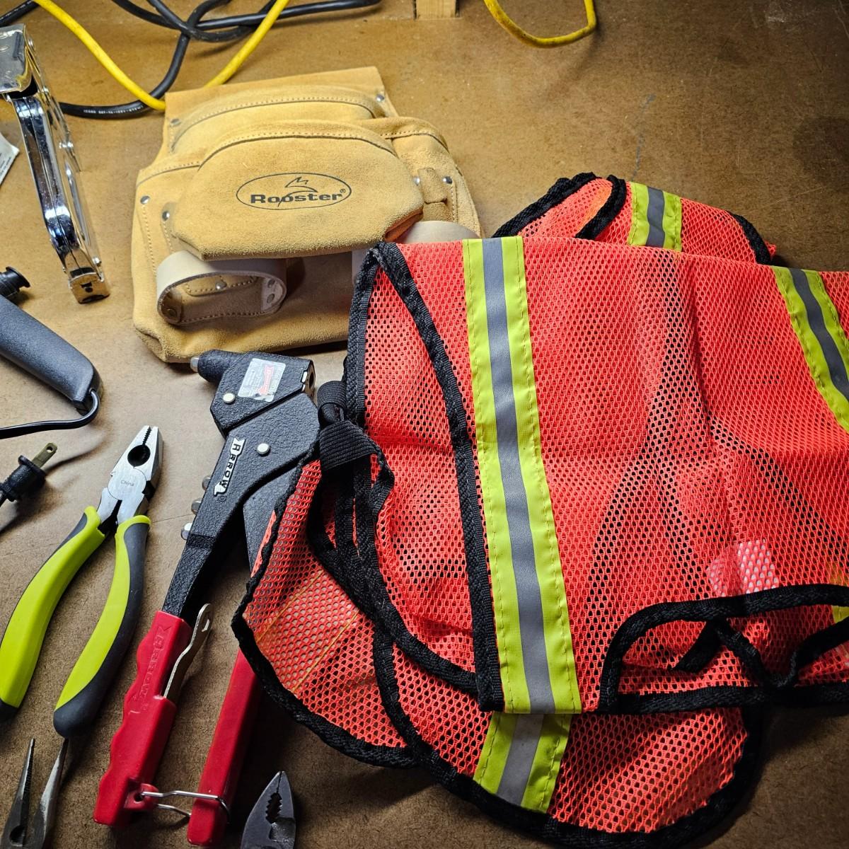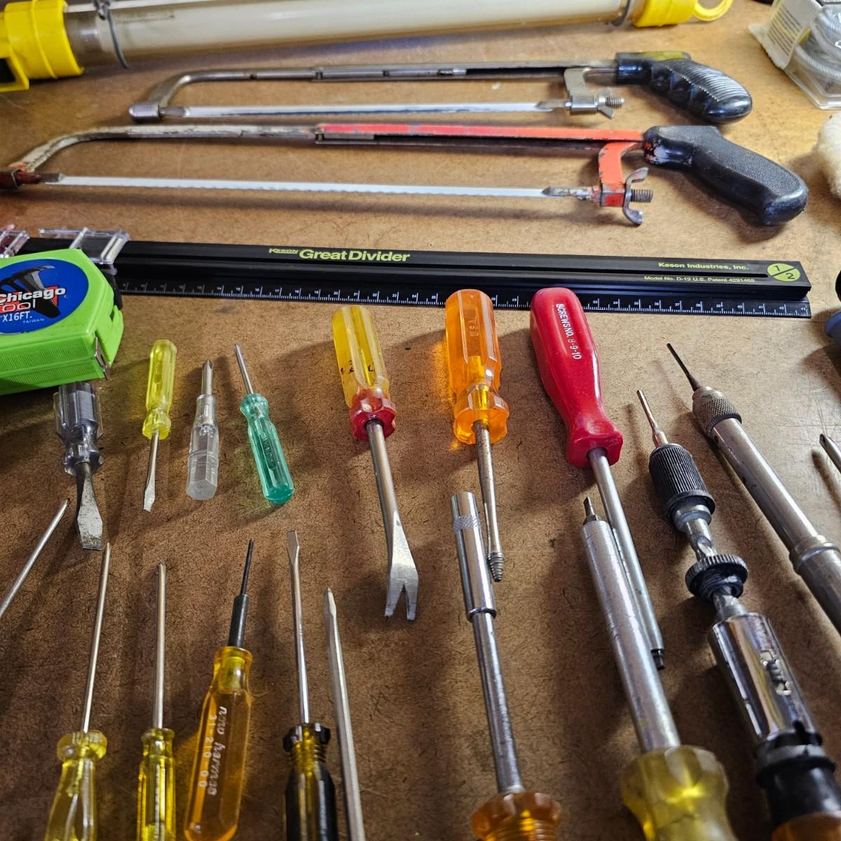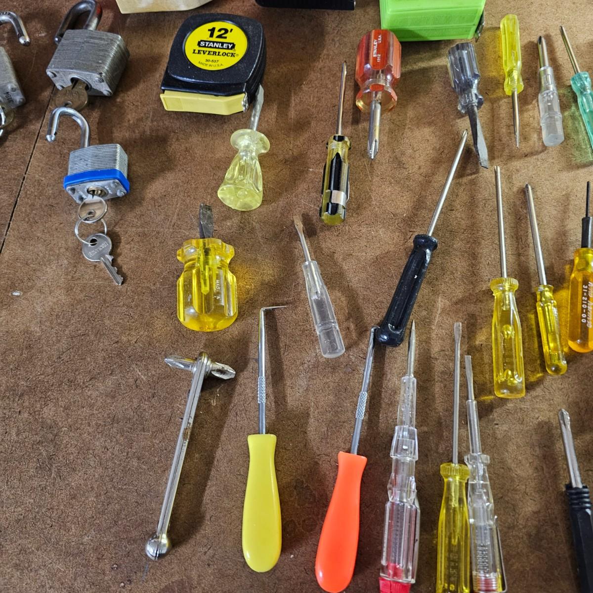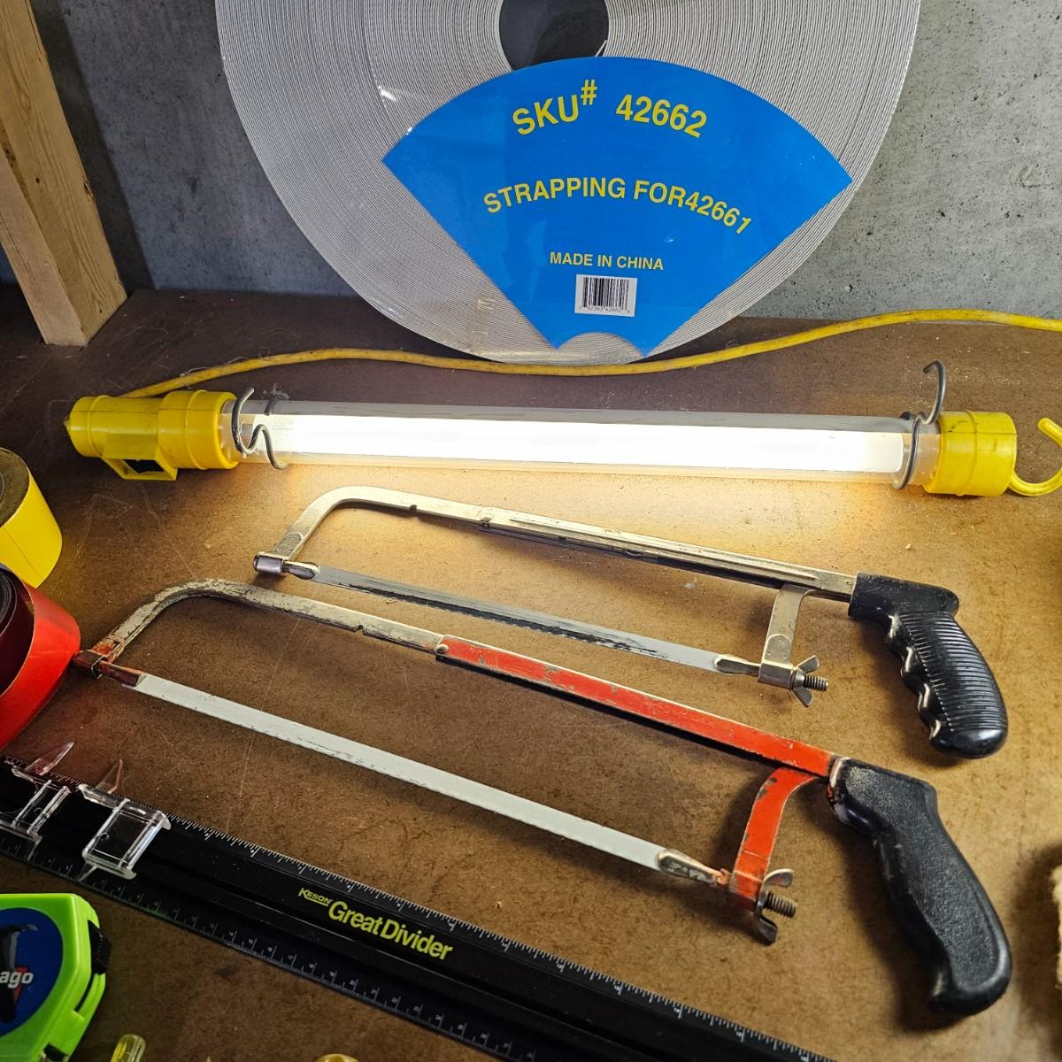Large assortment of hand tools, screwdrivers, pliers, hacksaw, padlocks, tool pouch, safety vests and more. Two 24" fluorescent lights, one giant flat roll of strapping tape. See photos for details. Local pickup only.