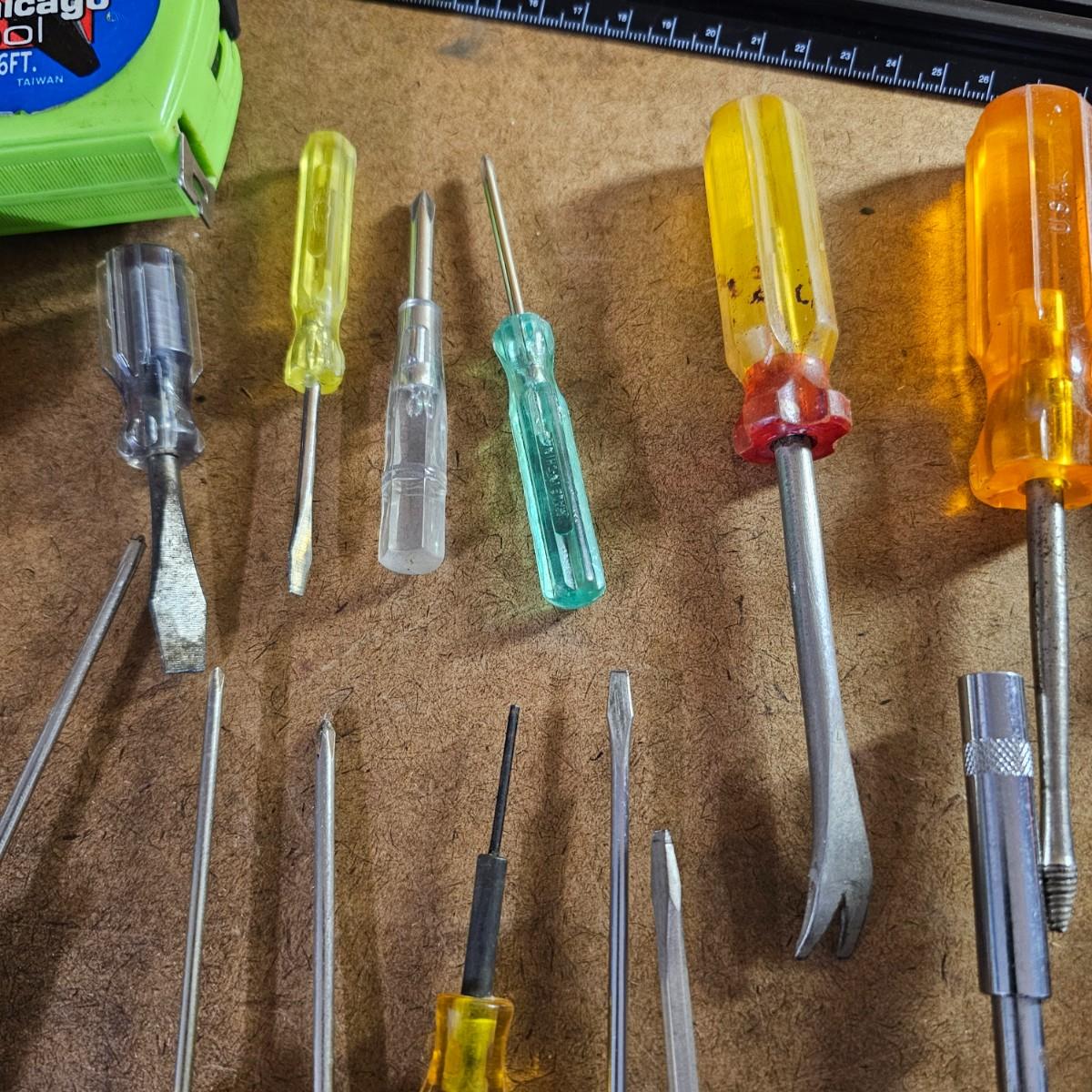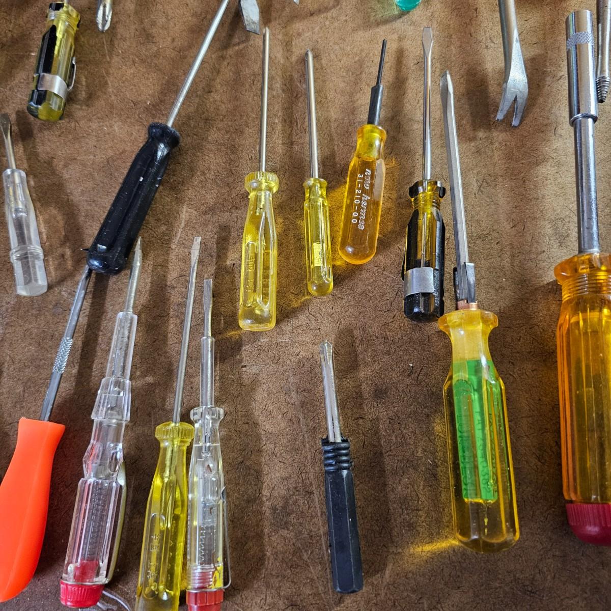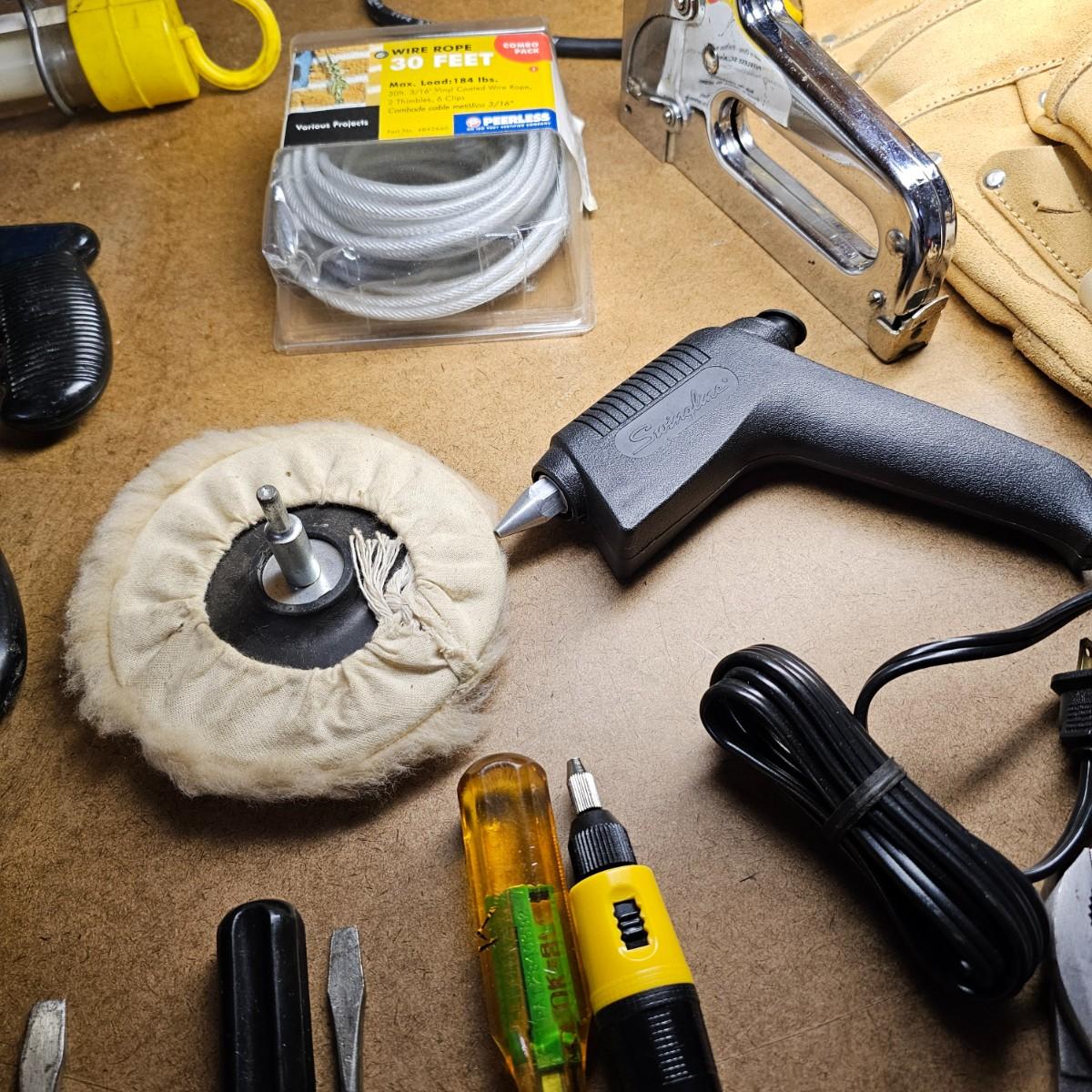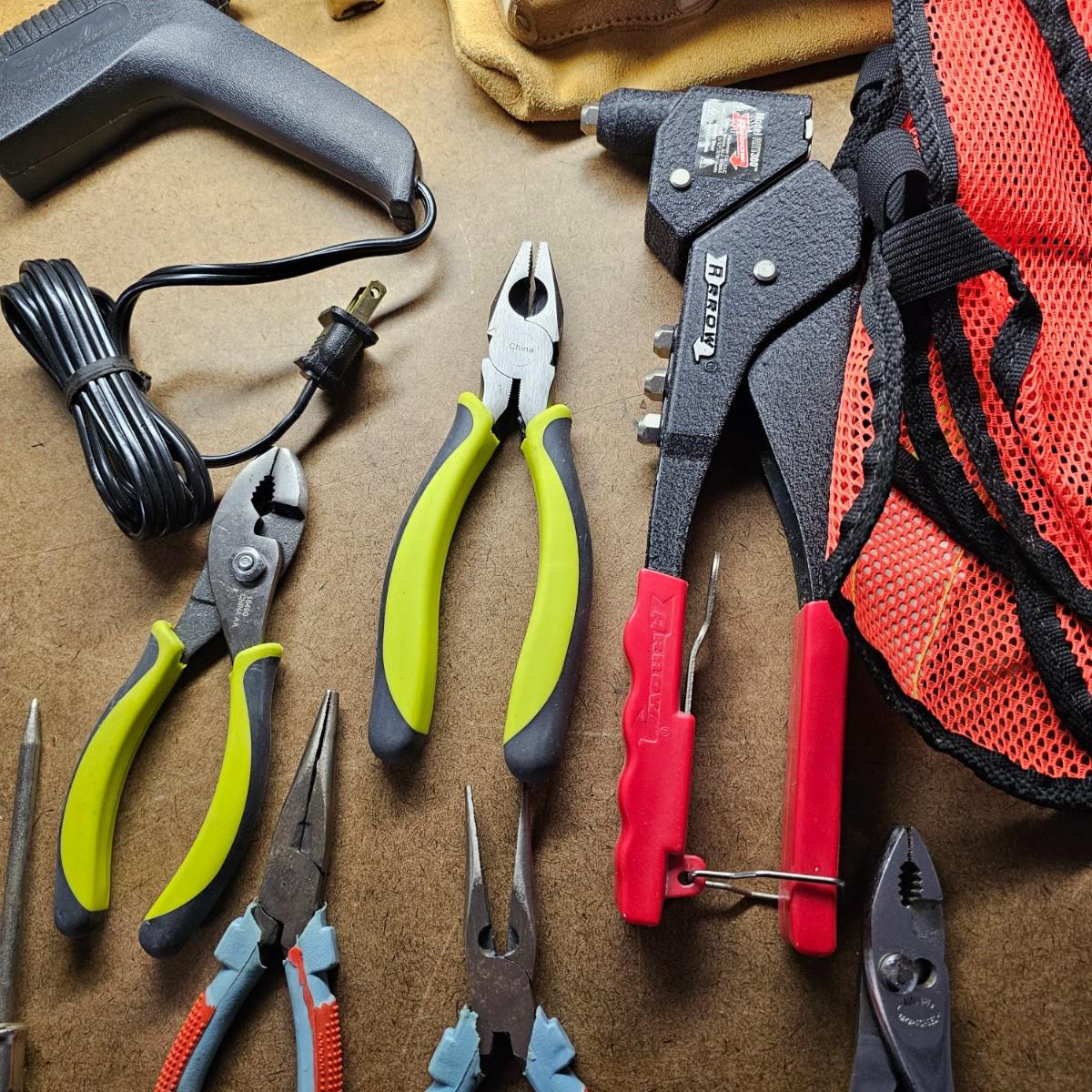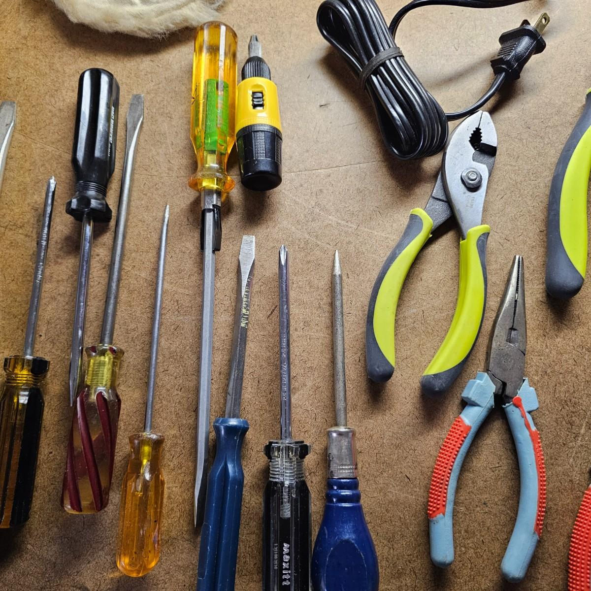 Large assortment of hand tools, screwdrivers, pliers, hacksaw, padlocks, tool pouch, safety vests and more. Two 24" fluorescent lights, one giant flat roll of strapping tape. See photos for details. Local pickup only.