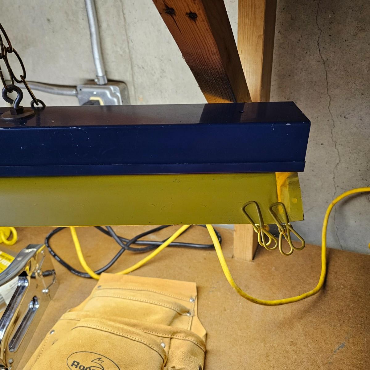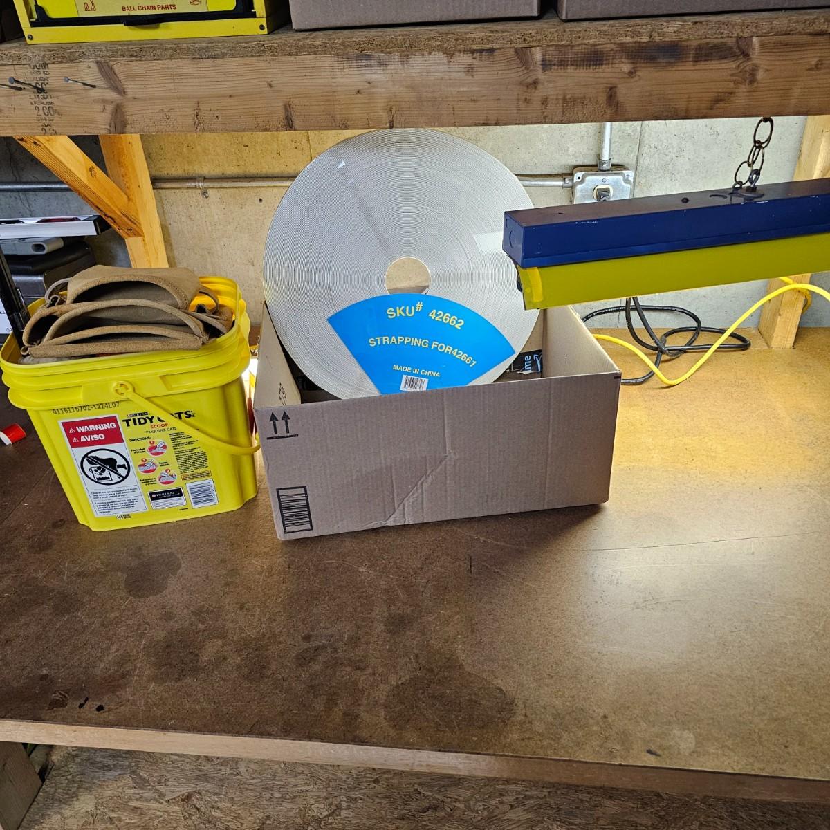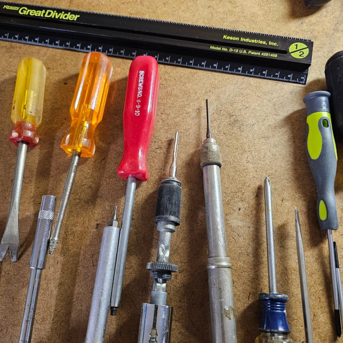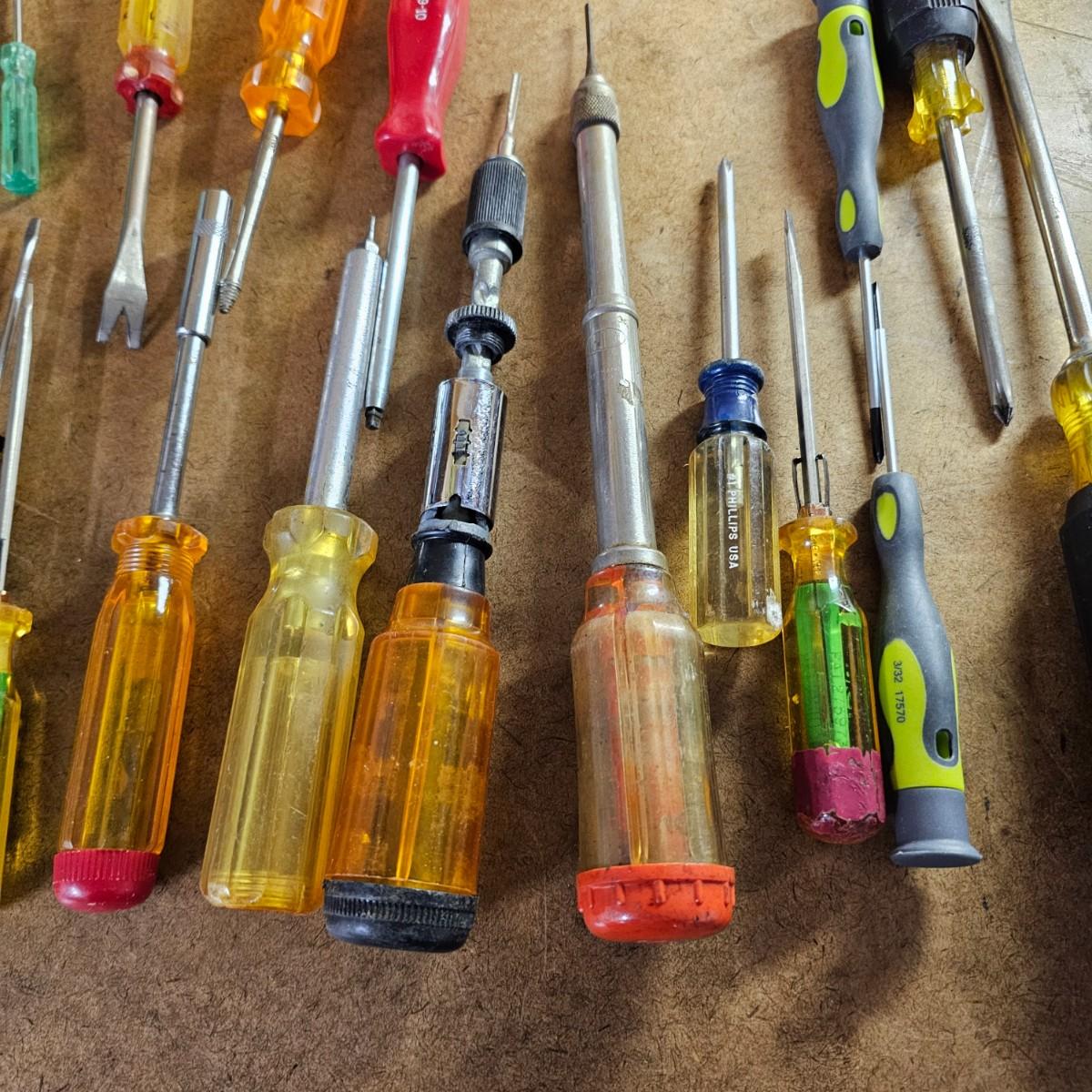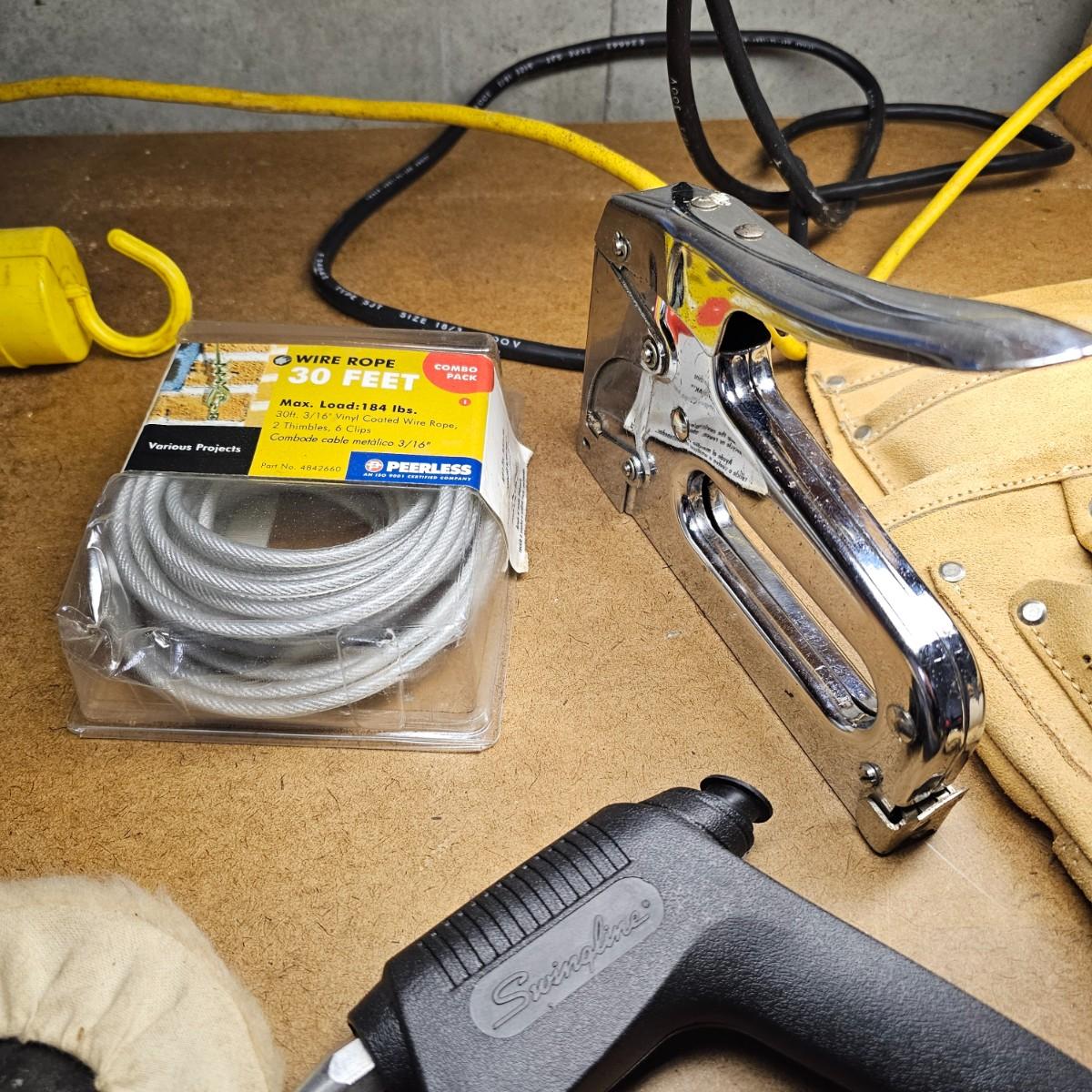 Large assortment of hand tools, screwdrivers, pliers, hacksaw, padlocks, tool pouch, safety vests and more. Two 24" fluorescent lights, one giant flat roll of strapping tape. See photos for details. Local pickup only.
