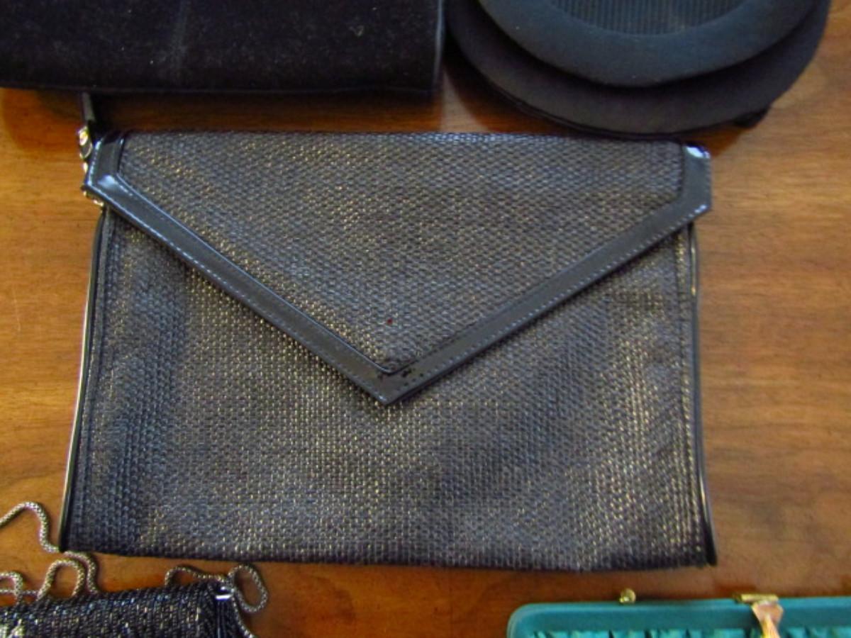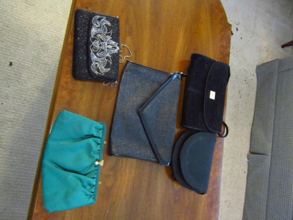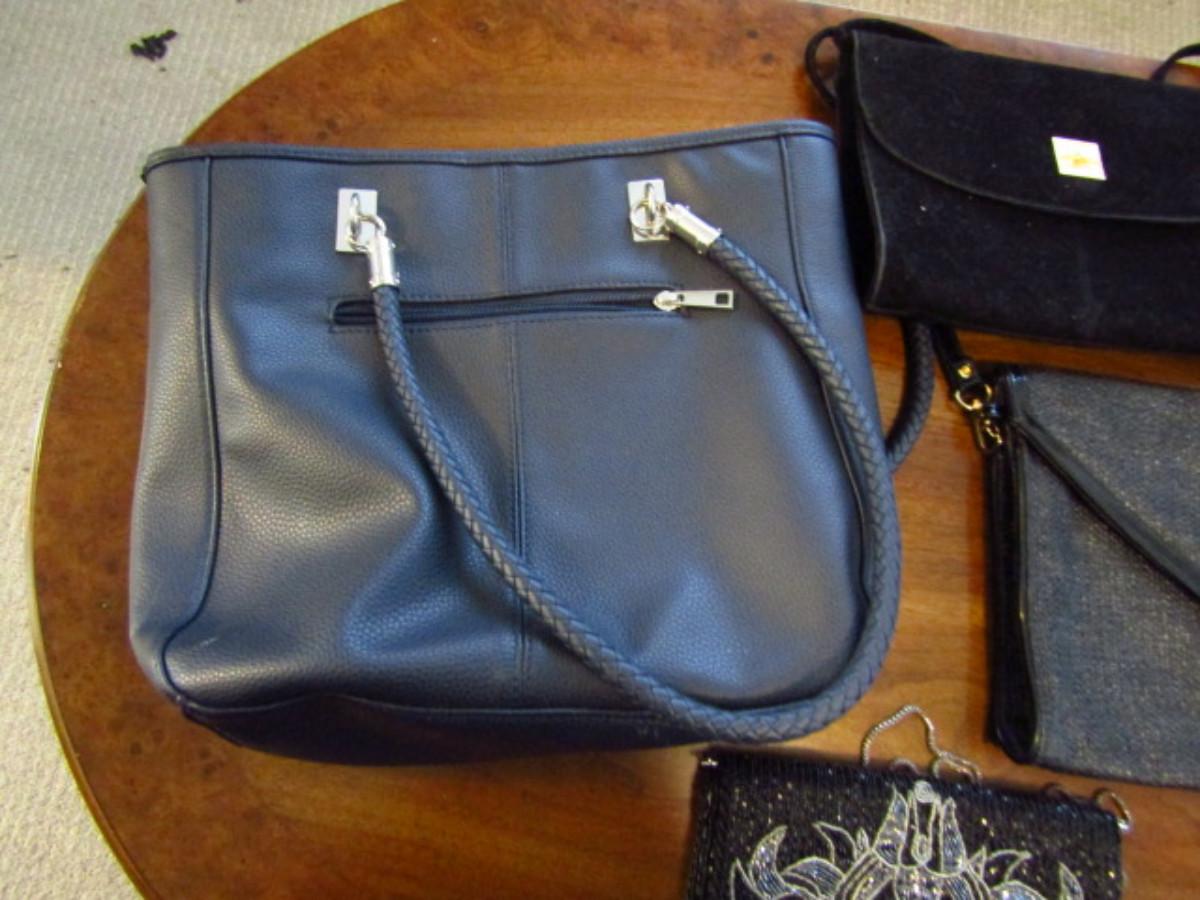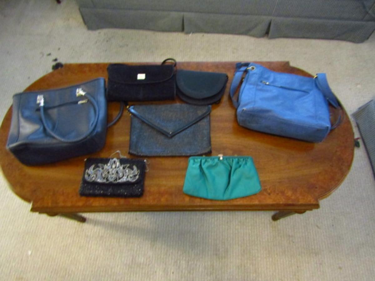 Collection of Handbags. Only one is marked with maker- light blue one is Bueno. Dark blue one is leather. One evening bag is beaded.