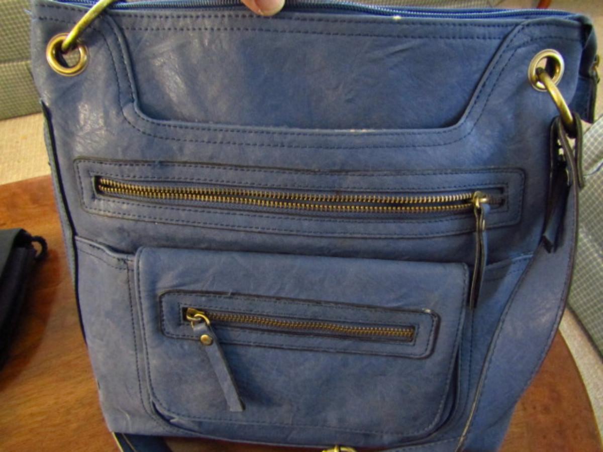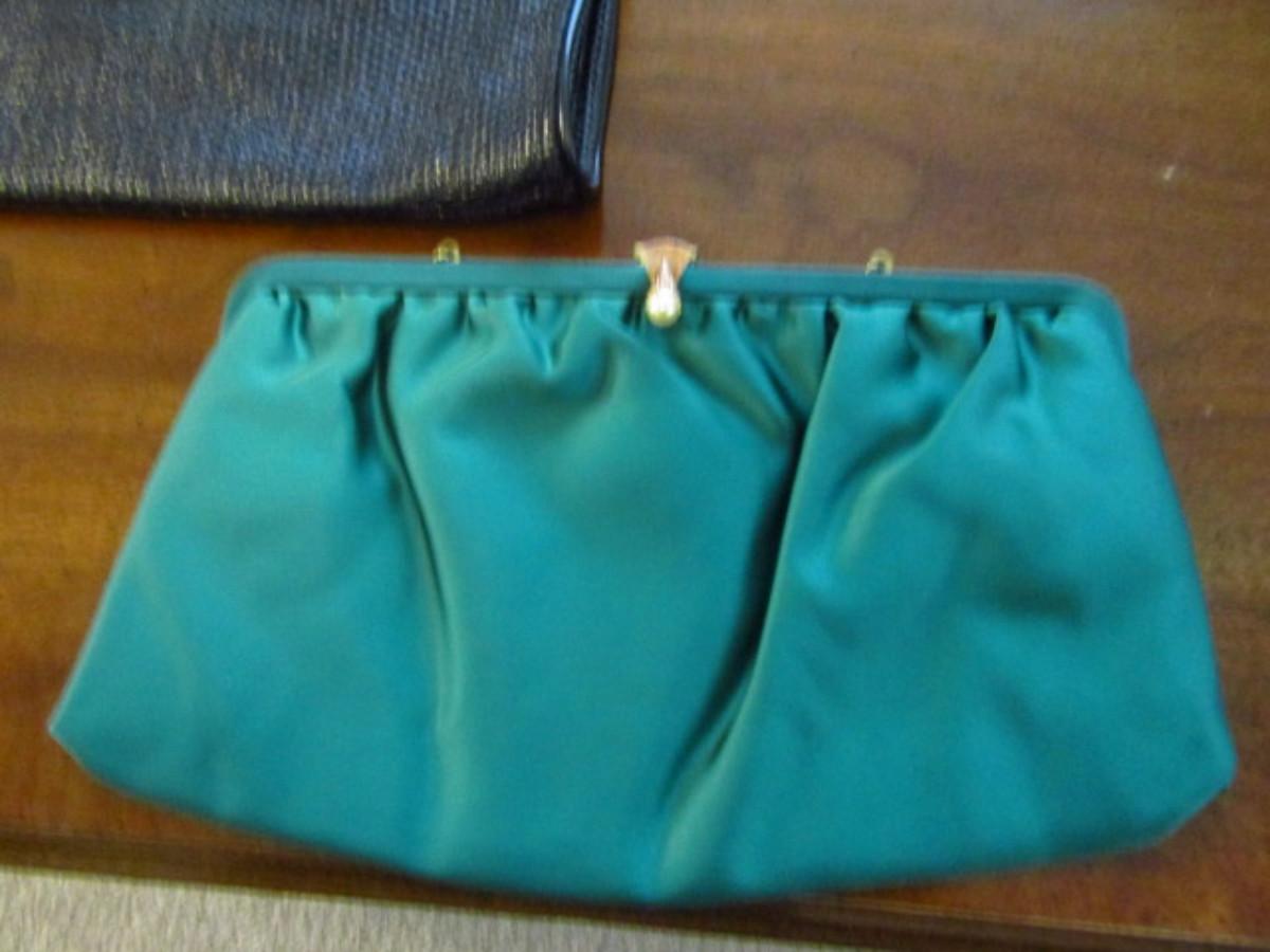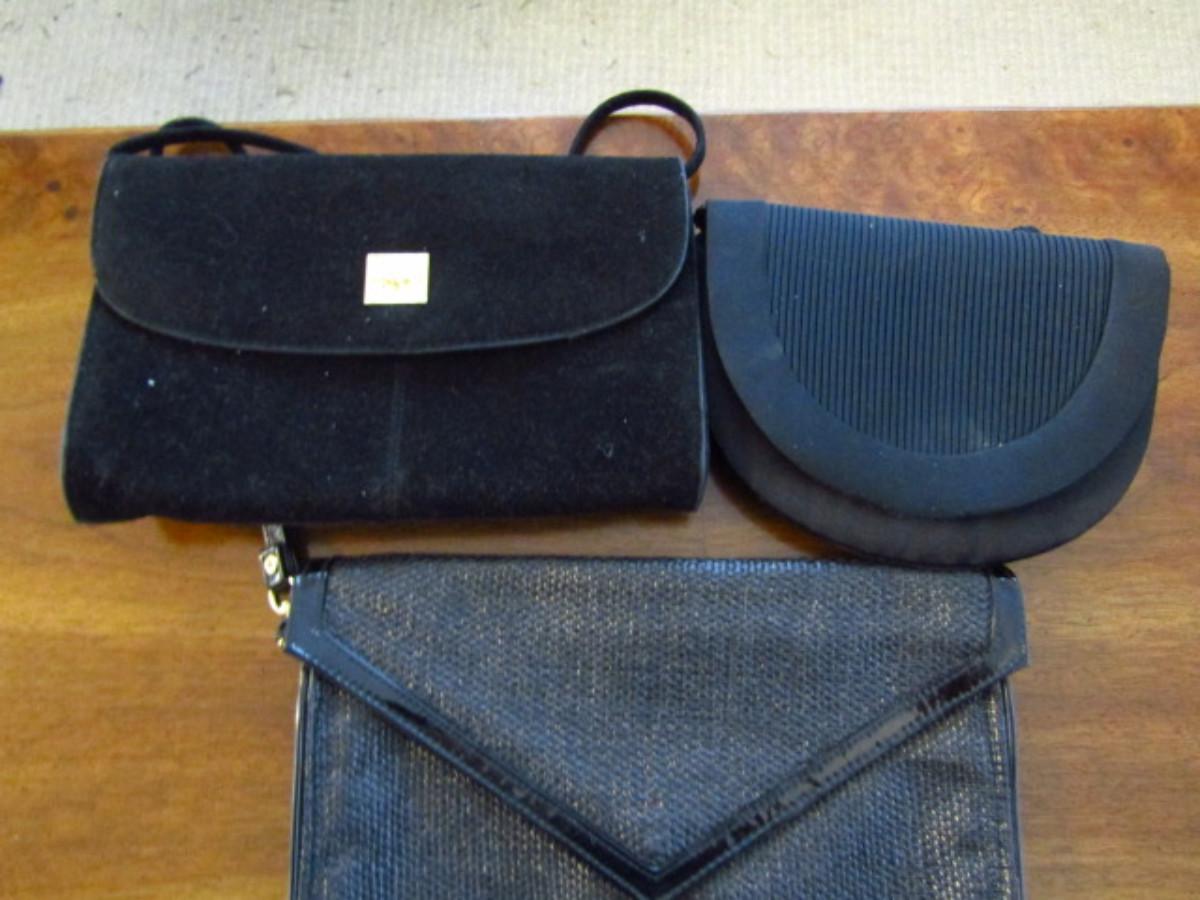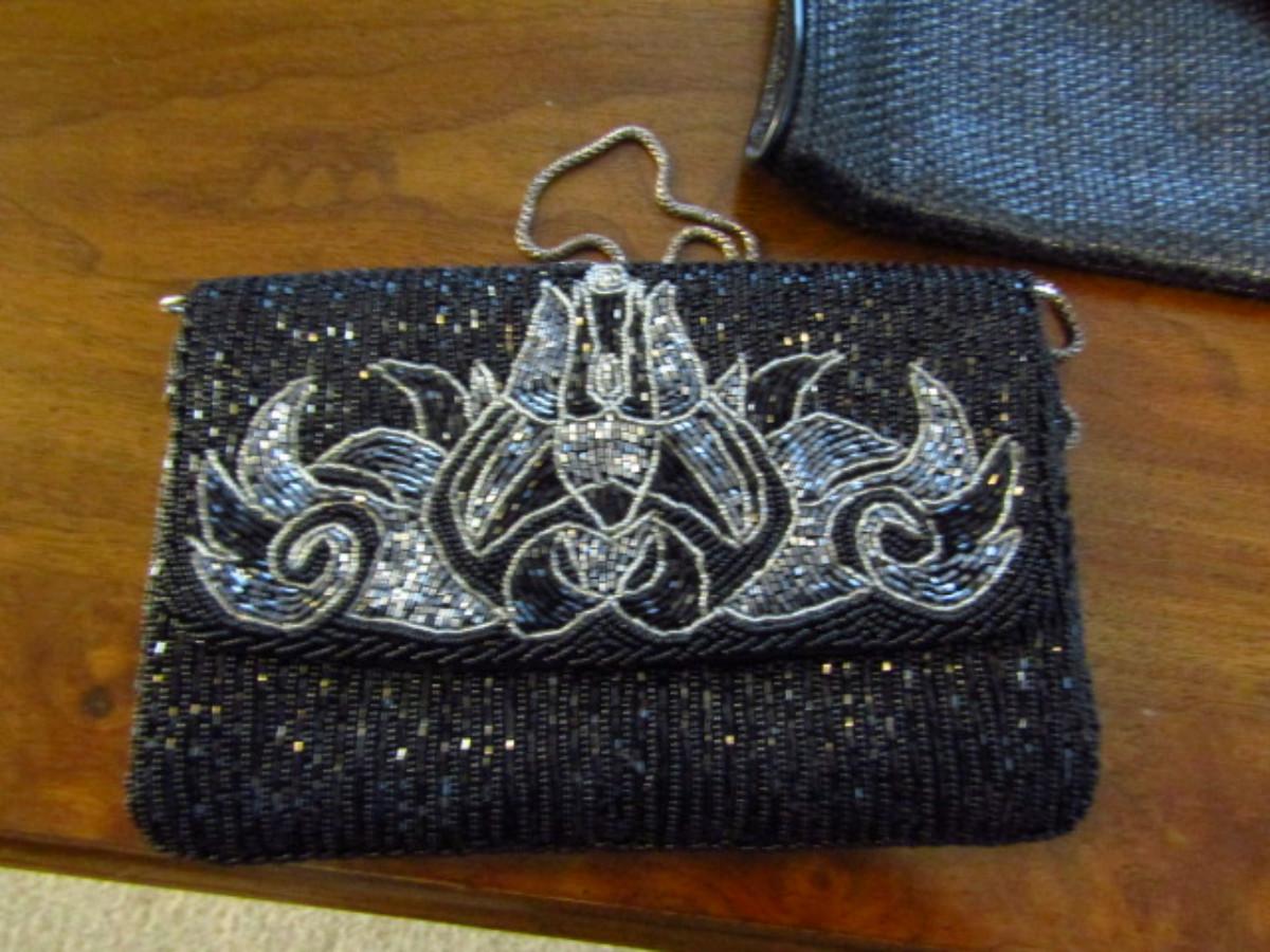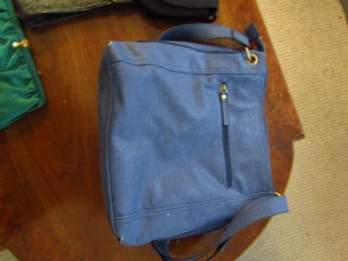 Collection of Handbags. Only one is marked with maker- light blue one is Bueno. Dark blue one is leather. One evening bag is beaded.