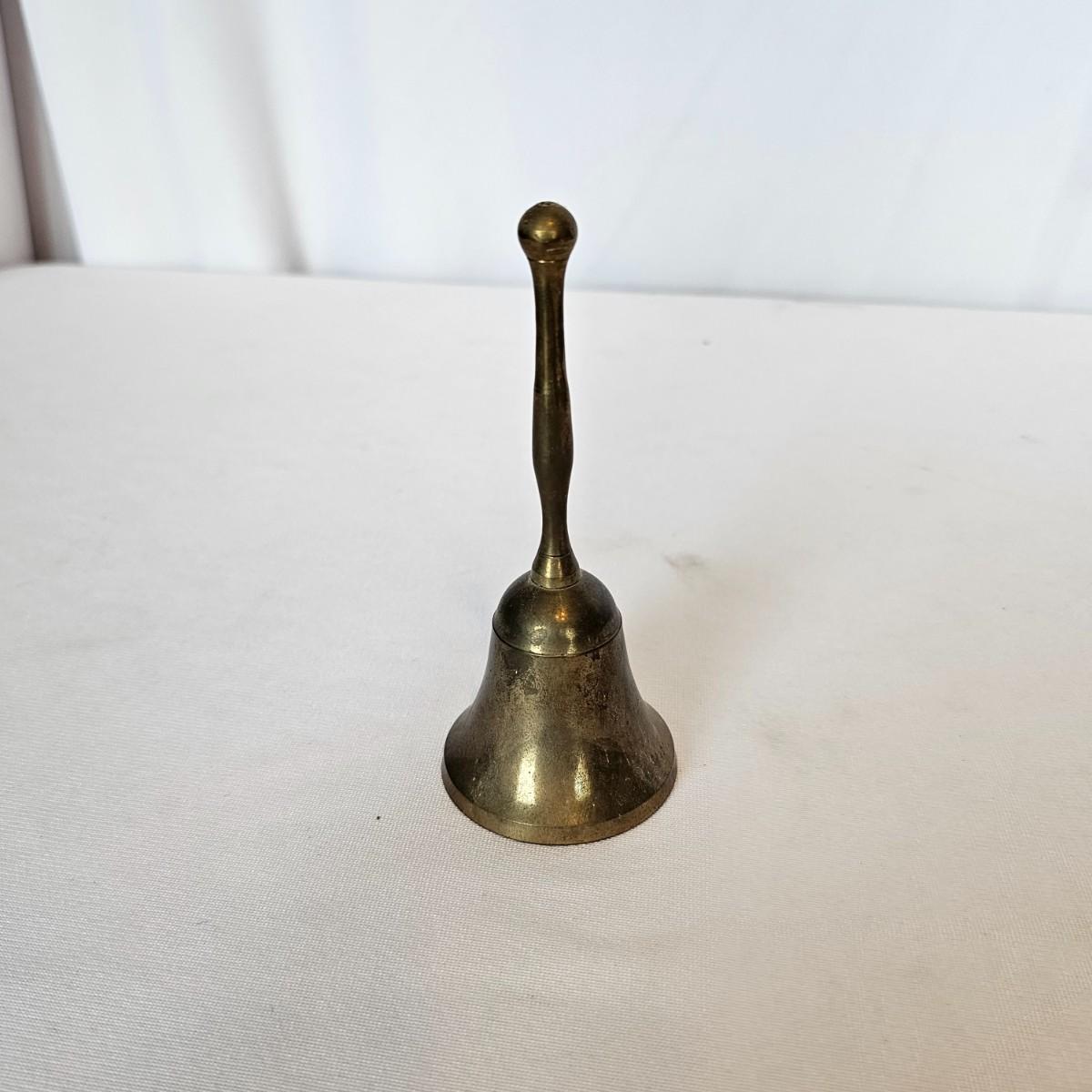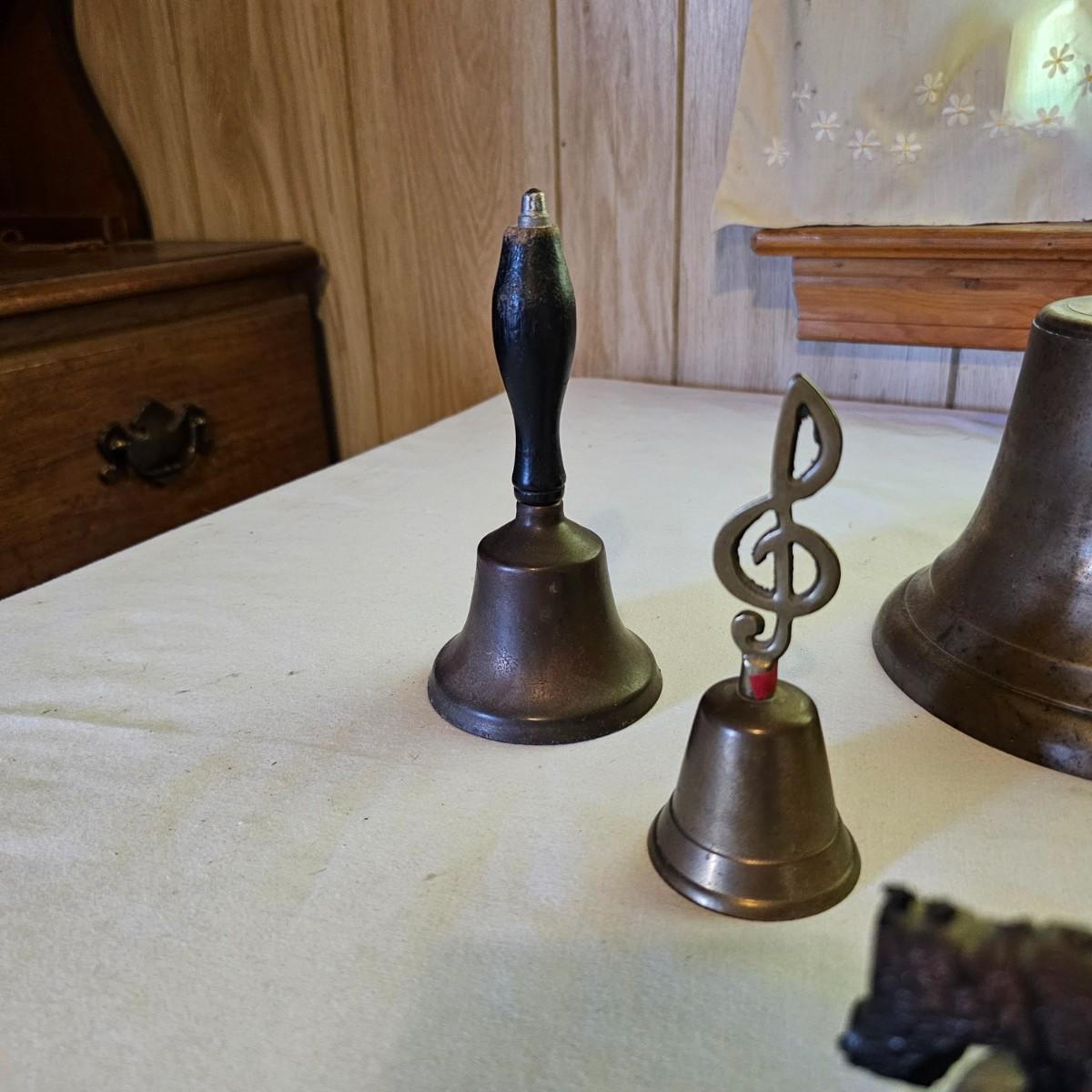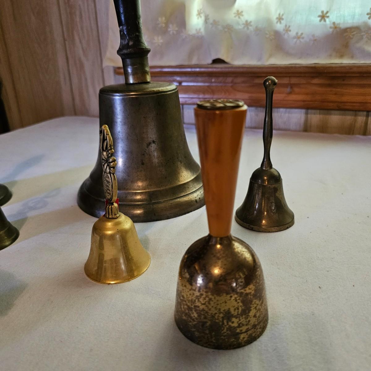 Seven different handbells and sizes. Five are brass, two are steel. Largest bell with wood handle is 6.5"D x 10"H. Smallest one is 2.5"D x 3"H. Handle on large bell is loose. See photos for details. Shipping available.