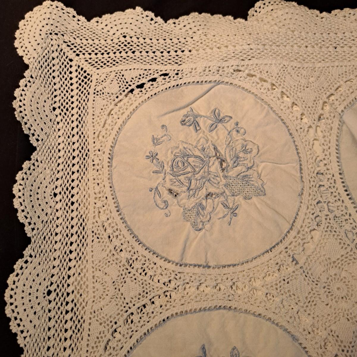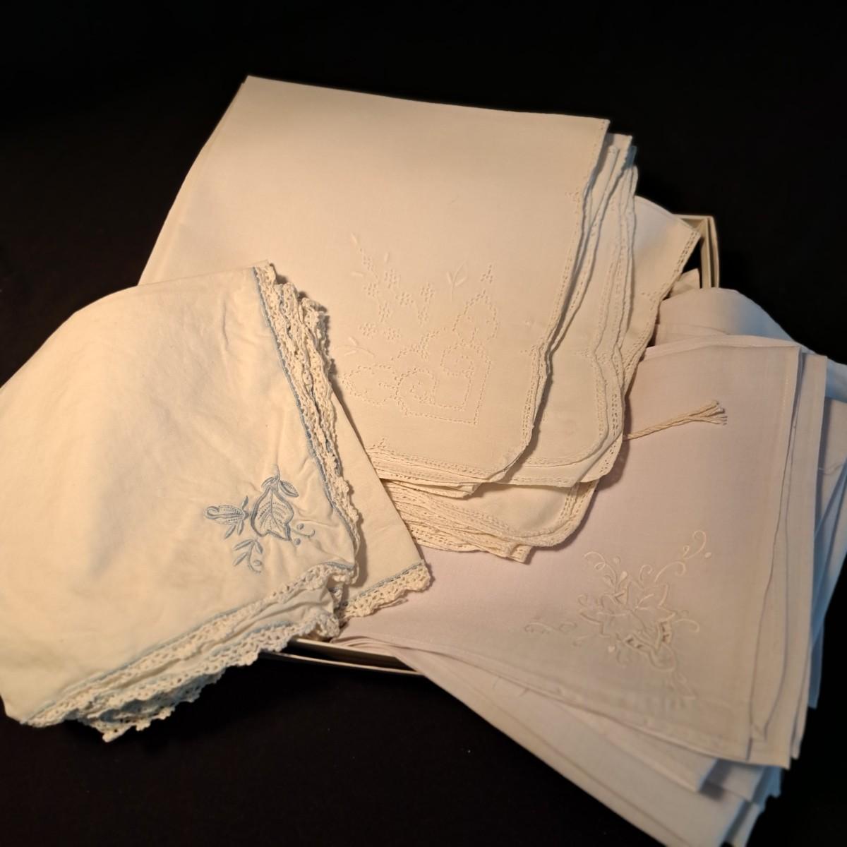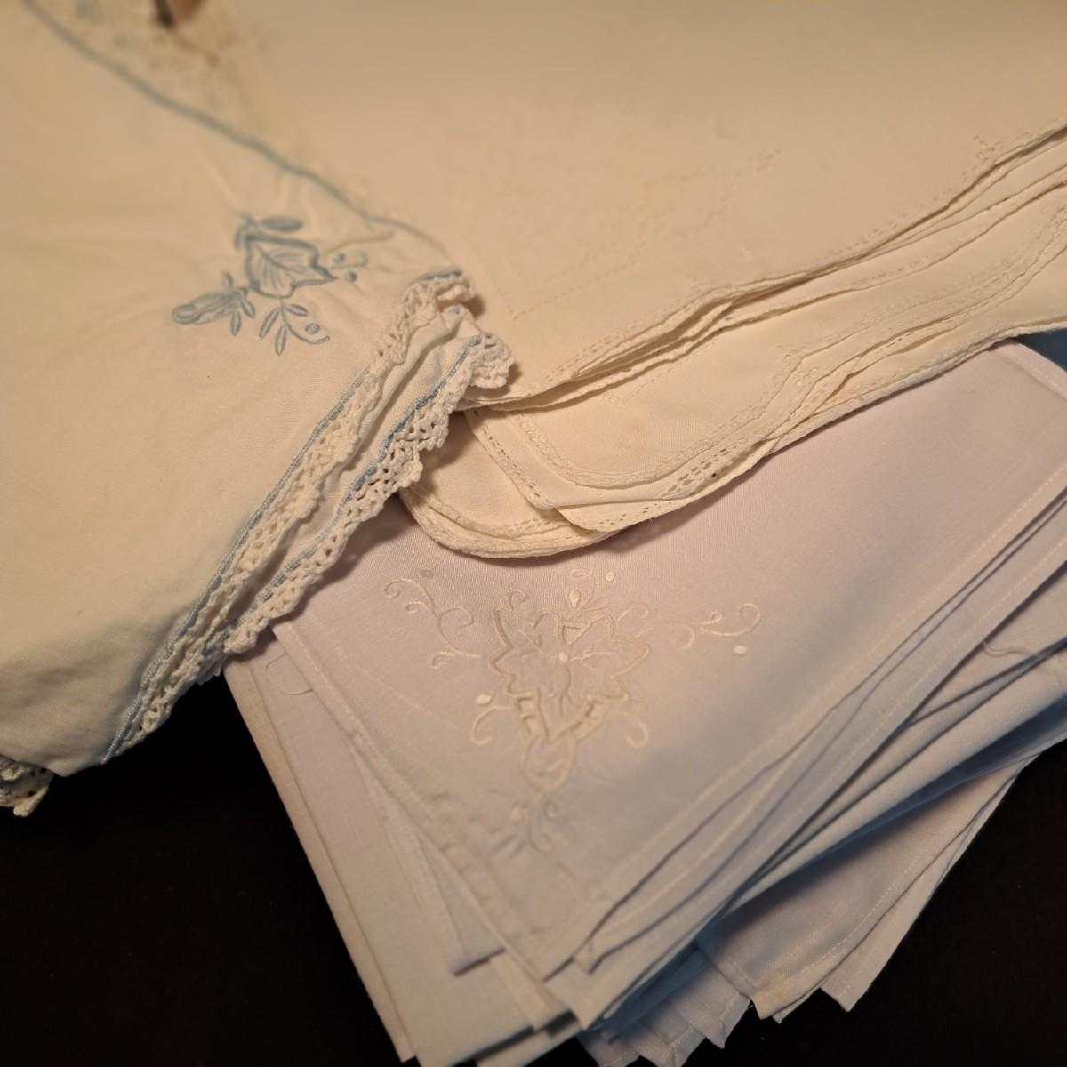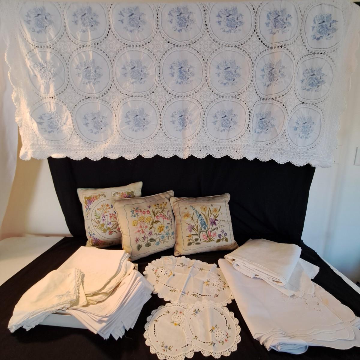 Lovely vintage linen lot includes three-hand embroidered crewel linen pillows, approximately 13" x 14" (*backs of two pillows have faint brown stains as shown), a pale blue and white hand-embroidered and crocheted tablecloth 68" x 80" with scalloped edge and three matching napkins (*faint yellow stains on each), three different styles of embroidered linen napkins, a three-piece embroidered centerpiece set 7.5"D to 16"L, and two approximately 64" x 100" white linen tablecloths. A very few faint brown stains present on tablecloths. Shipping available. Shipping can be costly. We suggest contacting our preferred local shipping provider, Postage Express, with dimensions and getting an estimate before bidding: (828) 255-9250 or shipping@postageexpressnc.com.