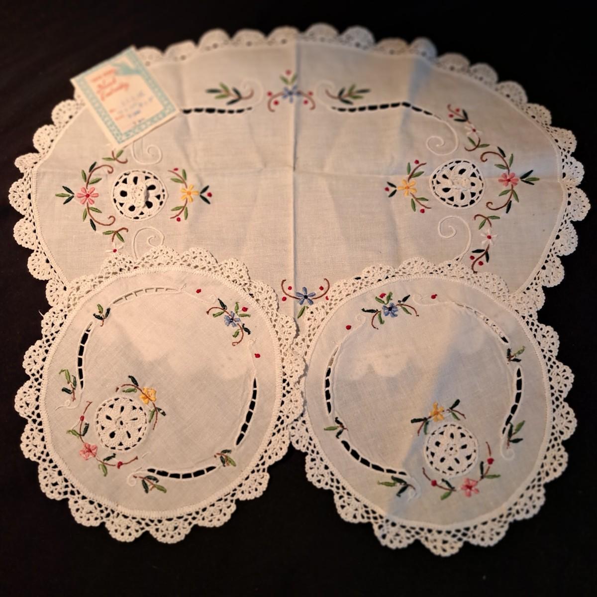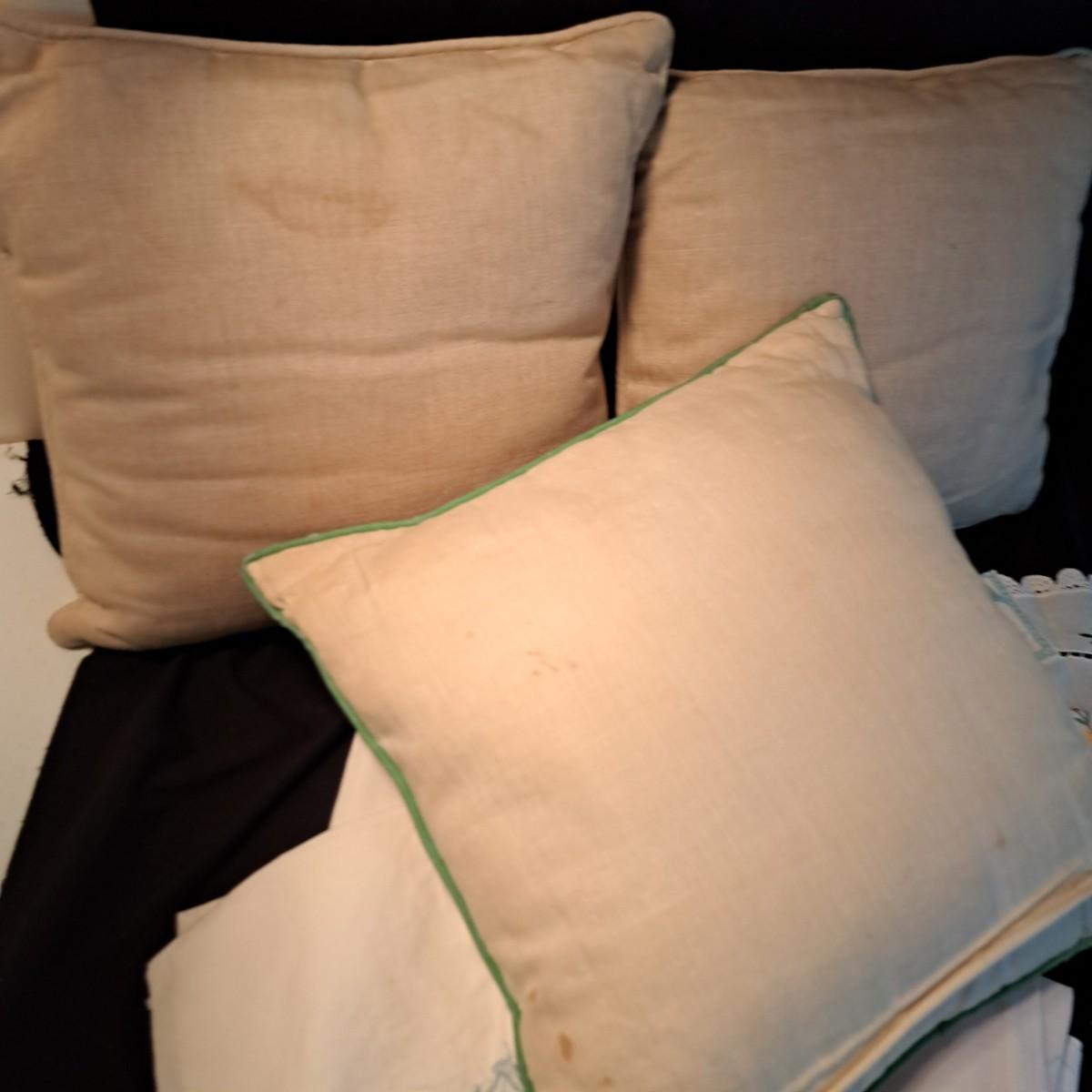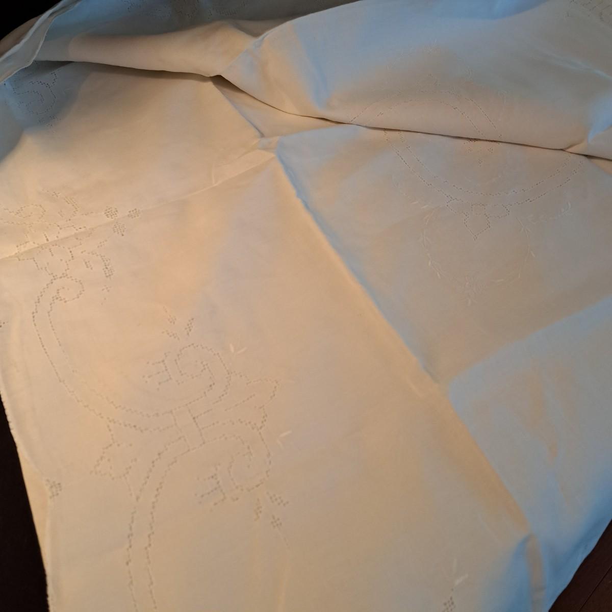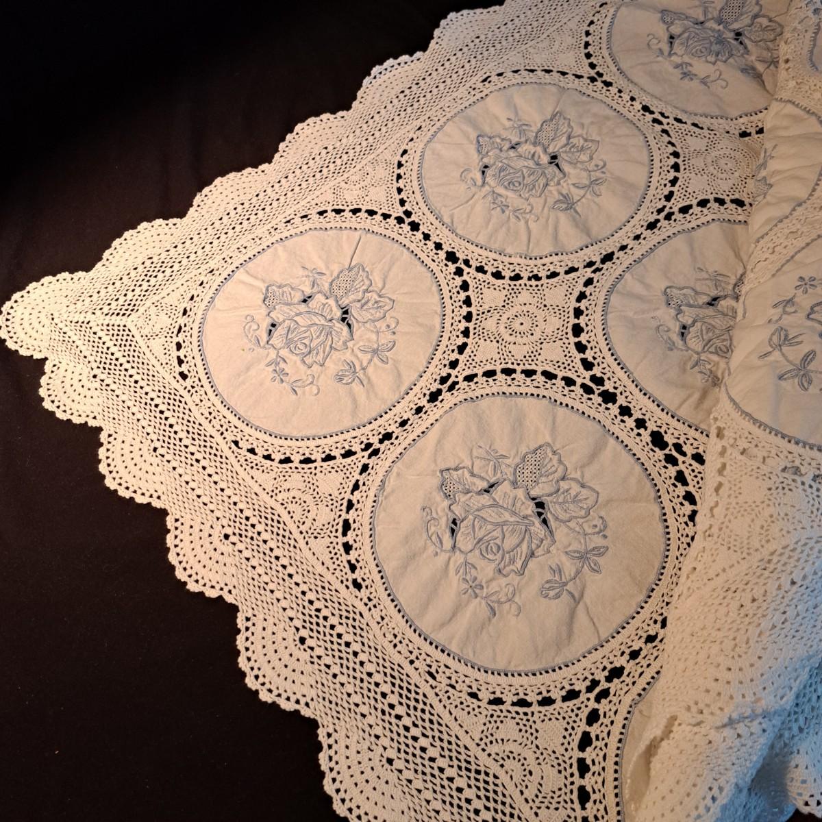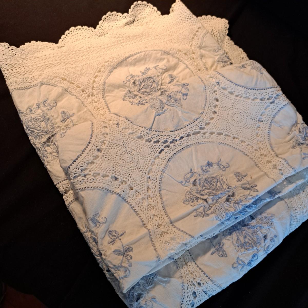 Lovely vintage linen lot includes three-hand embroidered crewel linen pillows, approximately 13" x 14" (*backs of two pillows have faint brown stains as shown), a pale blue and white hand-embroidered and crocheted tablecloth 68" x 80" with scalloped edge and three matching napkins (*faint yellow stains on each), three different styles of embroidered linen napkins, a three-piece embroidered centerpiece set 7.5"D to 16"L, and two approximately 64" x 100" white linen tablecloths. A very few faint brown stains present on tablecloths. Shipping available. Shipping can be costly. We suggest contacting our preferred local shipping provider, Postage Express, with dimensions and getting an estimate before bidding: (828) 255-9250 or shipping@postageexpressnc.com.