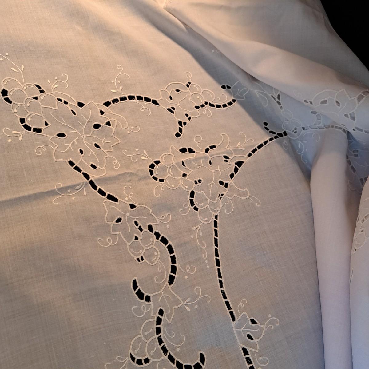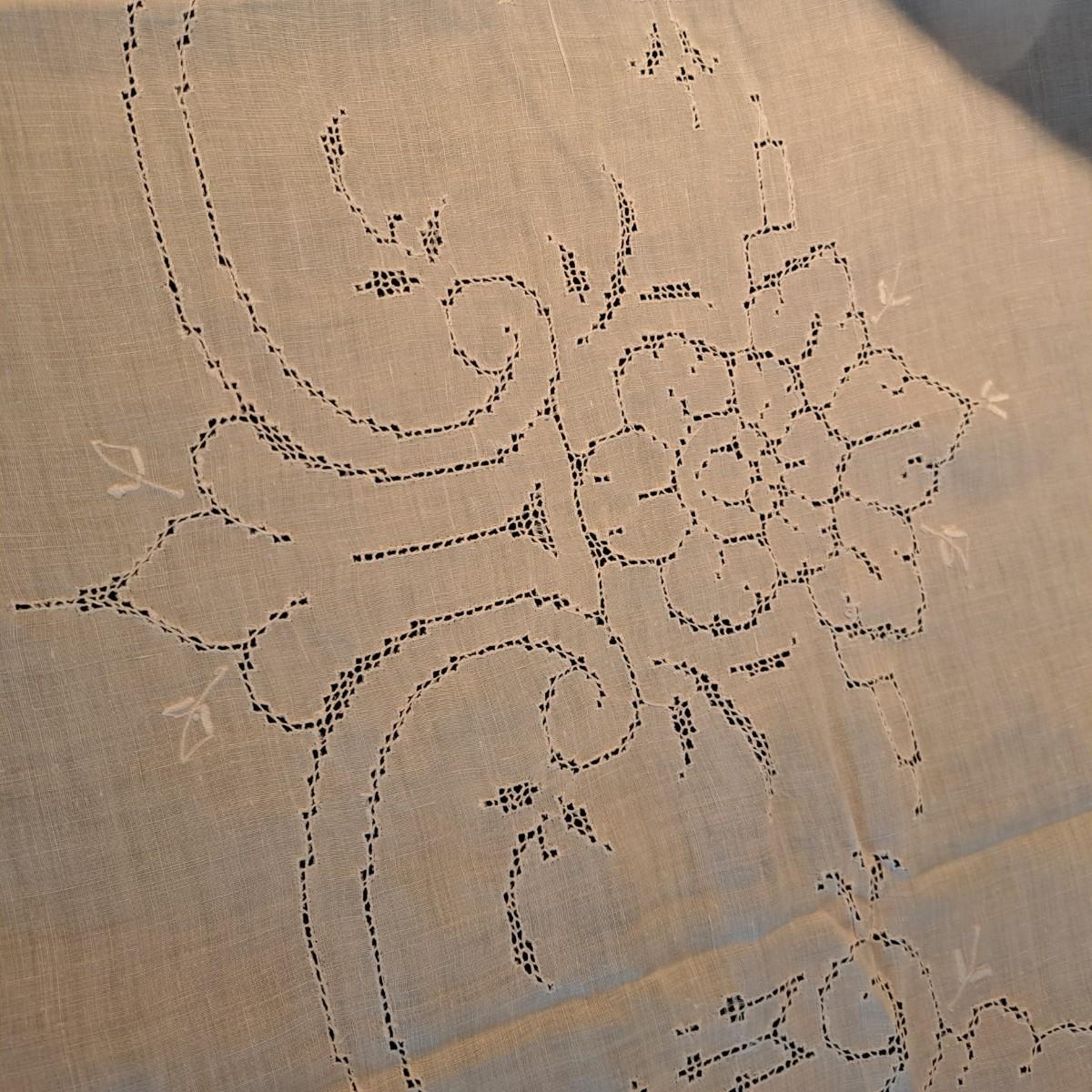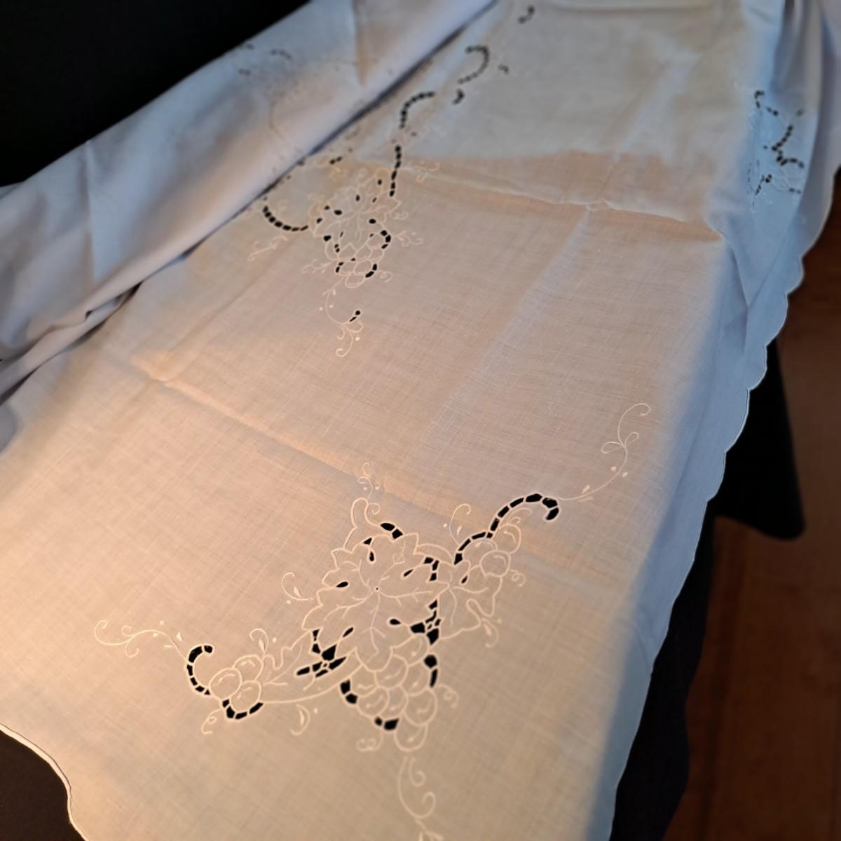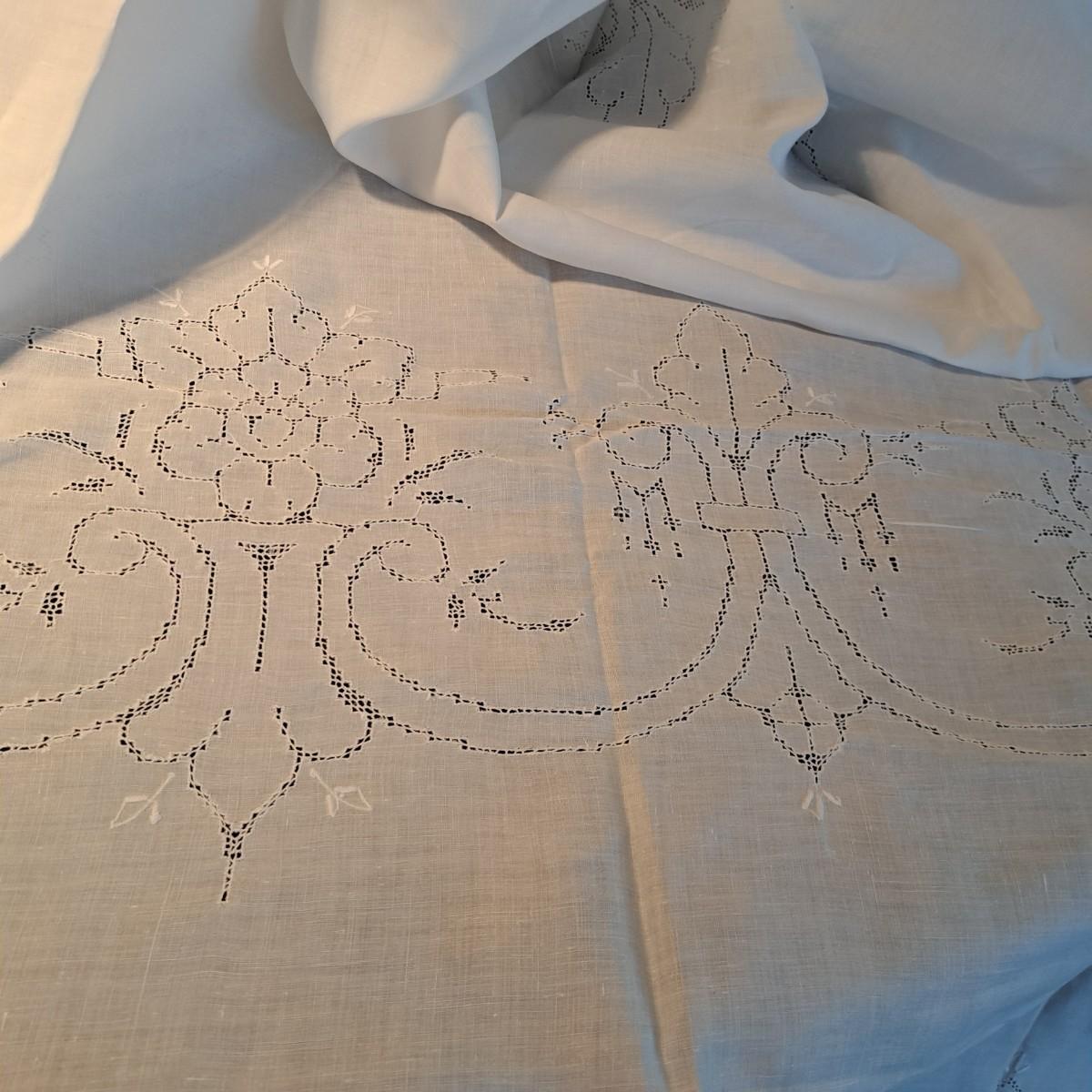Lovely vintage linen lot includes three-hand embroidered crewel linen pillows, approximately 13" x 14" (*backs of two pillows have faint brown stains as shown), a pale blue and white hand-embroidered and crocheted tablecloth 68" x 80" with scalloped edge and three matching napkins (*faint yellow stains on each), three different styles of embroidered linen napkins, a three-piece embroidered centerpiece set 7.5"D to 16"L, and two approximately 64" x 100" white linen tablecloths. A very few faint brown stains present on tablecloths. Shipping available. Shipping can be costly. We suggest contacting our preferred local shipping provider, Postage Express, with dimensions and getting an estimate before bidding: (828) 255-9250 or shipping@postageexpressnc.com.