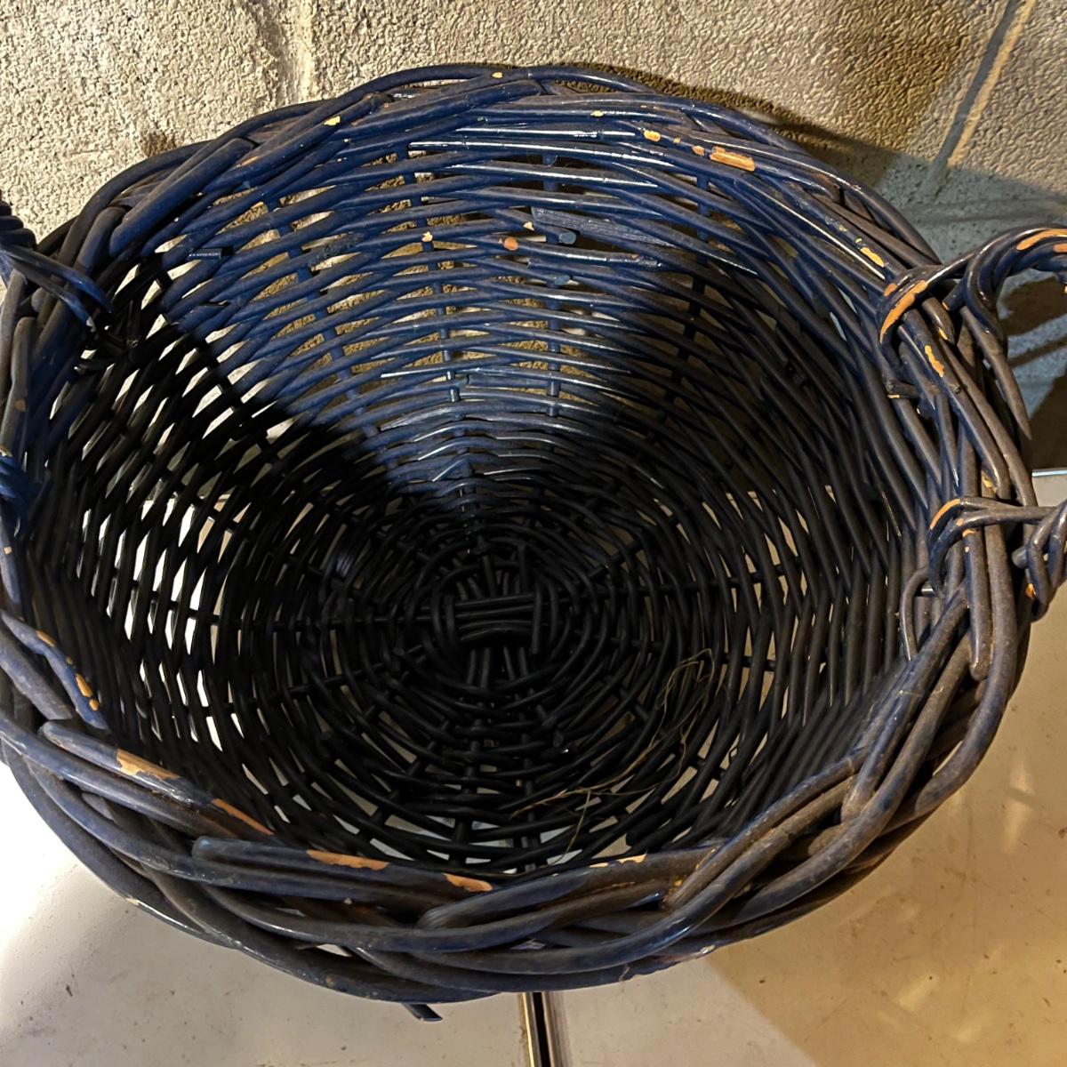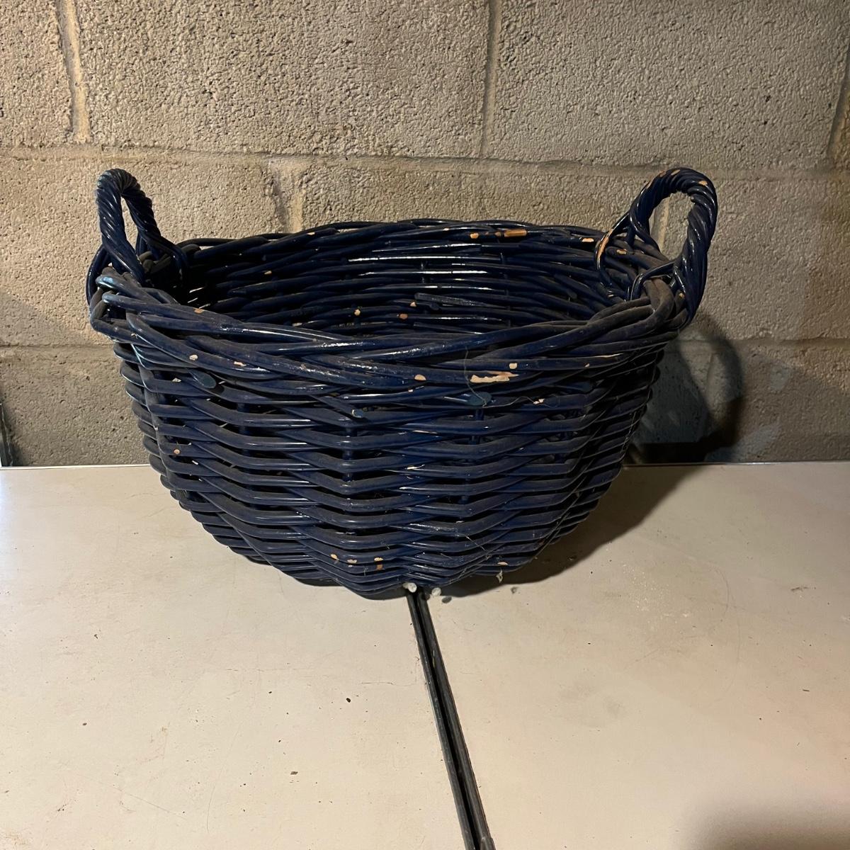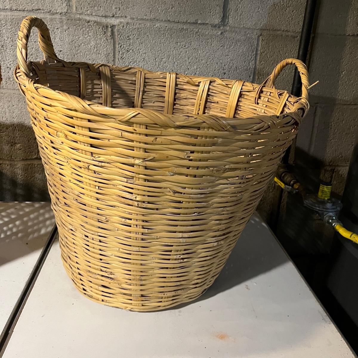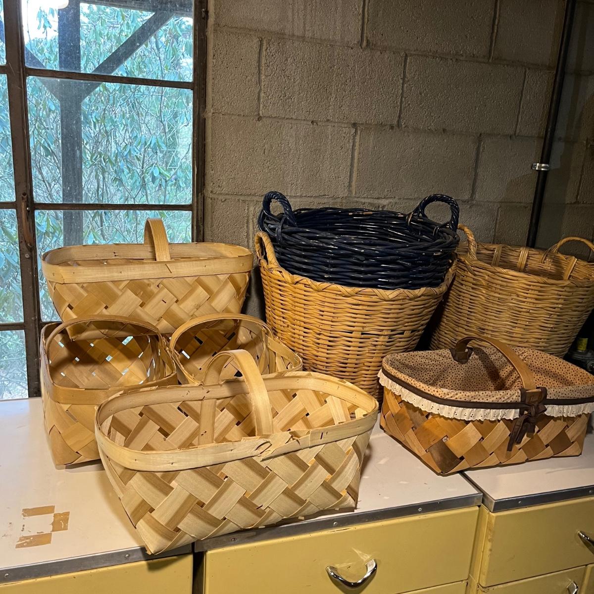Lot contains a collection of handled baskets that includes two large round baskets, a blue basket, and five rectangular baskets, with one having cloth lining. Round baskets measure 18”D x 15” tall not counting handles.