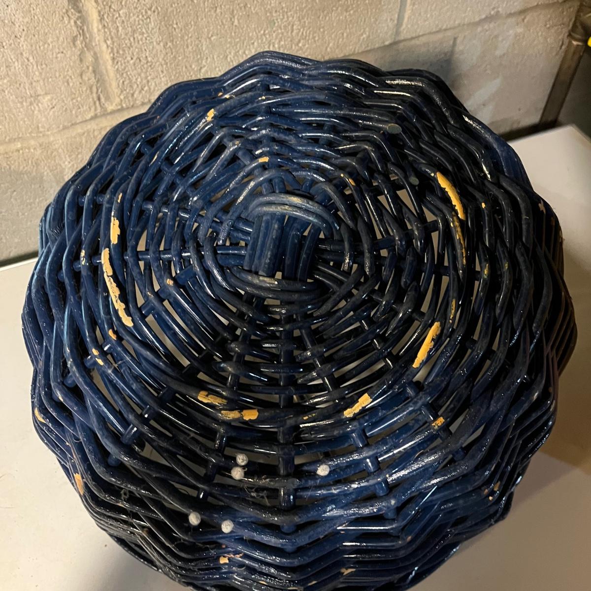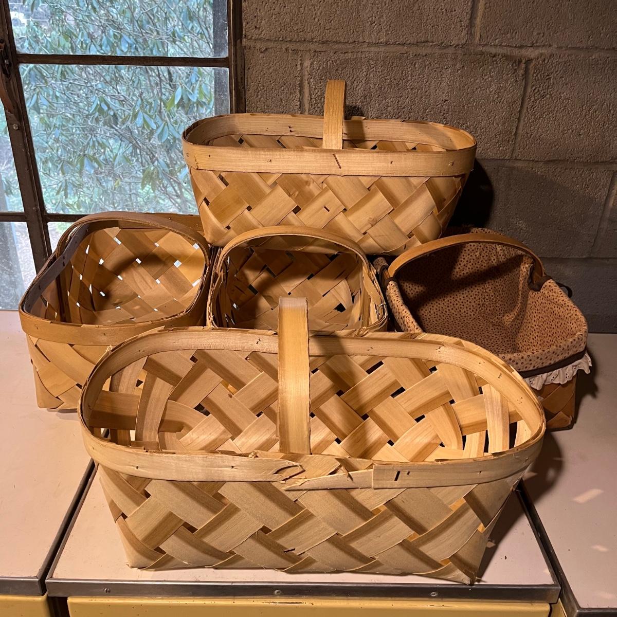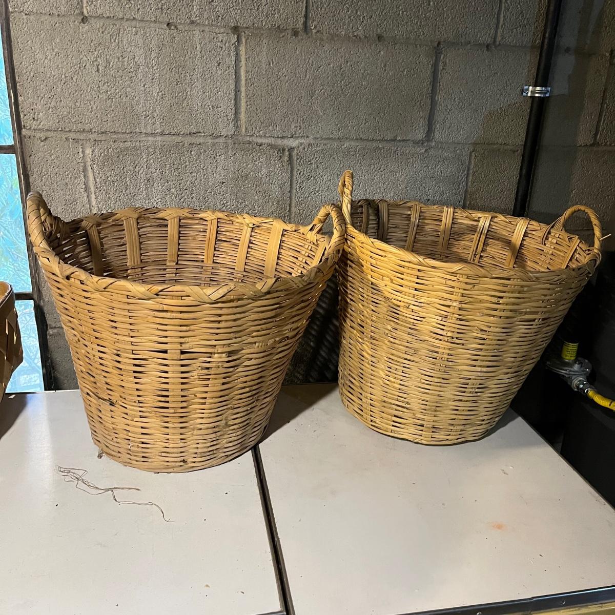 Lot contains a collection of handled baskets that includes two large round baskets, a blue basket, and five rectangular baskets, with one having cloth lining. Round baskets measure 18”D x 15” tall not counting handles.