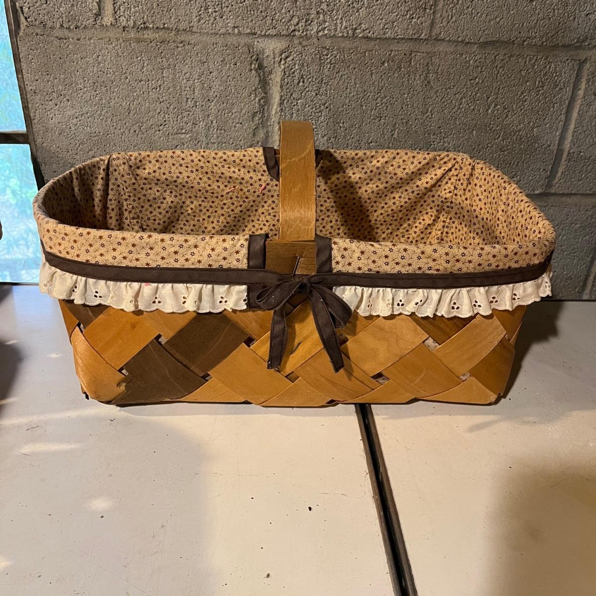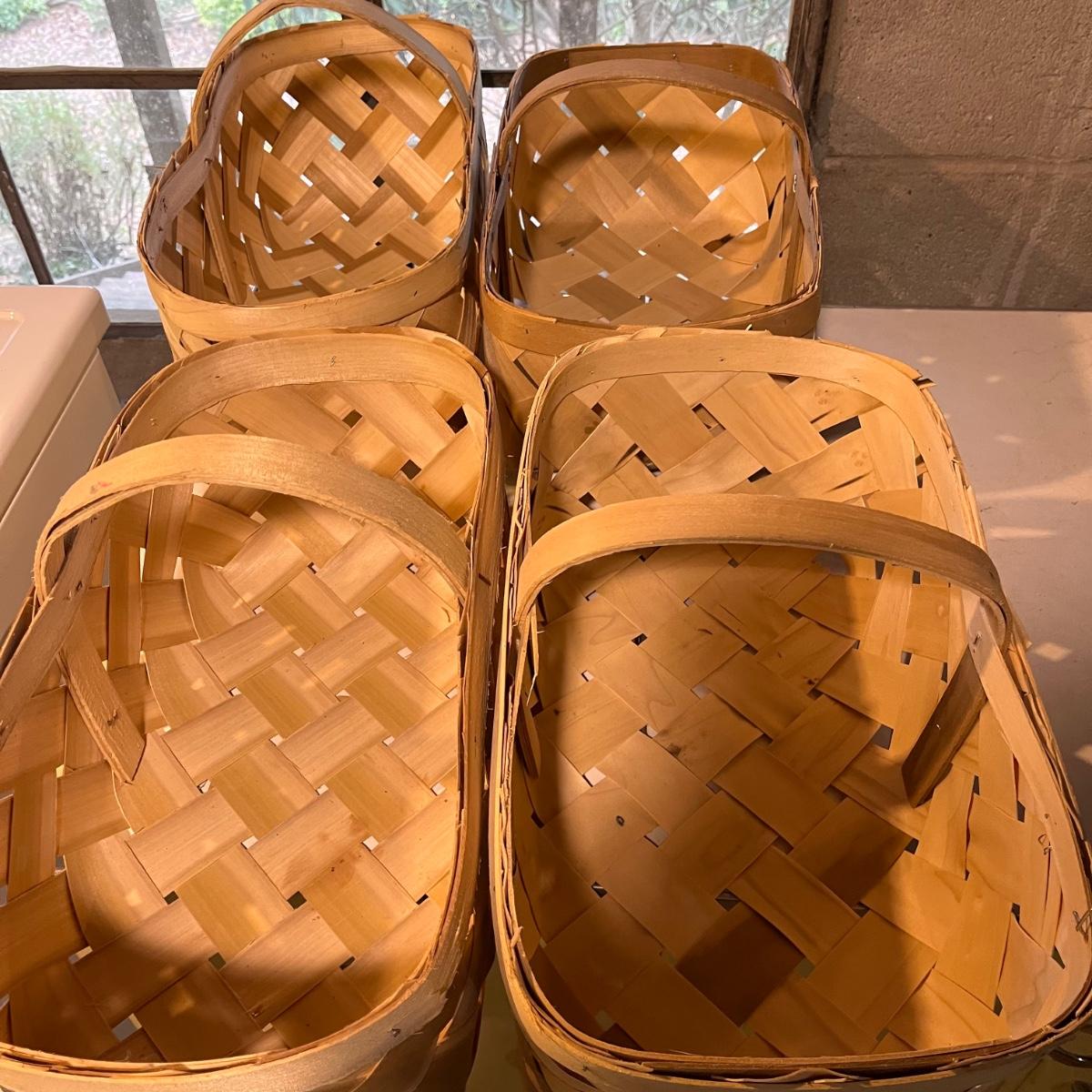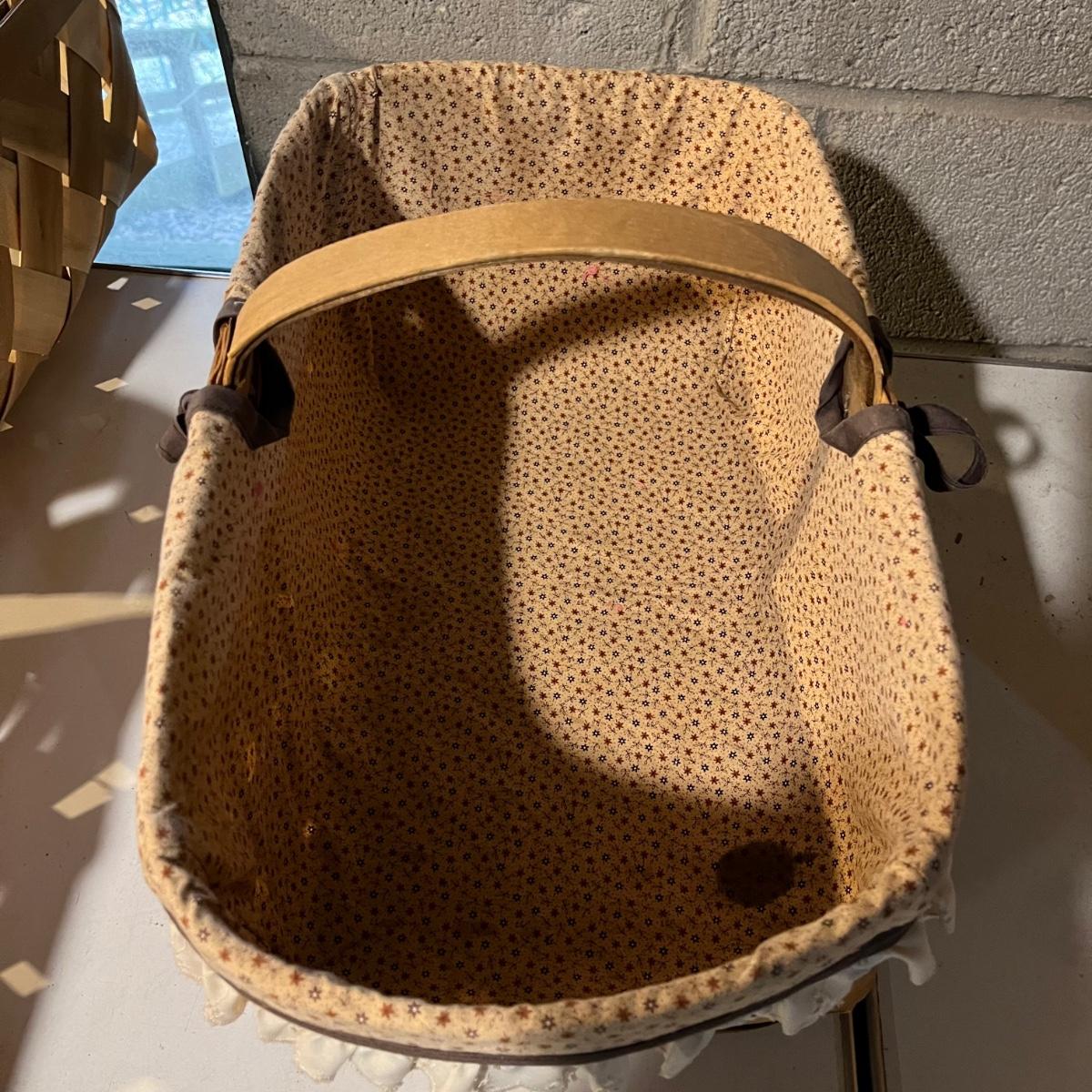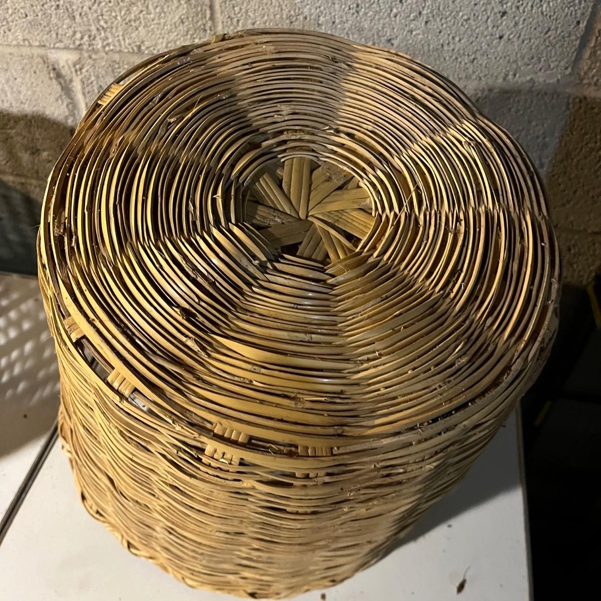 Lot contains a collection of handled baskets that includes two large round baskets, a blue basket, and five rectangular baskets, with one having cloth lining. Round baskets measure 18”D x 15” tall not counting handles.