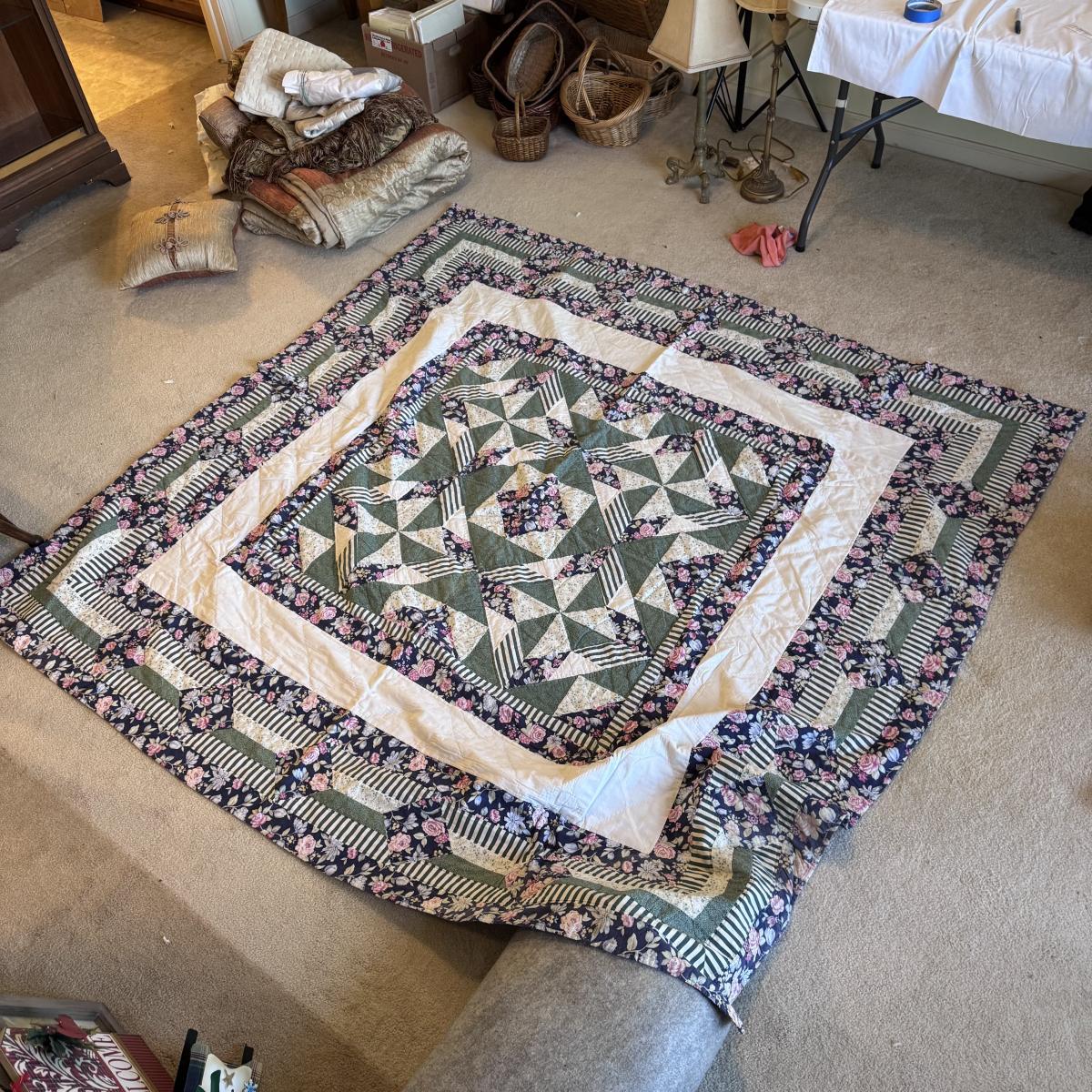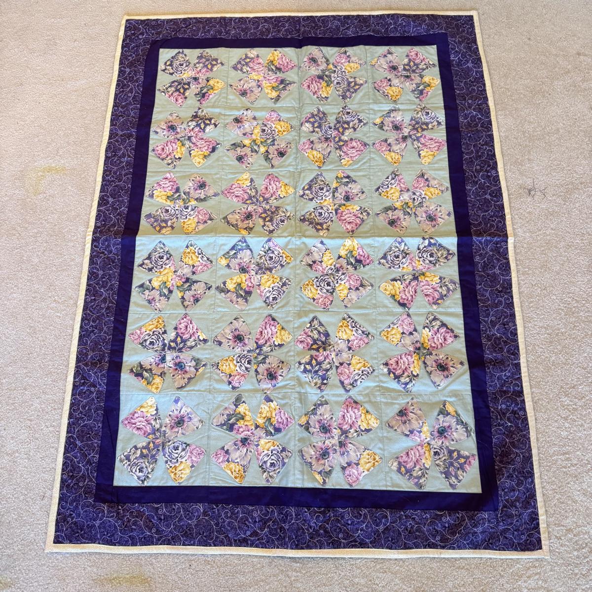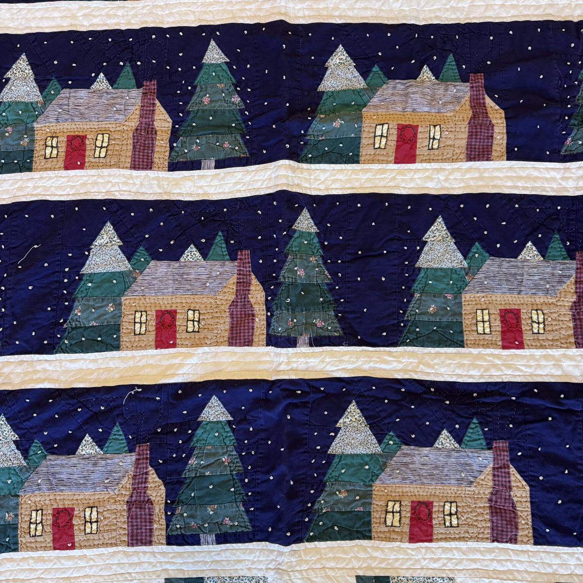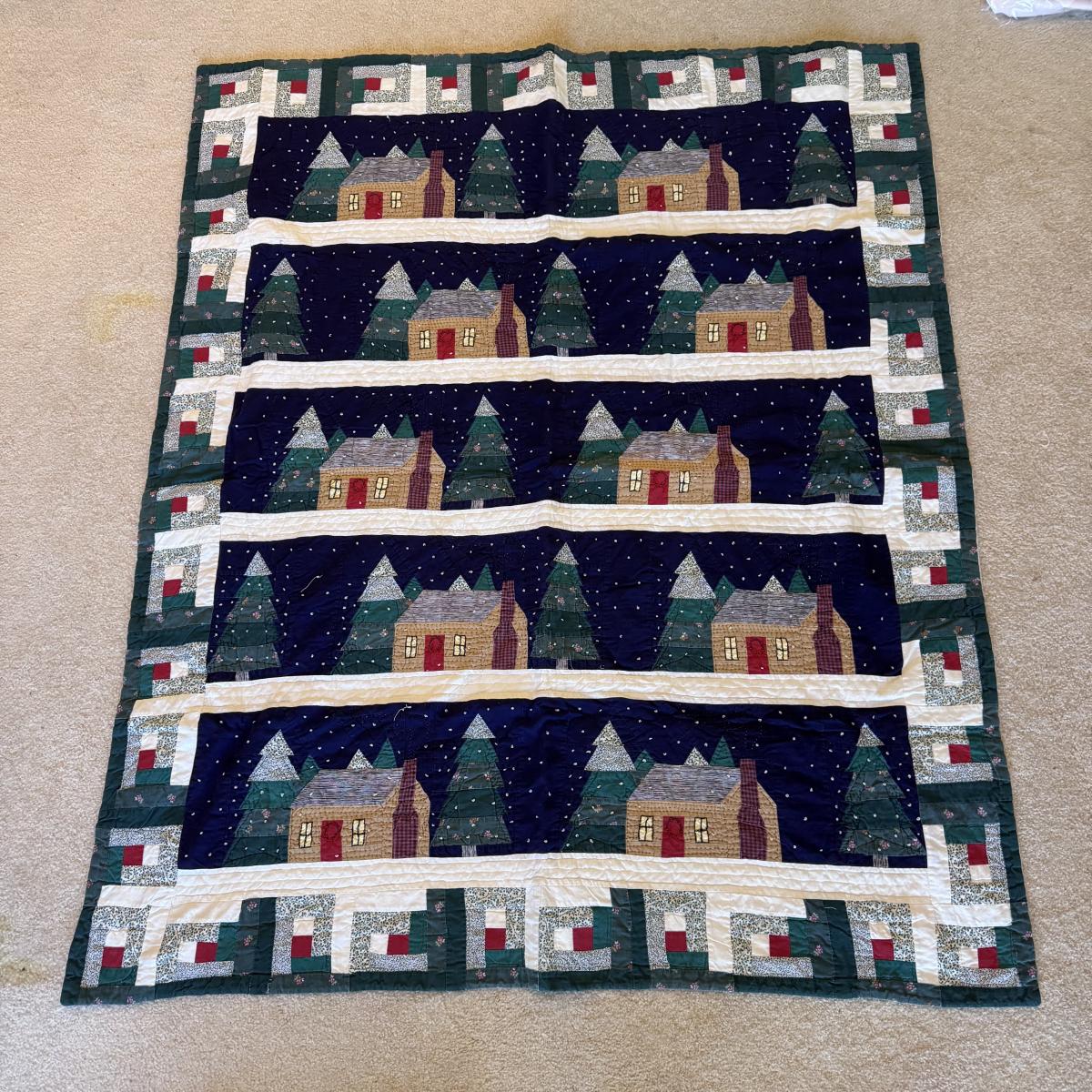 This lot includes four handmade quilts, along with four embroidered XL pillowcases. The largest quilt has a hole along the edge of one side - see picture included. This largest quilt measures 72” x 79”H. Shipping available.