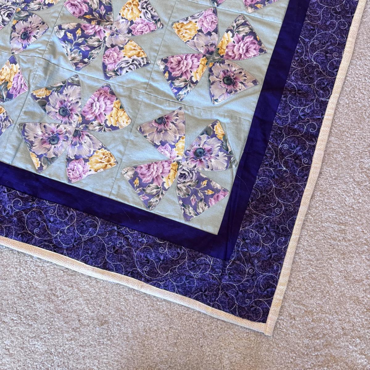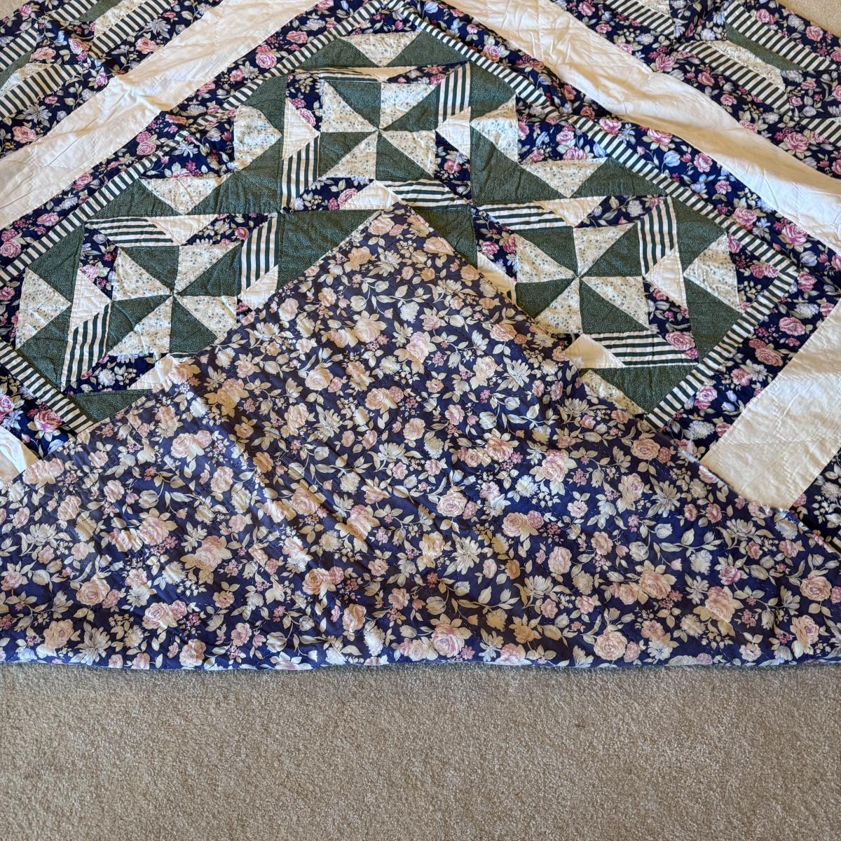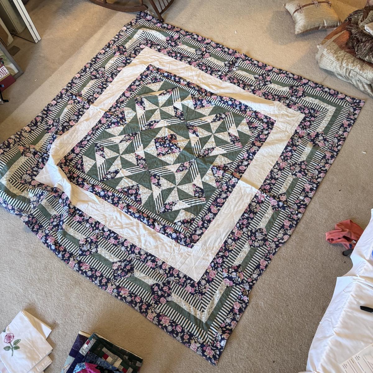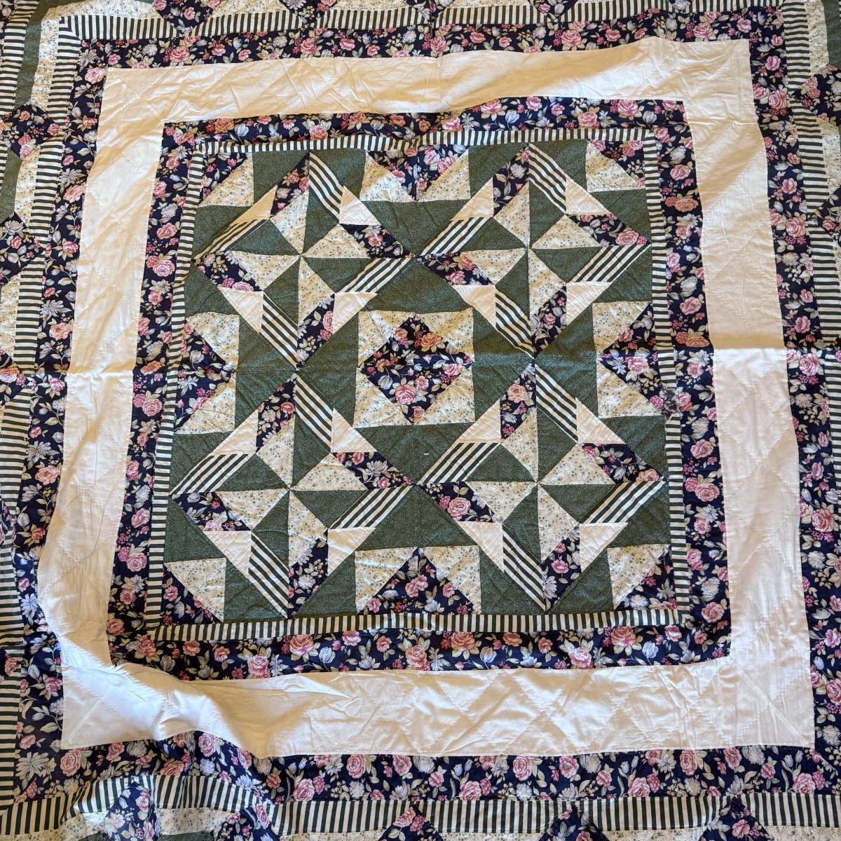 This lot includes four handmade quilts, along with four embroidered XL pillowcases. The largest quilt has a hole along the edge of one side - see picture included. This largest quilt measures 72” x 79”H. Shipping available.
