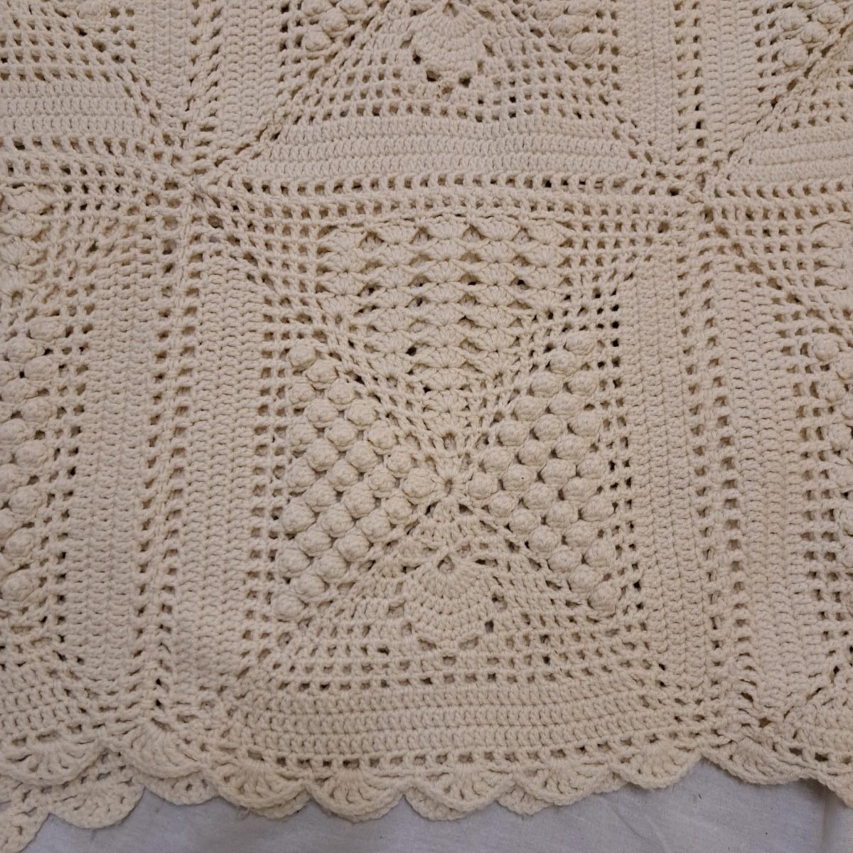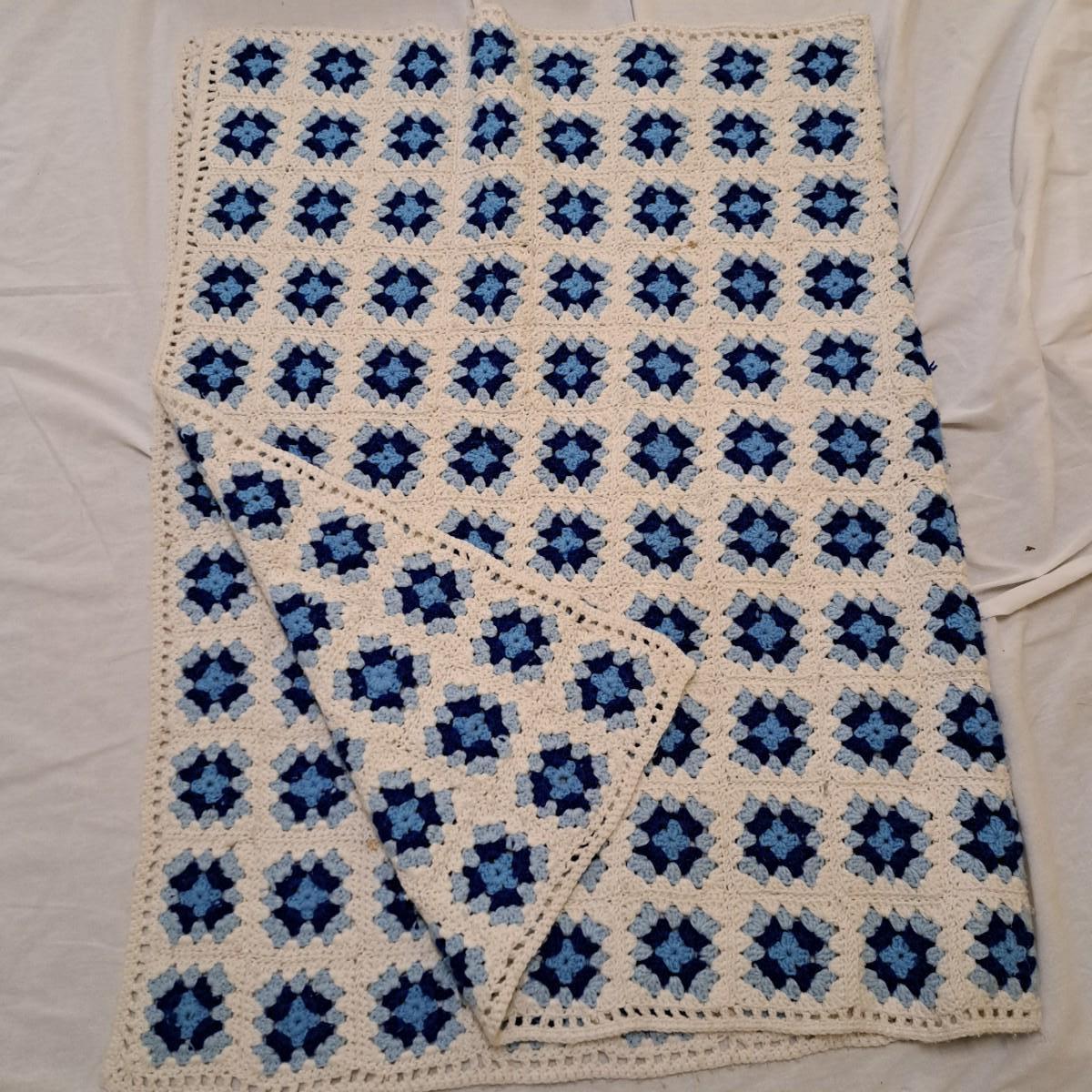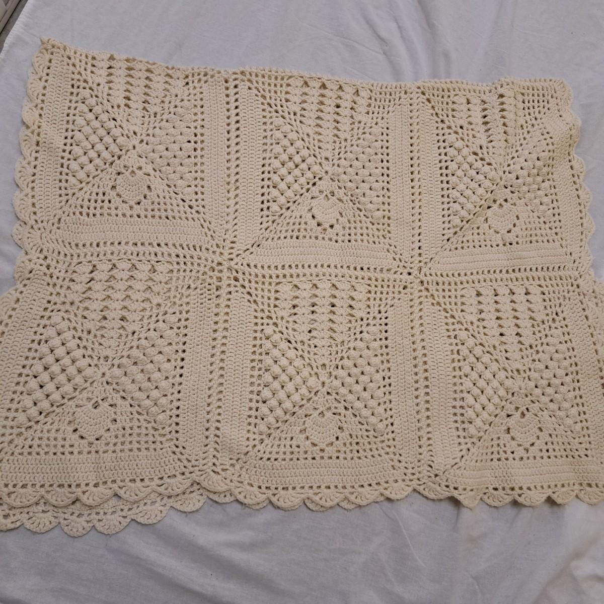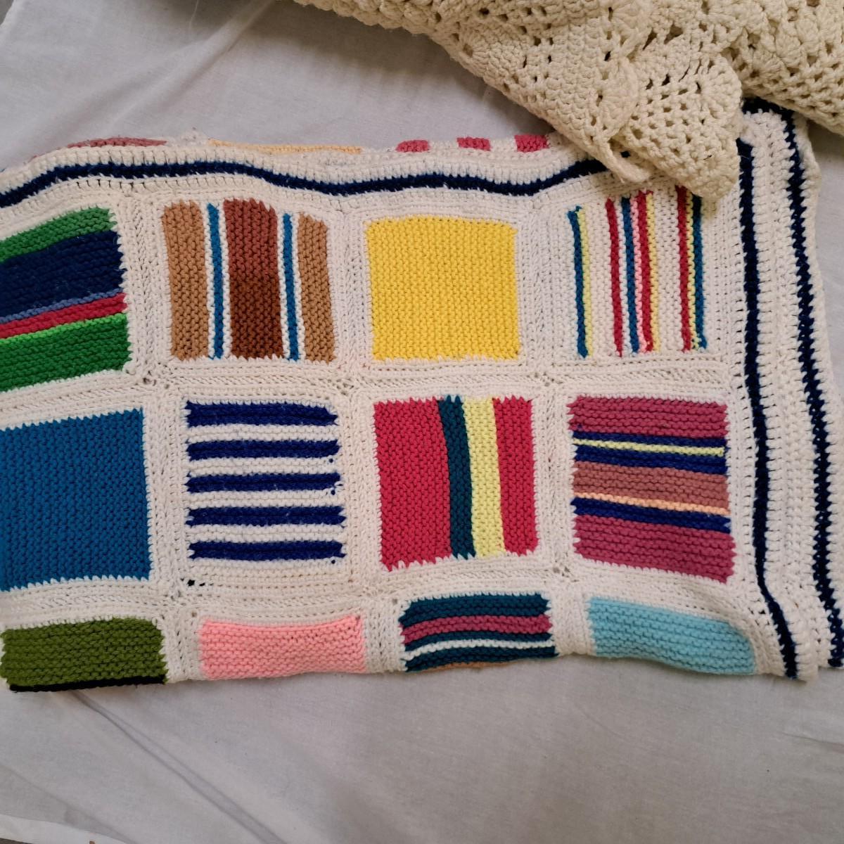 A collection of four hand-knitted throws and Afghans, each varying in size from the smallest, an ivory-colored scalloped throw, 36" x 64" to the largest, a zigzag colorful Afghan, 55" x 72". All appear to be in very good condition; however, the blue and white Afghan has a faint stain as shown. Shipping available. Shipping can be costly. We suggest contacting our preferred local shipping provider, Postage Express, with dimensions and getting an estimate before bidding: (828) 255-9250 or shipping@postageexpressnc.com.