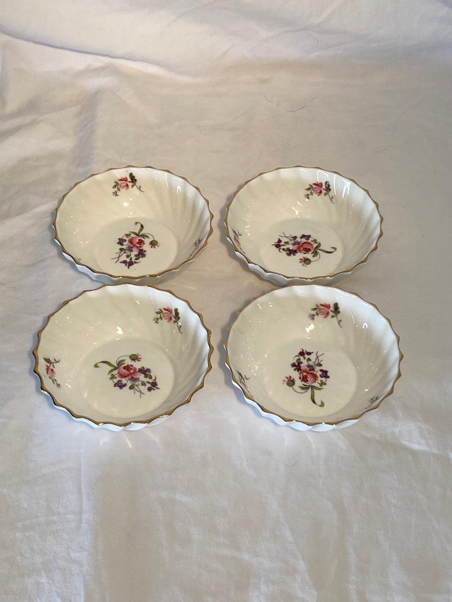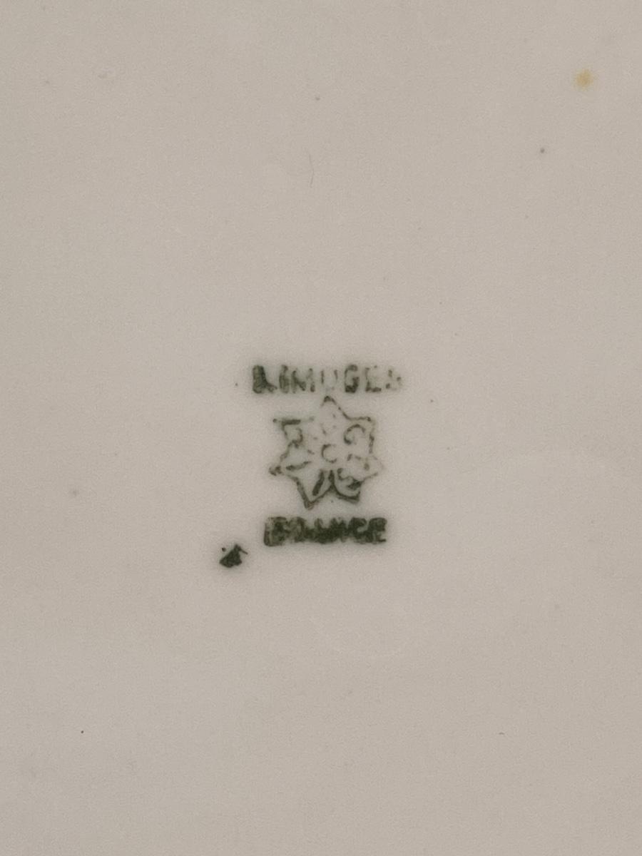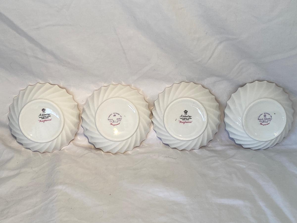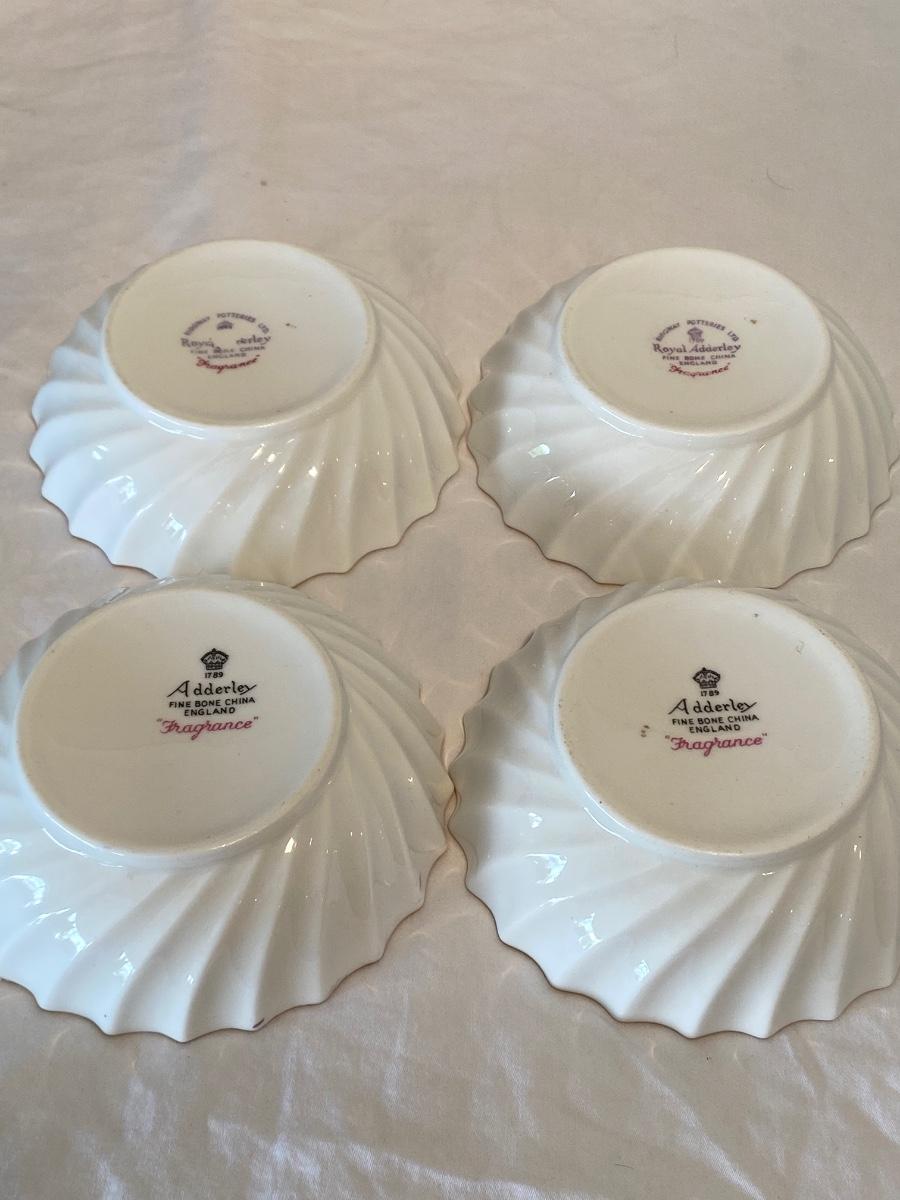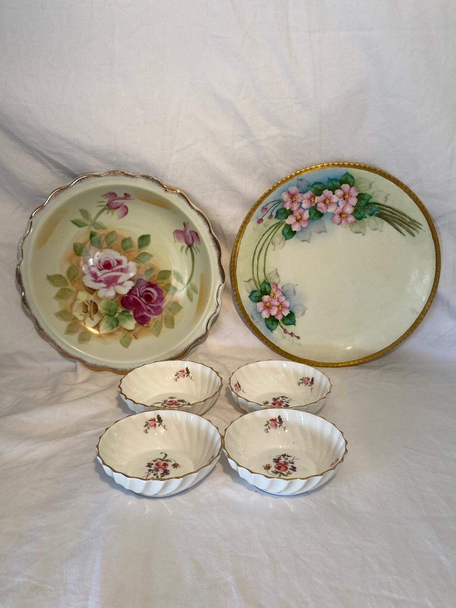 Collection of hand-painted plates and vintage China bowls. One plate marked “Japan.” One plate signed and stamped “ Limoges France.” Set of four 1789 Adderley fine bone China England “Fragrance.” Preowned and sold as is