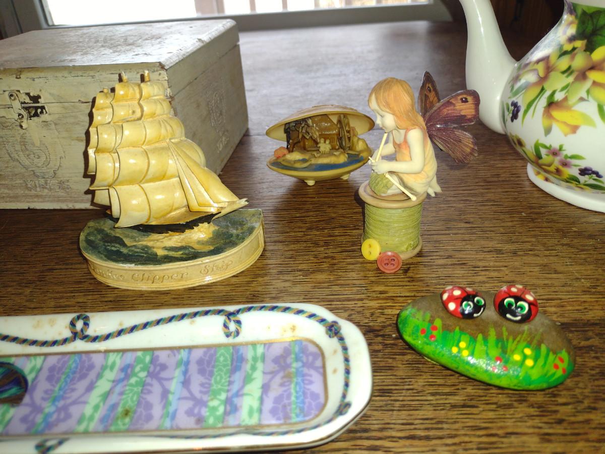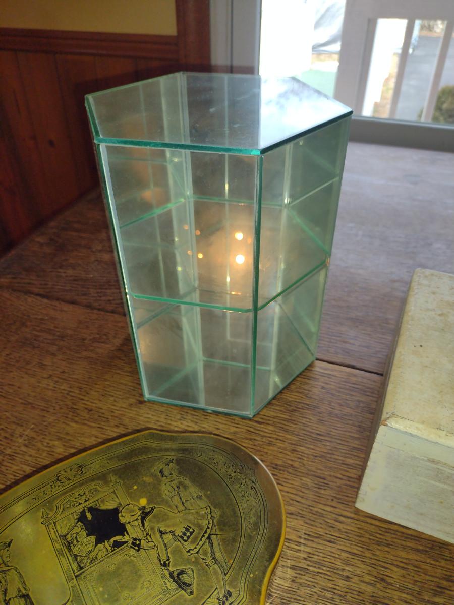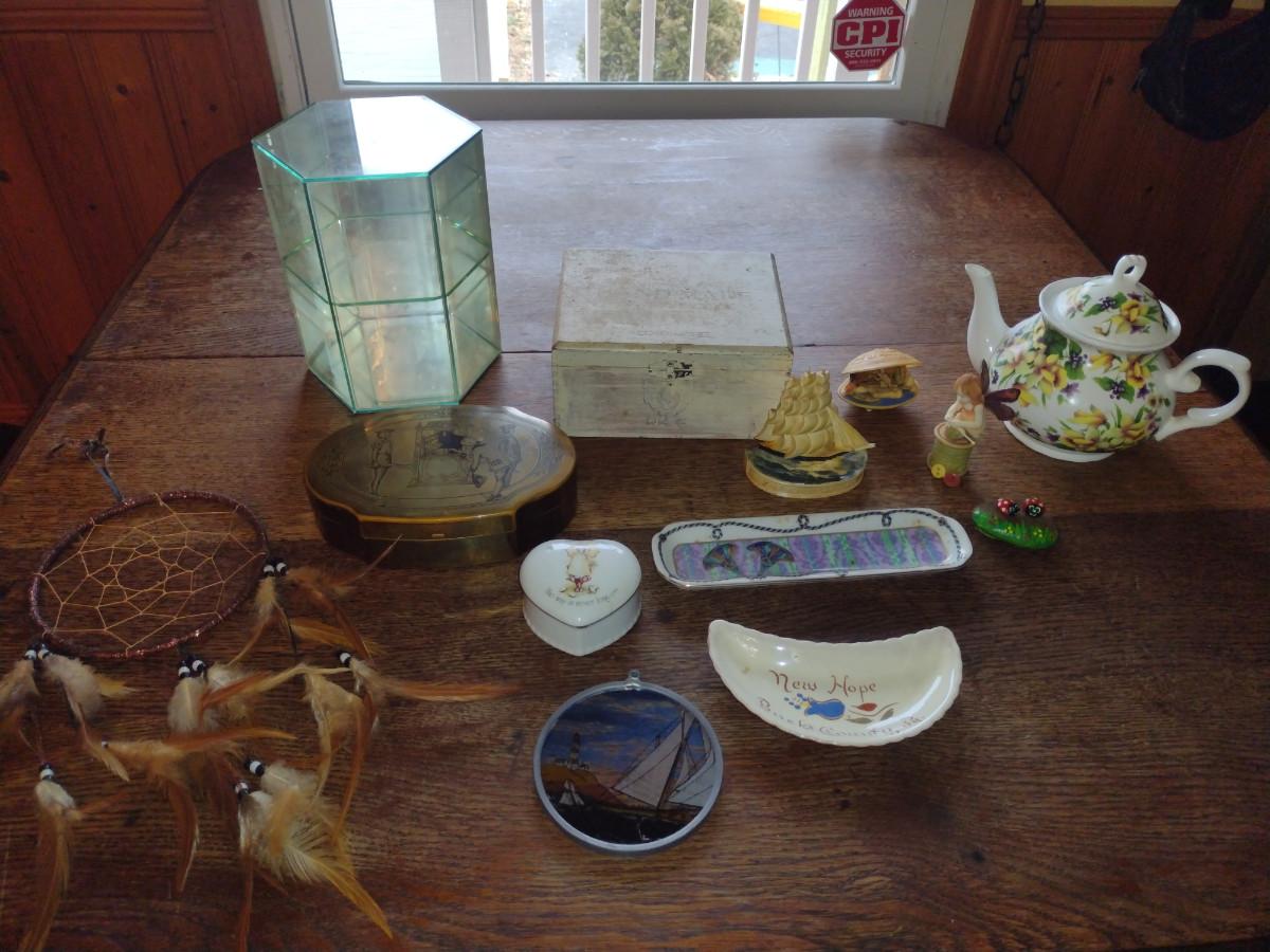 Collection of Home Decor. Glass display case has door that needs to be reattached.