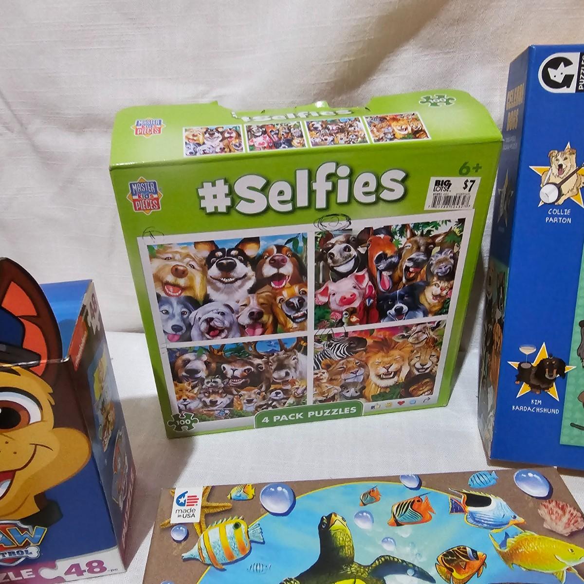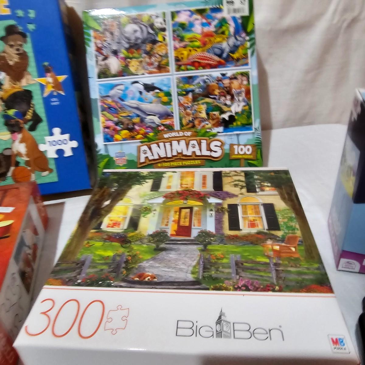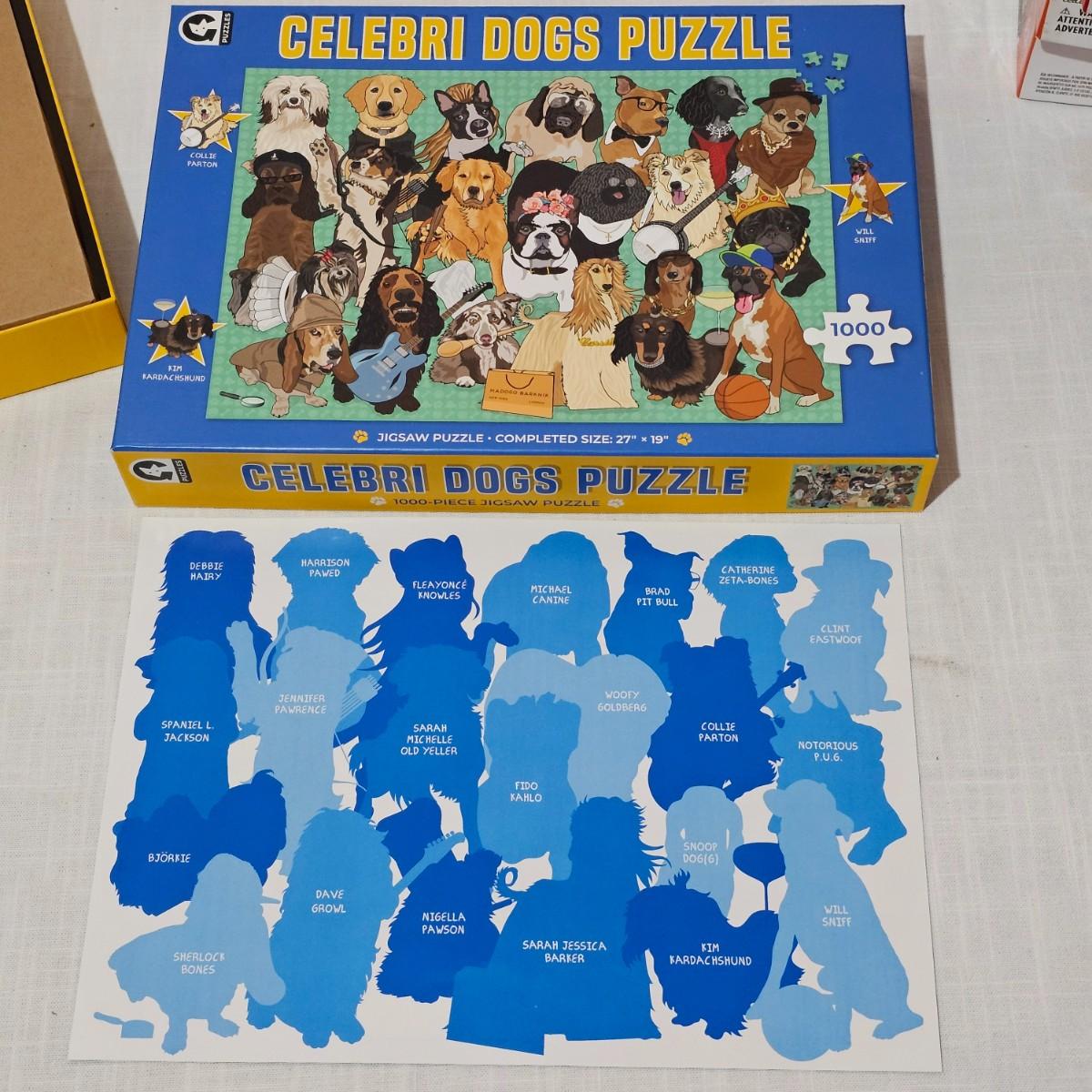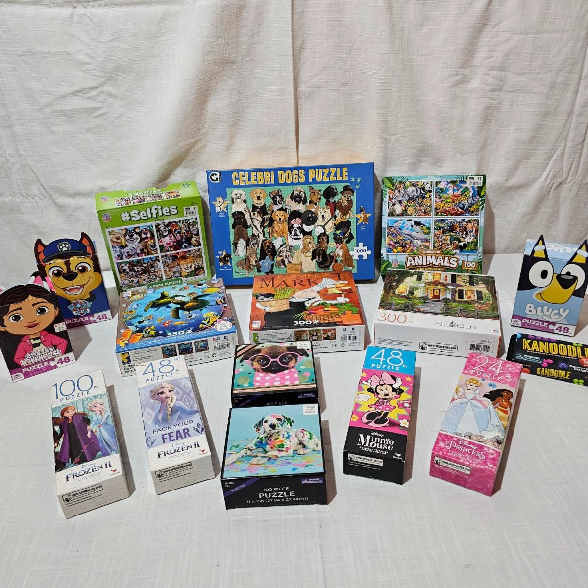 A fun grouping of puzzles for kids and adults. Piece counts range from 24 up to 1000, subjects are cartoons, animals and architecture. Celebri Dogs puzzle is patterned after famous actors, singers and others with a guide to who is who. 16 puzzles in all. See photos for details. Shipping available