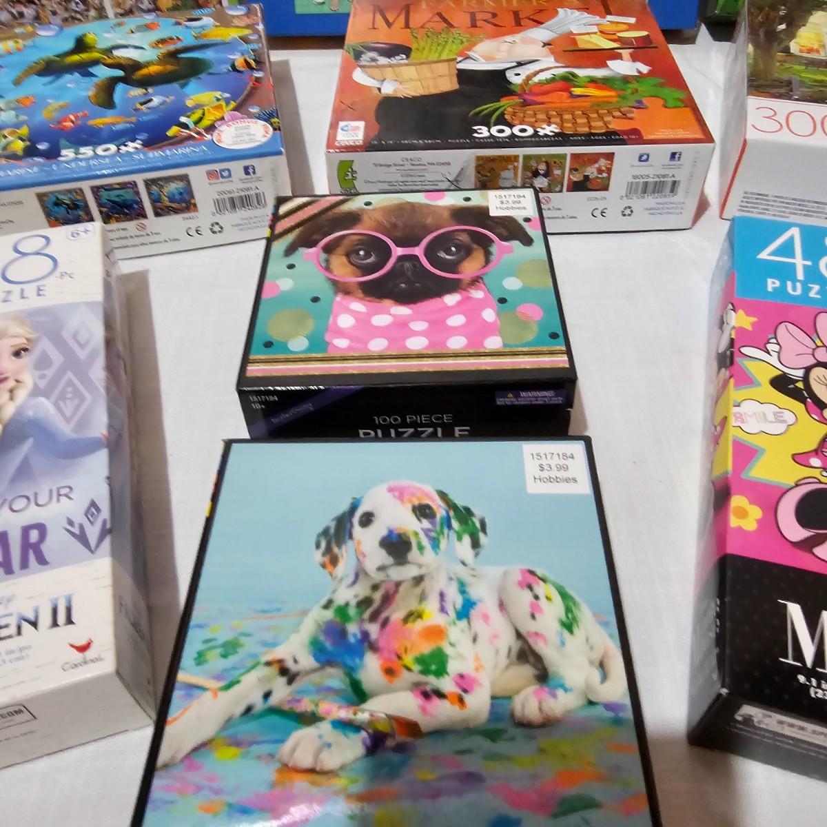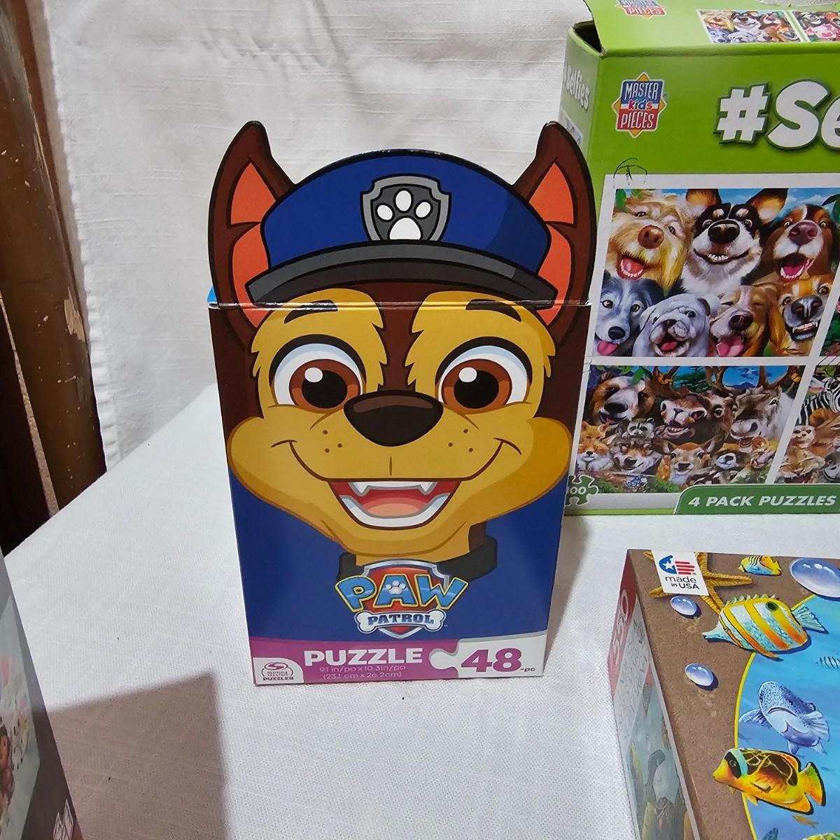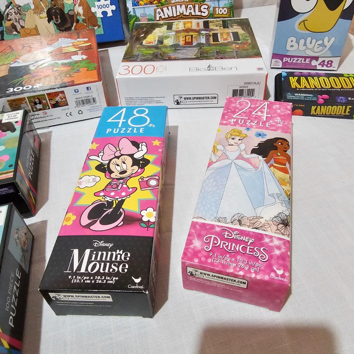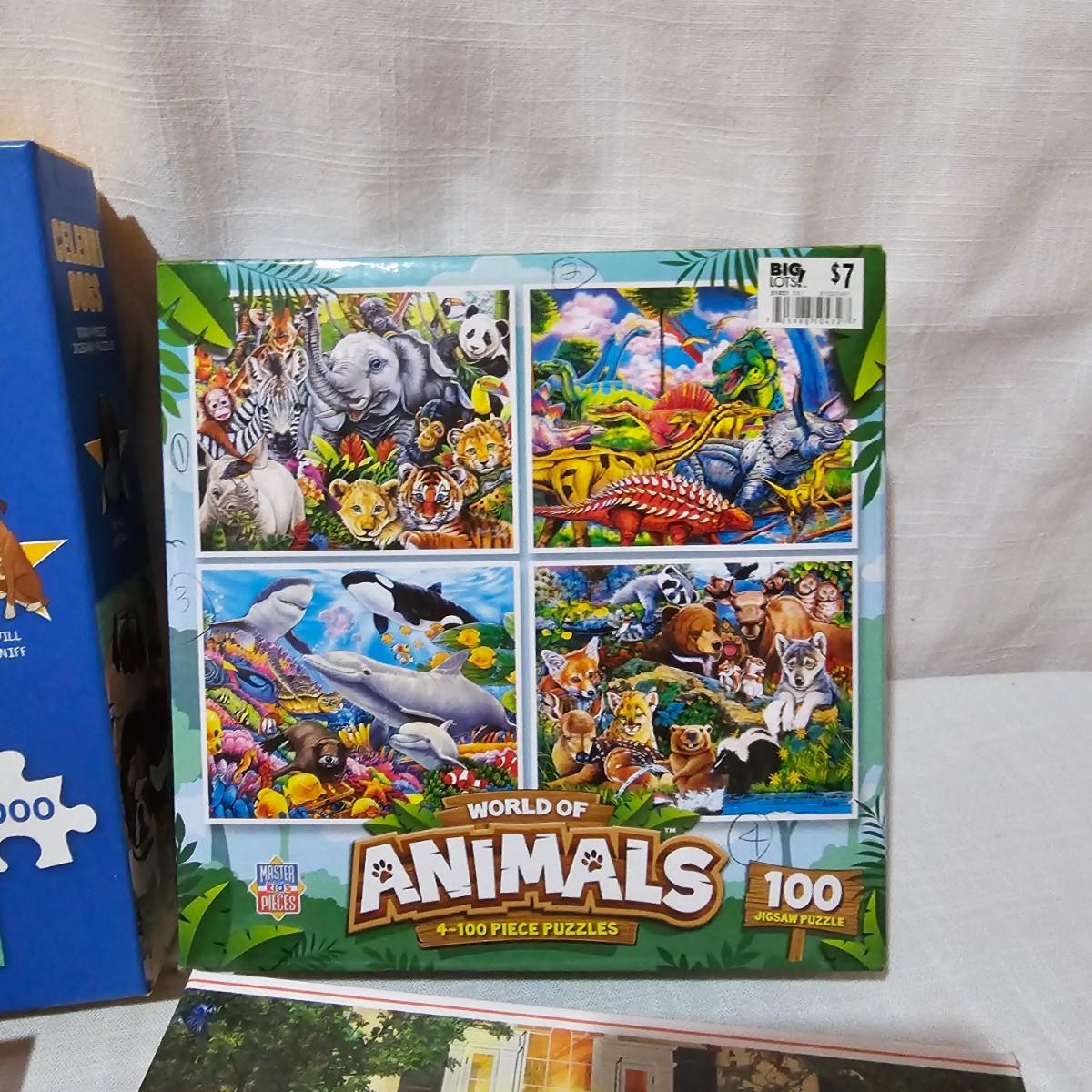 A fun grouping of puzzles for kids and adults. Piece counts range from 24 up to 1000, subjects are cartoons, animals and architecture. Celebri Dogs puzzle is patterned after famous actors, singers and others with a guide to who is who. 16 puzzles in all. See photos for details. Shipping available