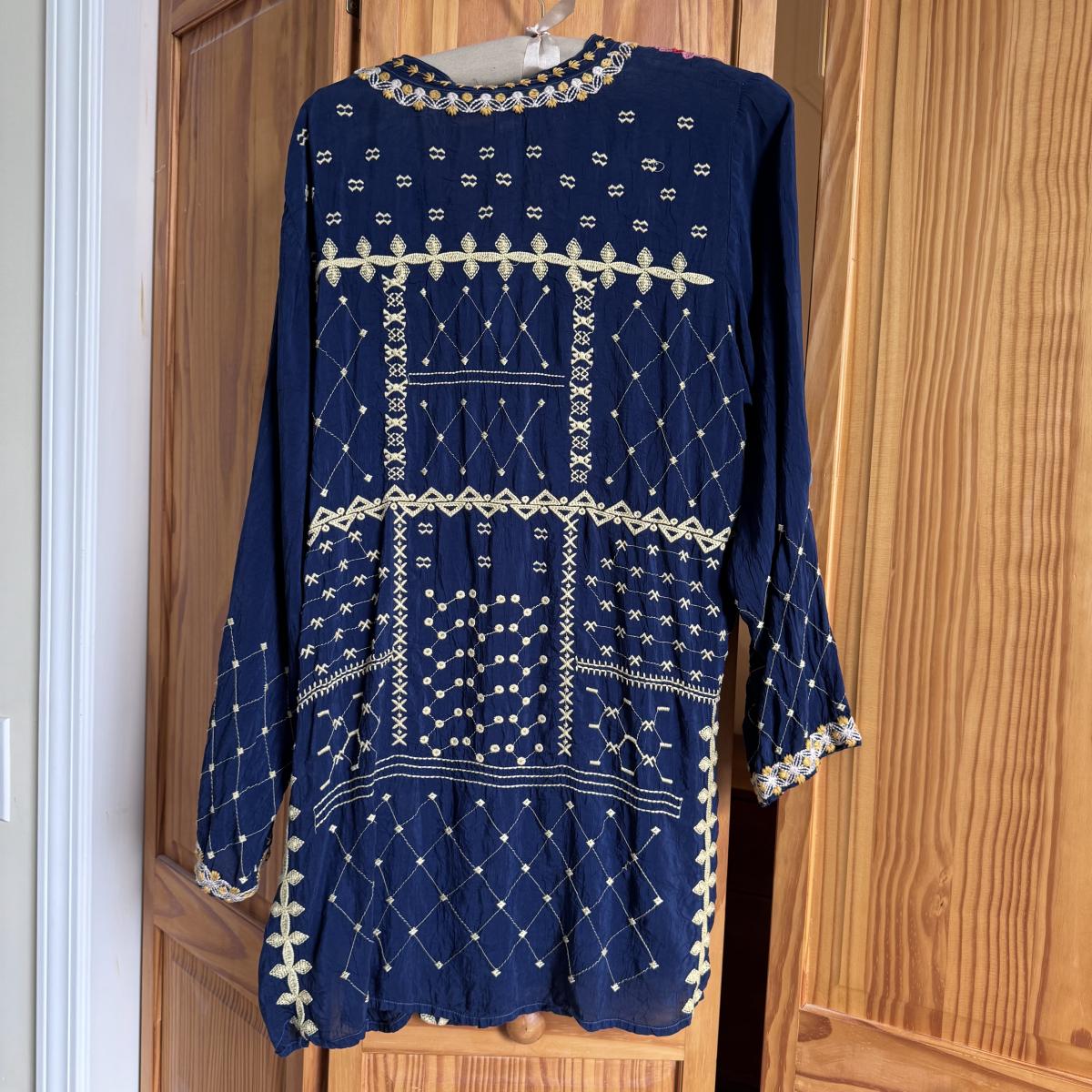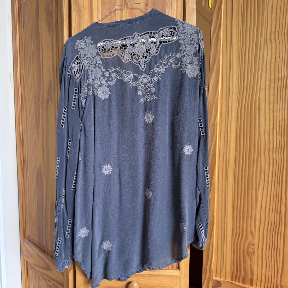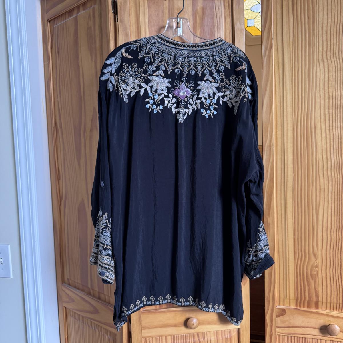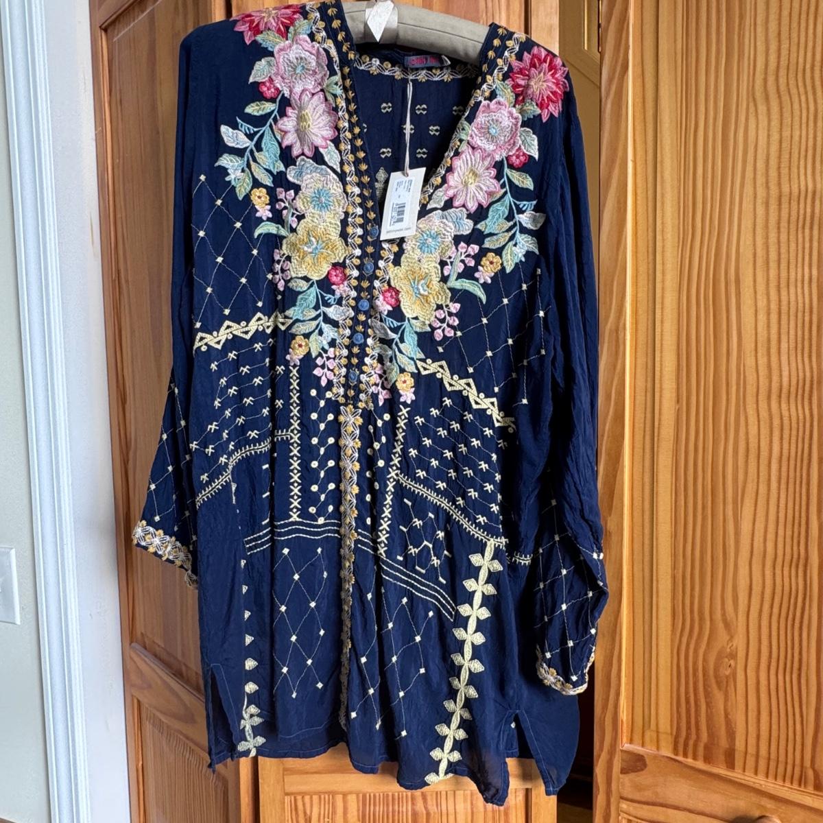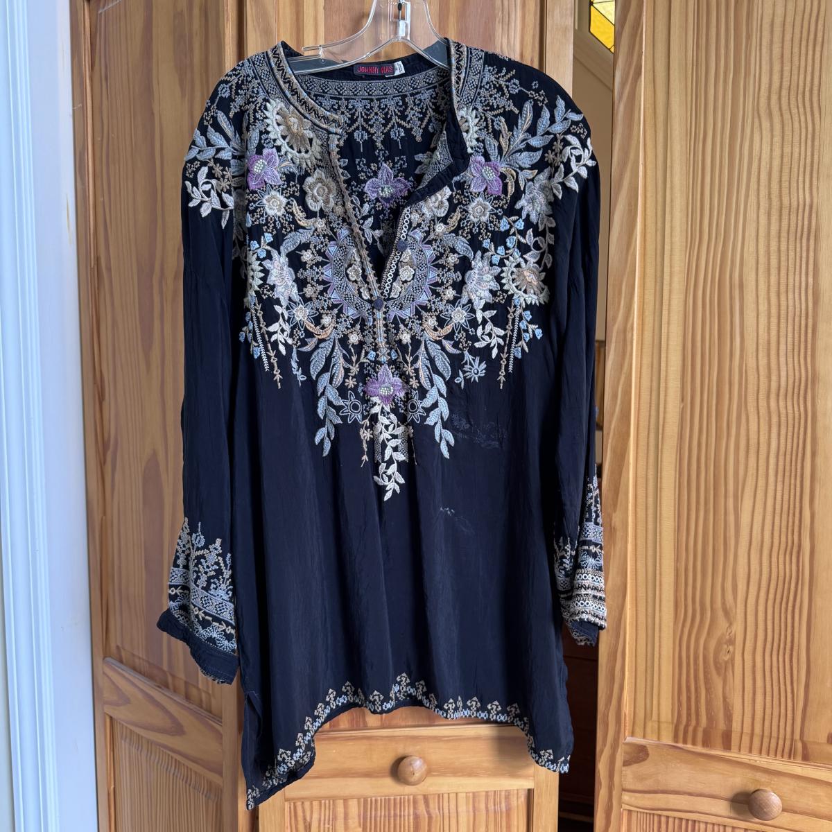 This lot includes four blouses from Johnny Was, all sized at XL. The first blouse individually pictured is new with tags. The last two blouses pictured have a few stains on them - see pictures included. Shipping available.
