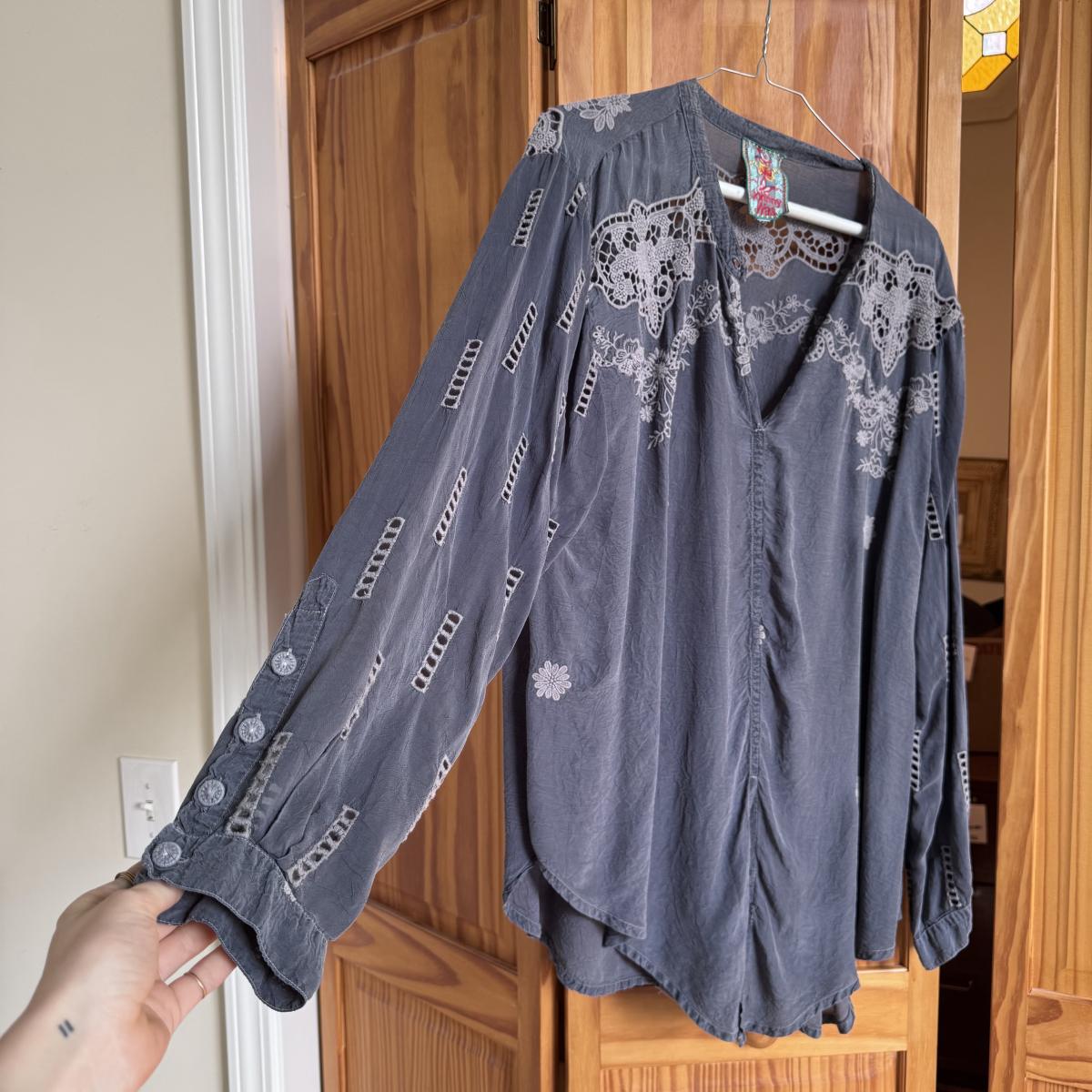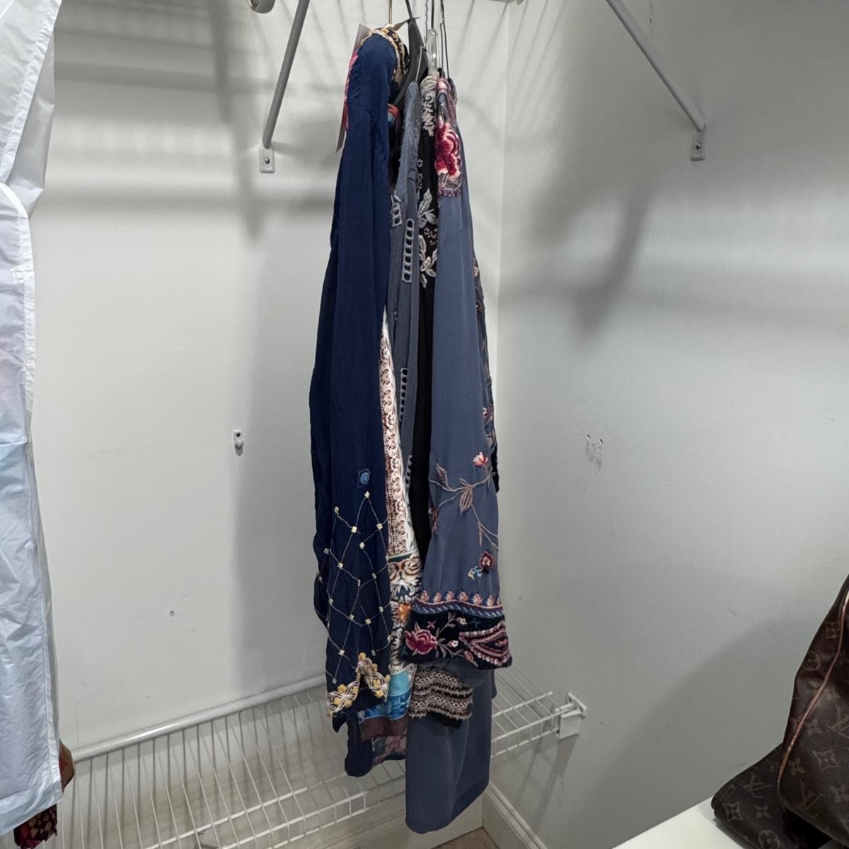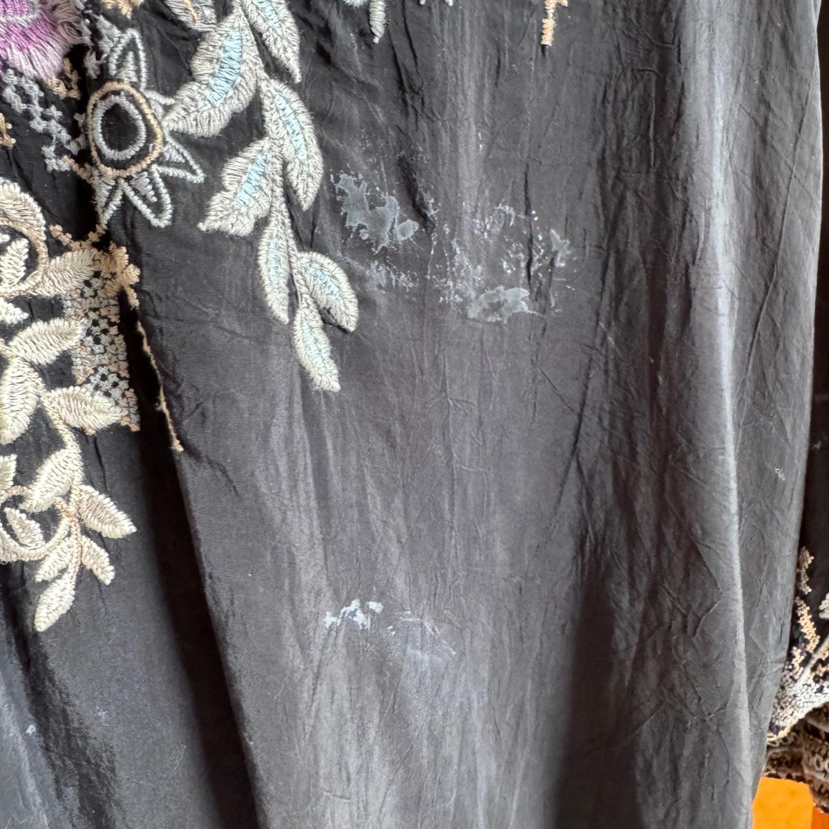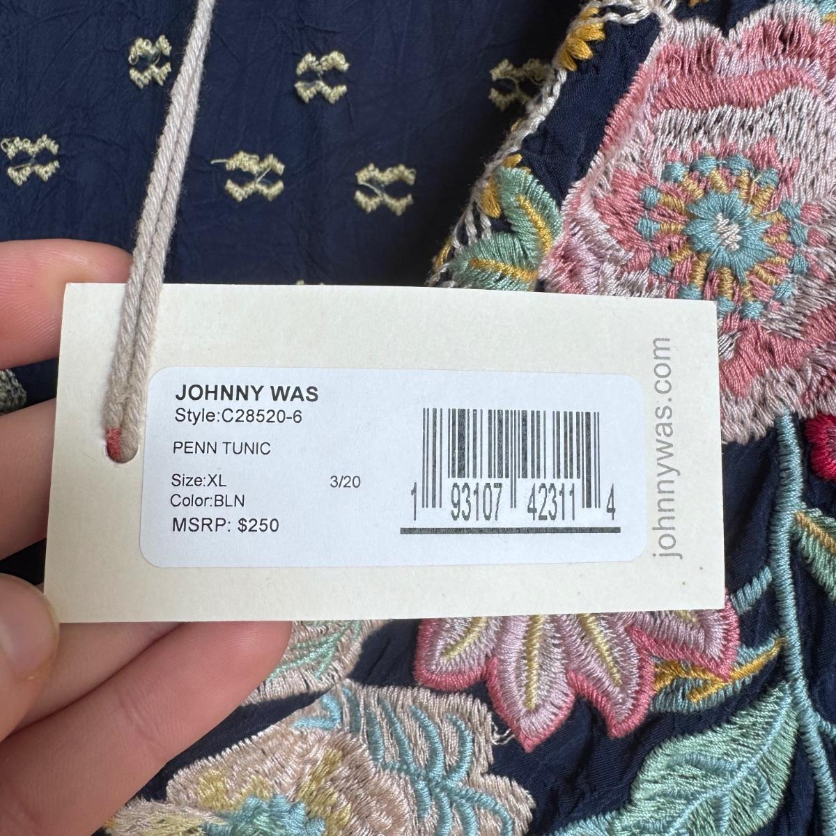 This lot includes four blouses from Johnny Was, all sized at XL. The first blouse individually pictured is new with tags. The last two blouses pictured have a few stains on them - see pictures included. Shipping available.