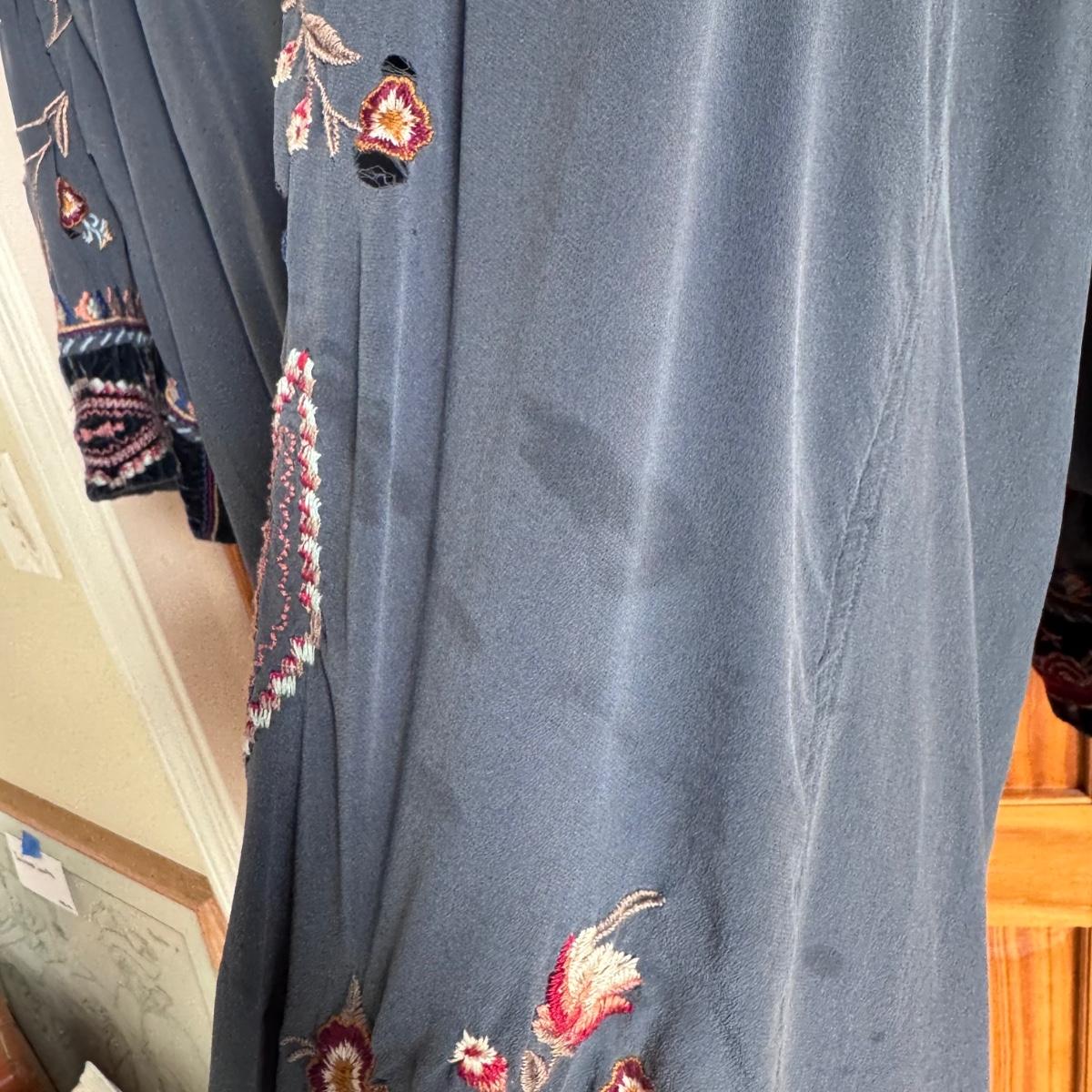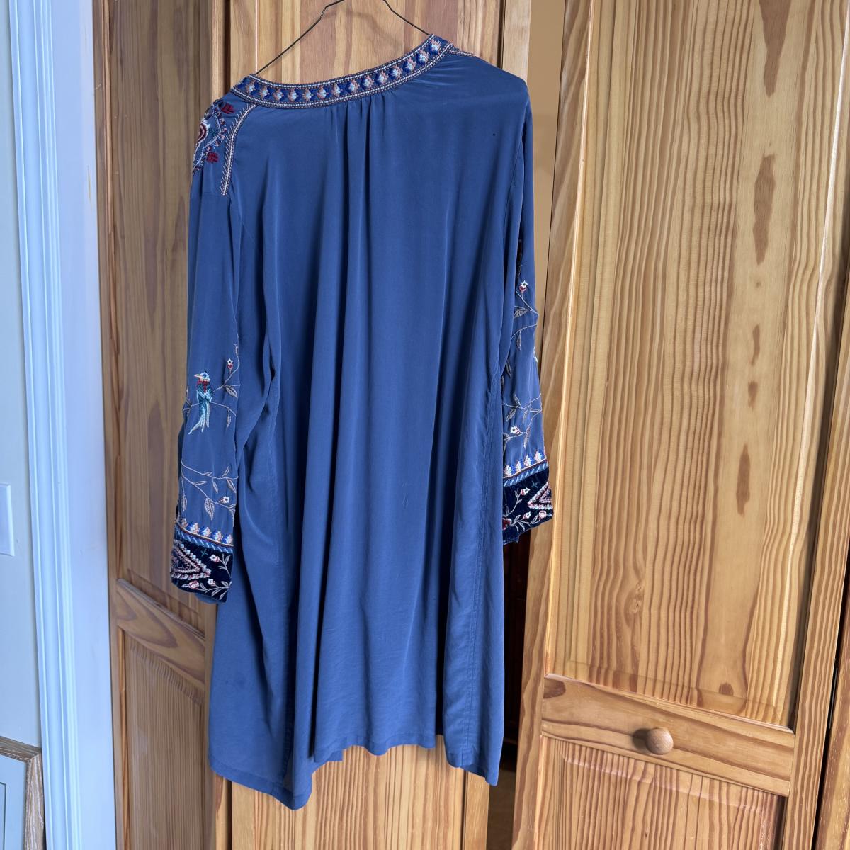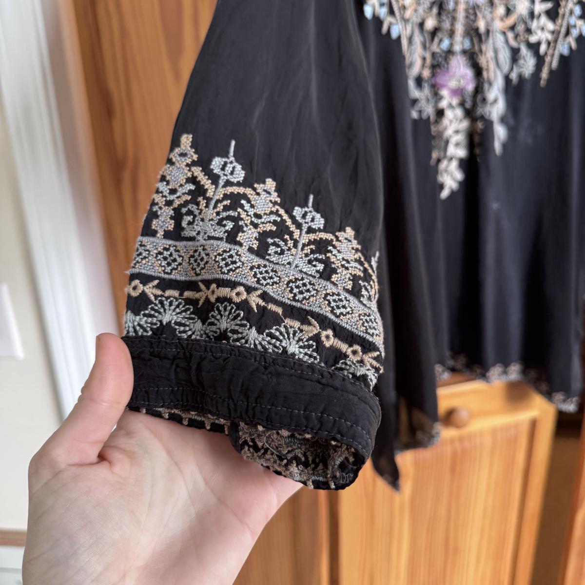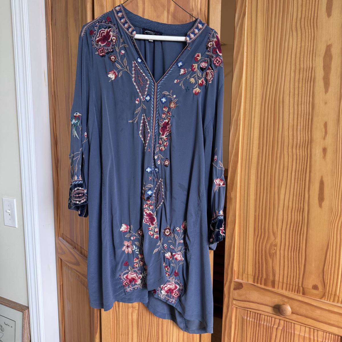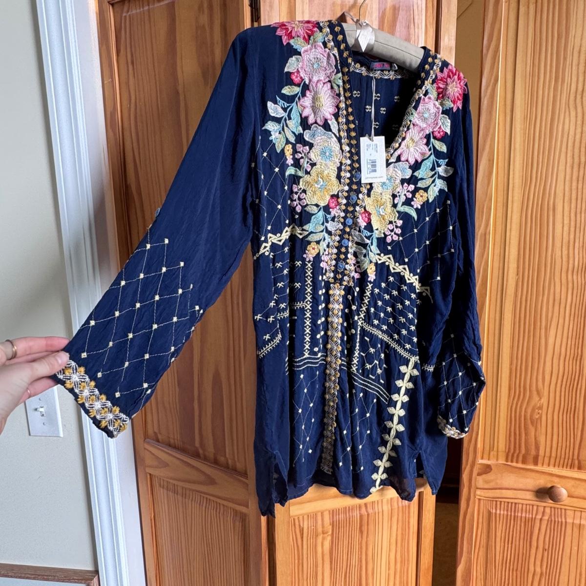 This lot includes four blouses from Johnny Was, all sized at XL. The first blouse individually pictured is new with tags. The last two blouses pictured have a few stains on them - see pictures included. Shipping available.
