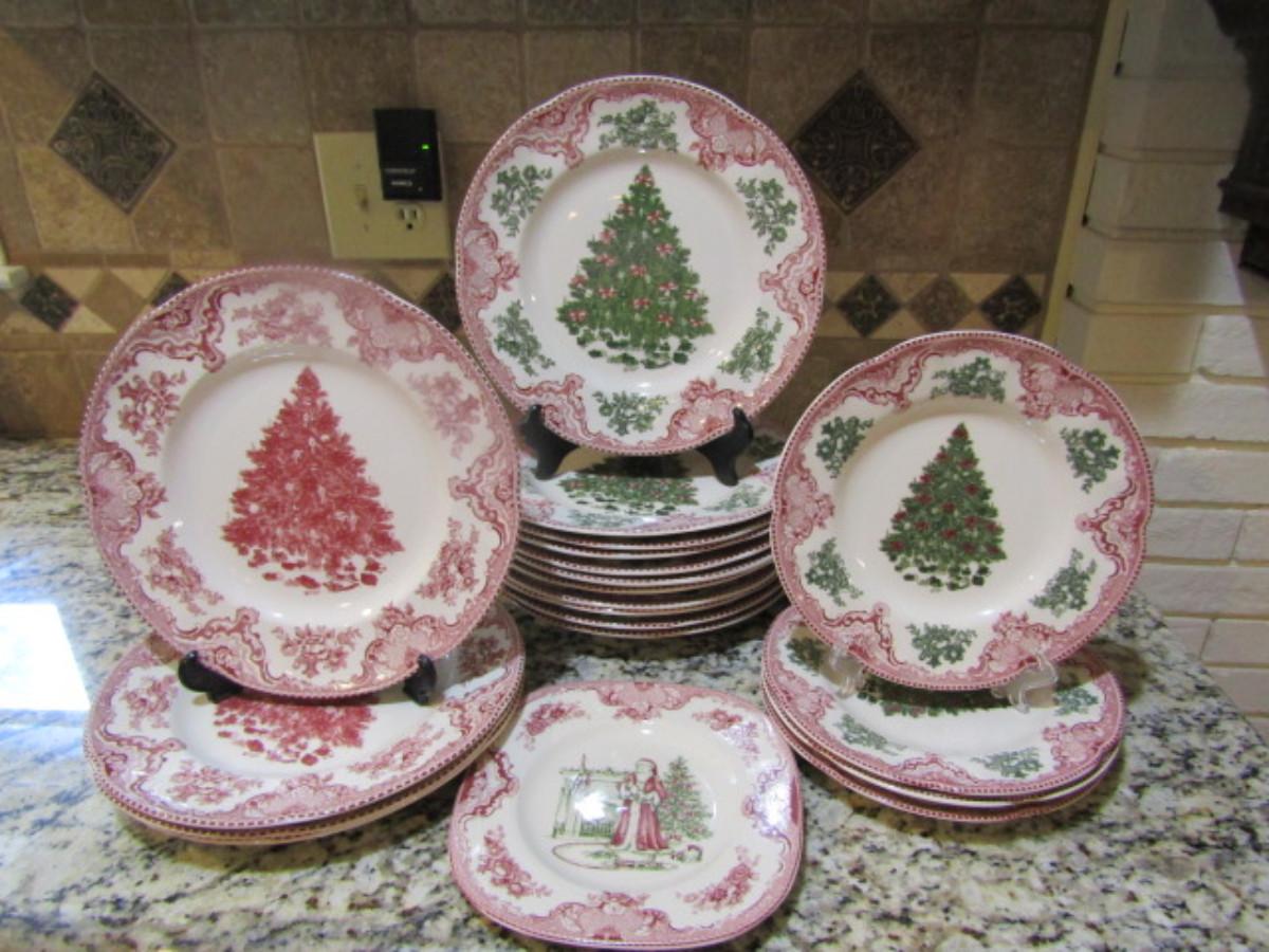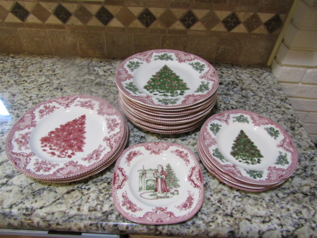 Collection of Johnson Bros Holiday Plates- Approx 20 Pieces (#9). Green tree: 11 dinner plates, 4 salad plates. Pink tree: 4 dinner plates. Santa with tree and fireplace- 1 plate (7 7/8" square)