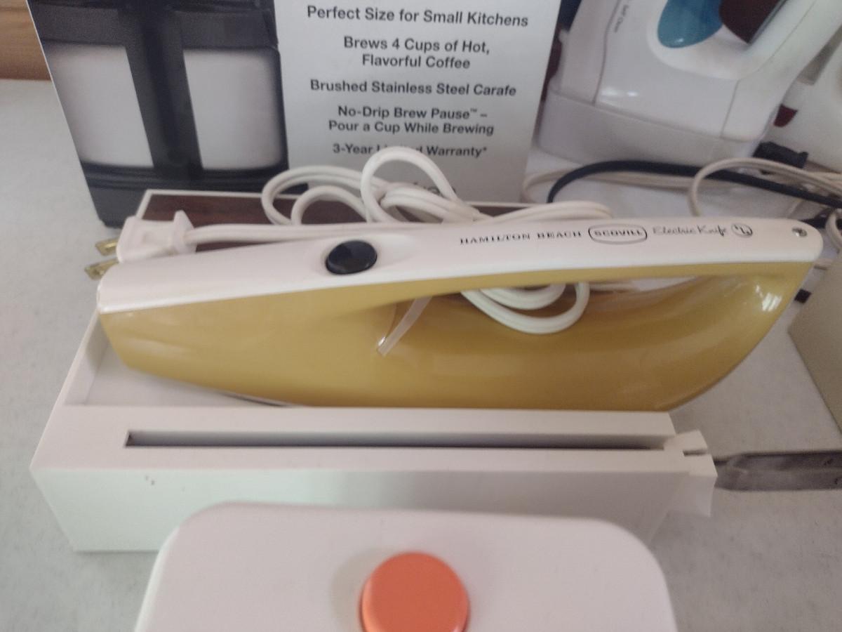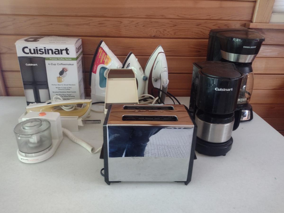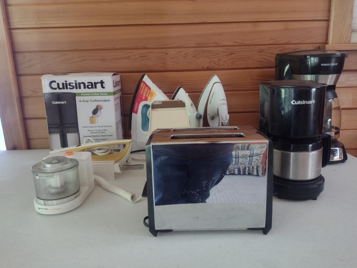 Collection of Kitchen Appliances. Includes coffee makers, irons, toaster, electric knife, small food chopper. Items are in used condition and are untested.