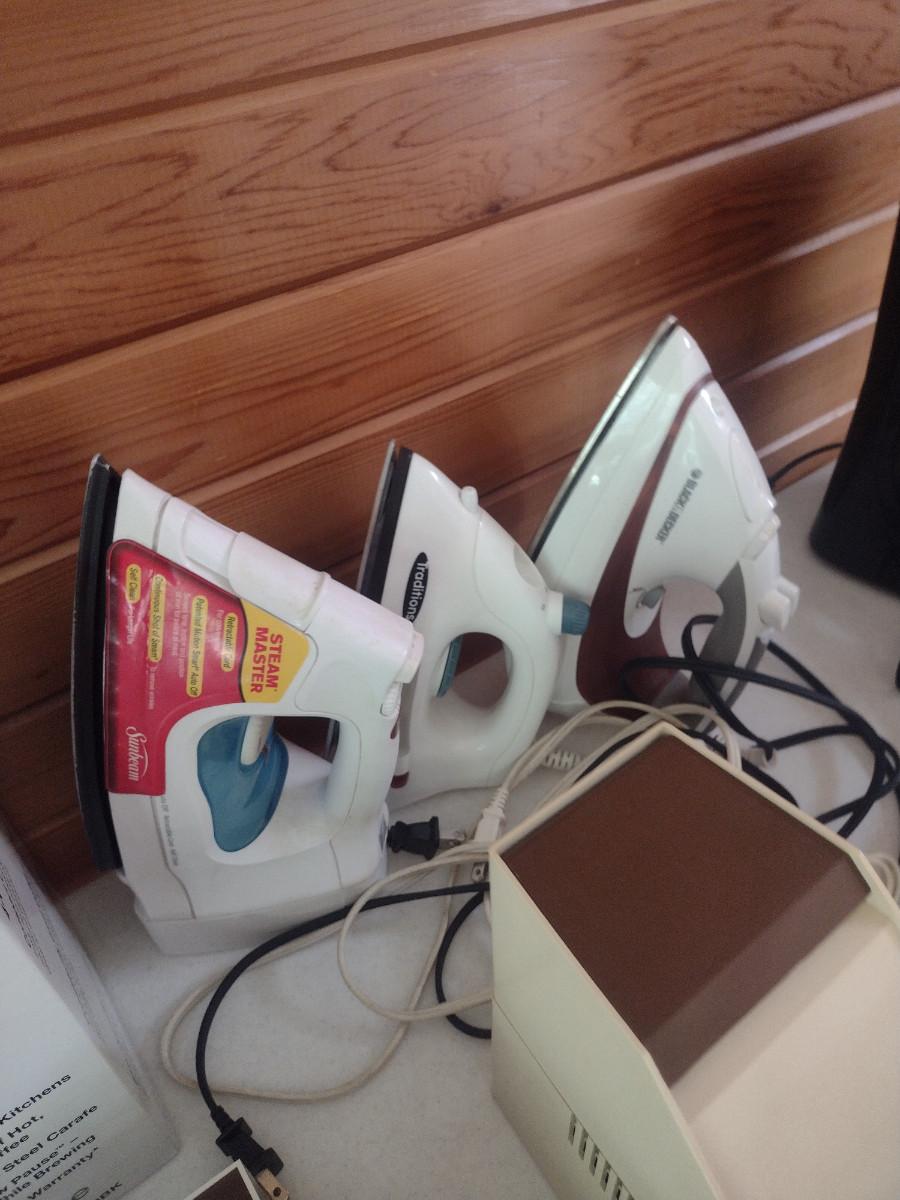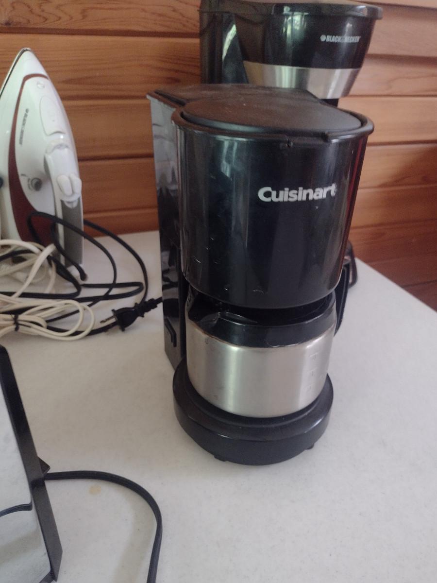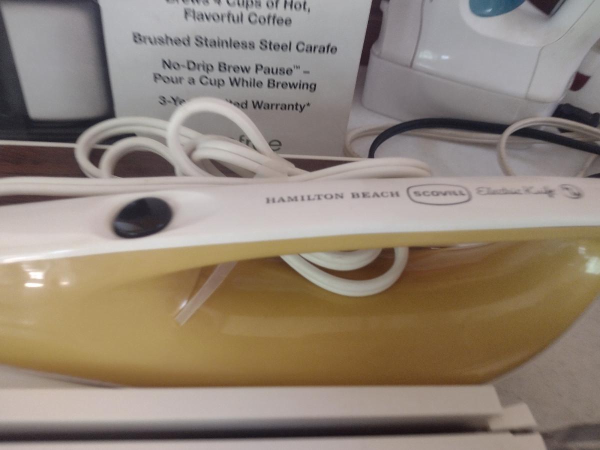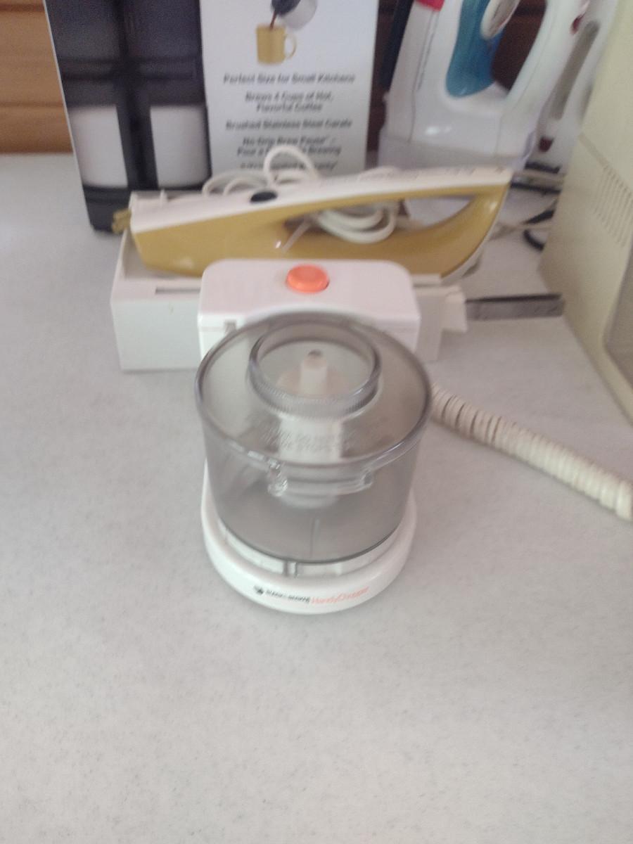 Collection of Kitchen Appliances. Includes coffee makers, irons, toaster, electric knife, small food chopper. Items are in used condition and are untested.