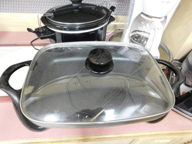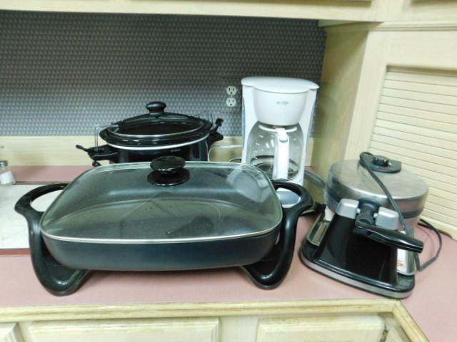 Collection of Kitchen Appliances Including Waffle Maker, Crock Pot, Coffee Maker, and Electric Skillet