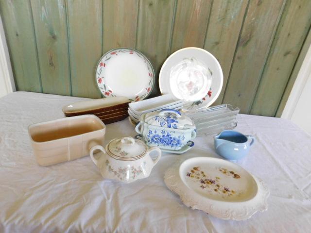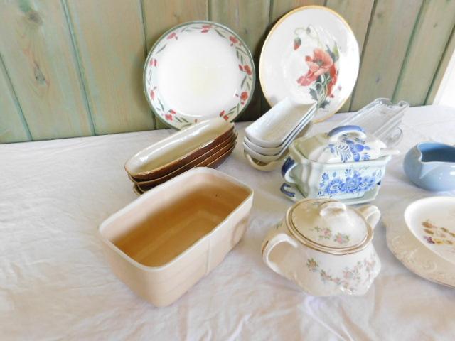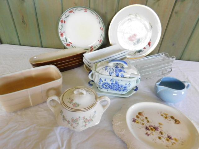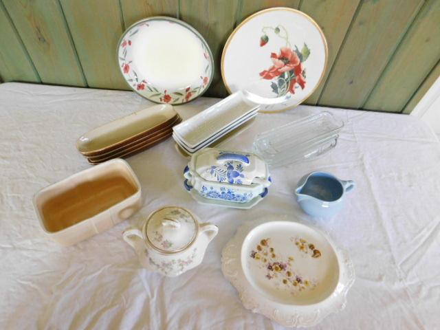 Collection of Kitchen Goods. Corn holders, sugar bowls, creamer, platters, etc. Please allow for signs of wear/chipping.