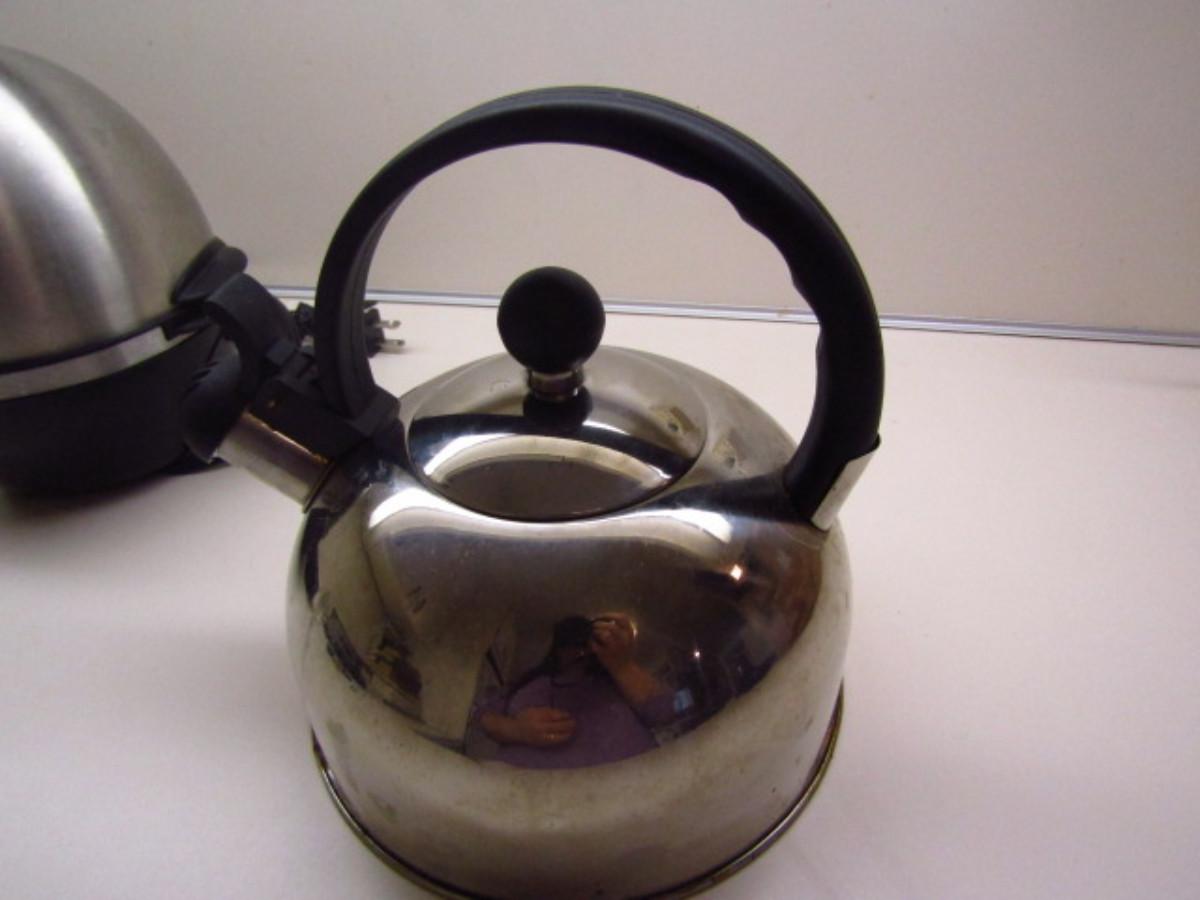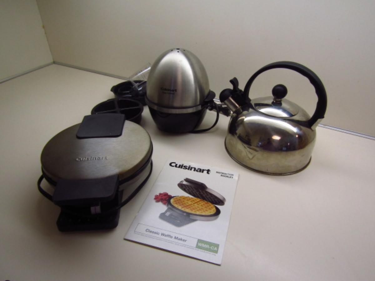 Collection of Kitchen Goods- Waffle Maker, Egg Cooker, and Stainless Tea Kettle